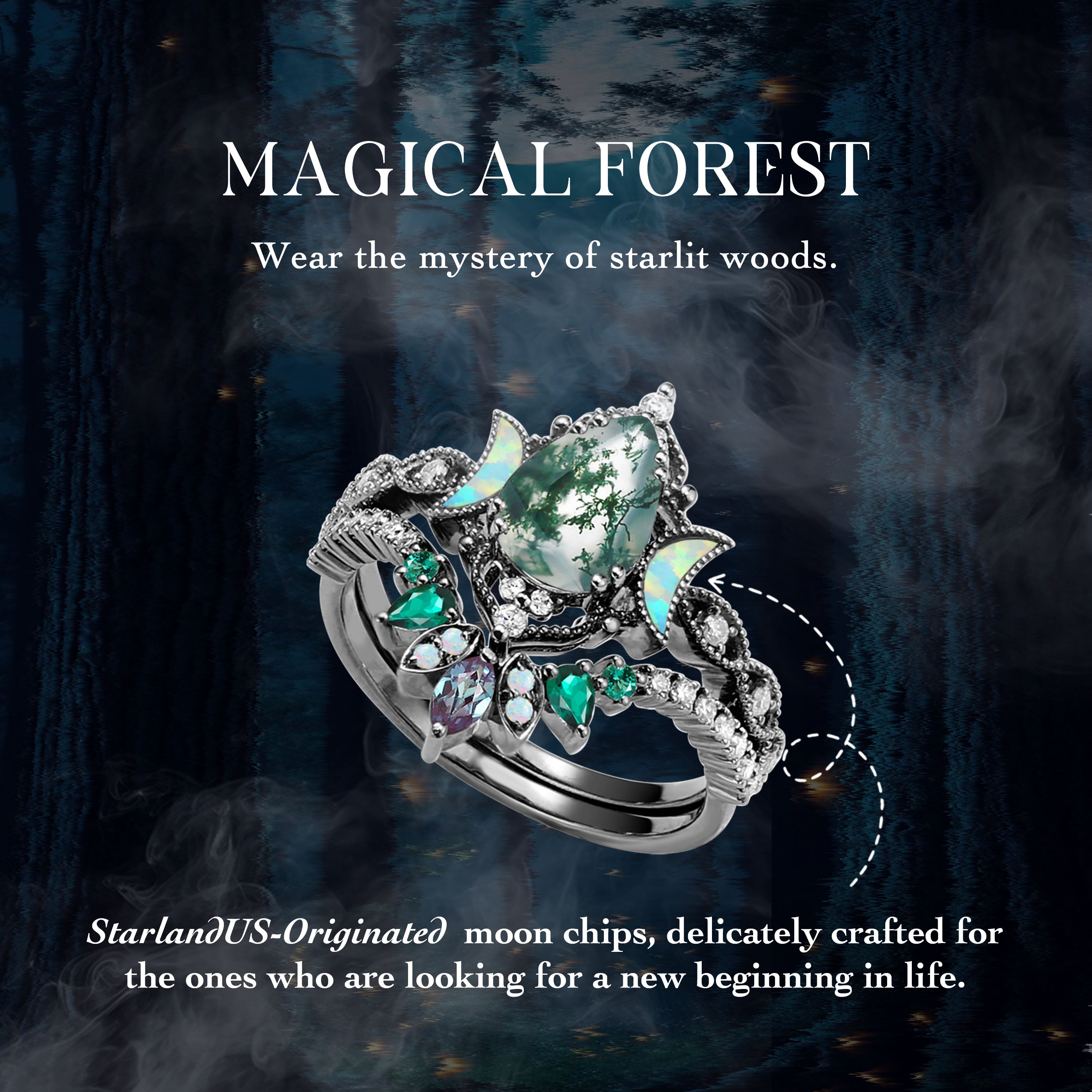 Crescent Moon | Pear Cut Moss Agate 'Ultra Galaxy' Lab Opal Black Gold Engagement Ring Set 2pcs
