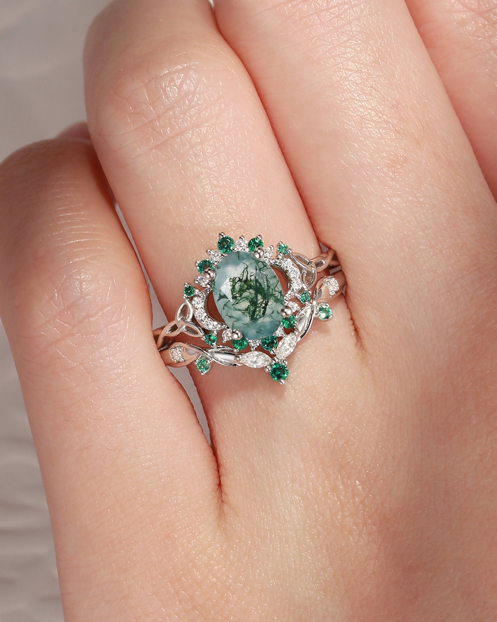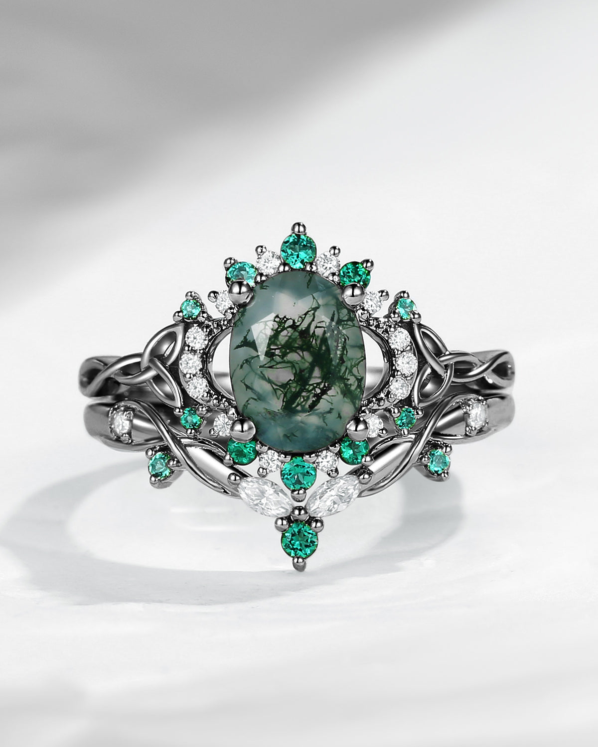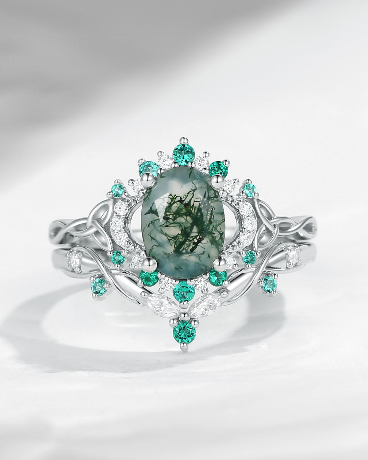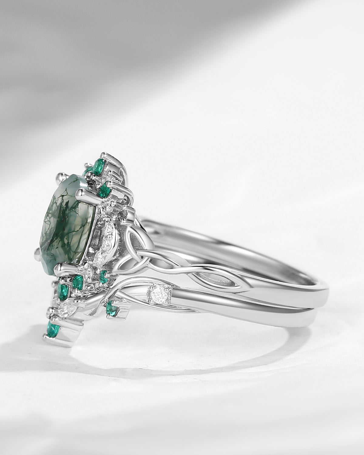 Celtic Moon | Oval Cut Moss Agate Infinity Celtic Engagement Ring Set 2pcs