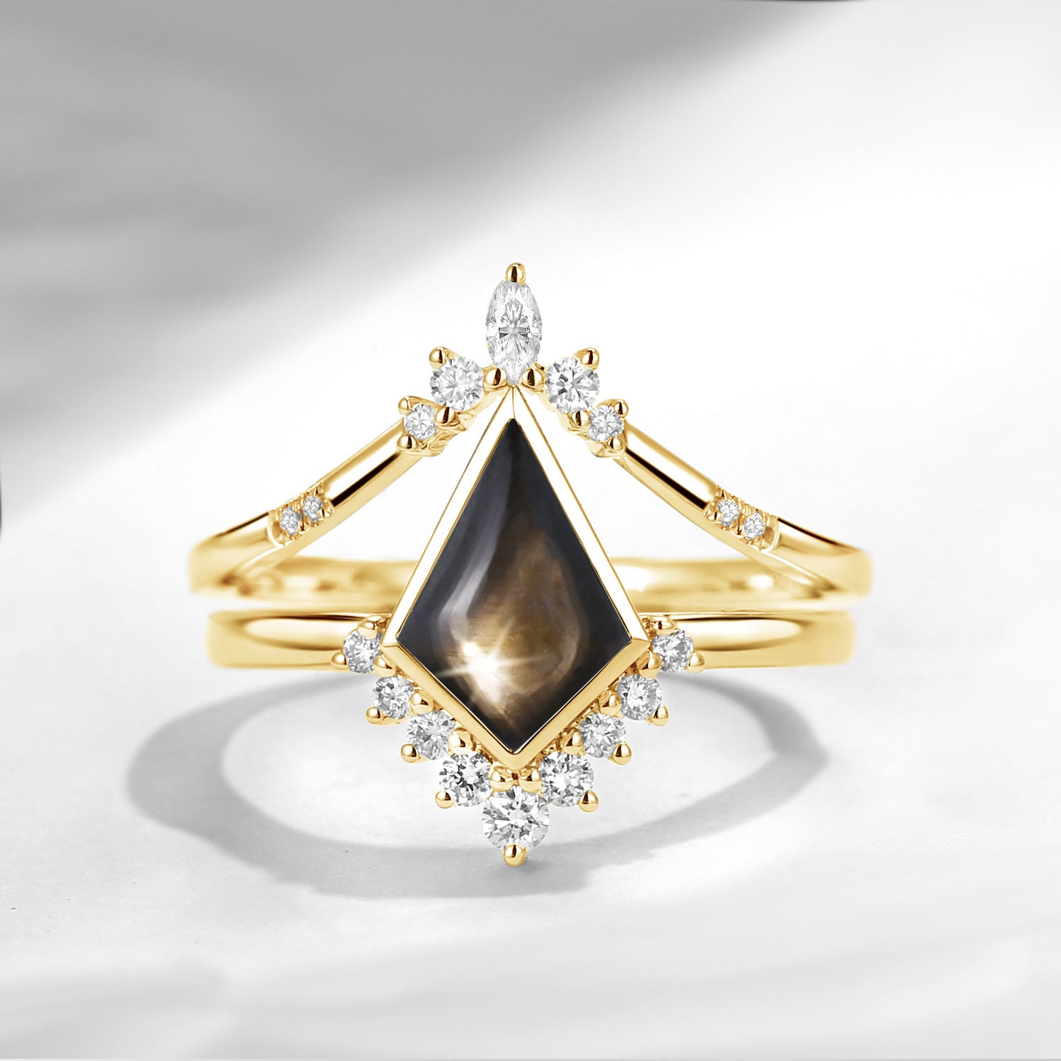 Classic Style Kite Cut Natural Black Star Sapphire Engagement Ring Set 2pcs