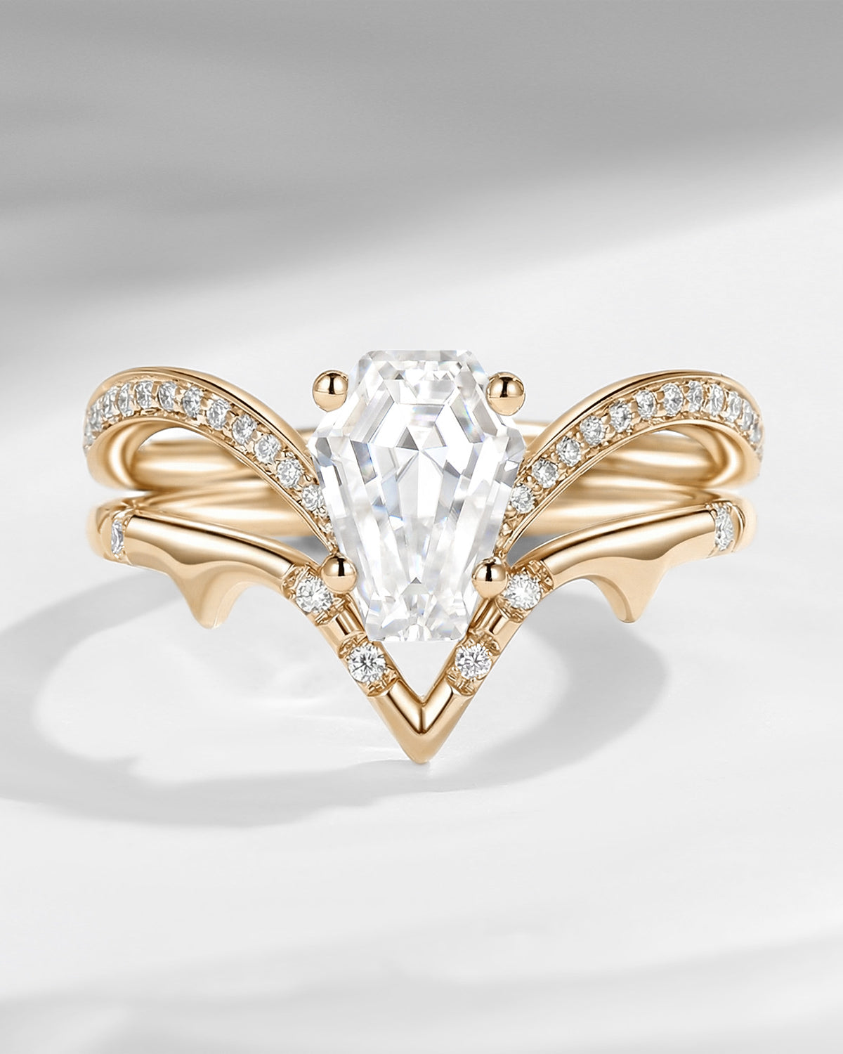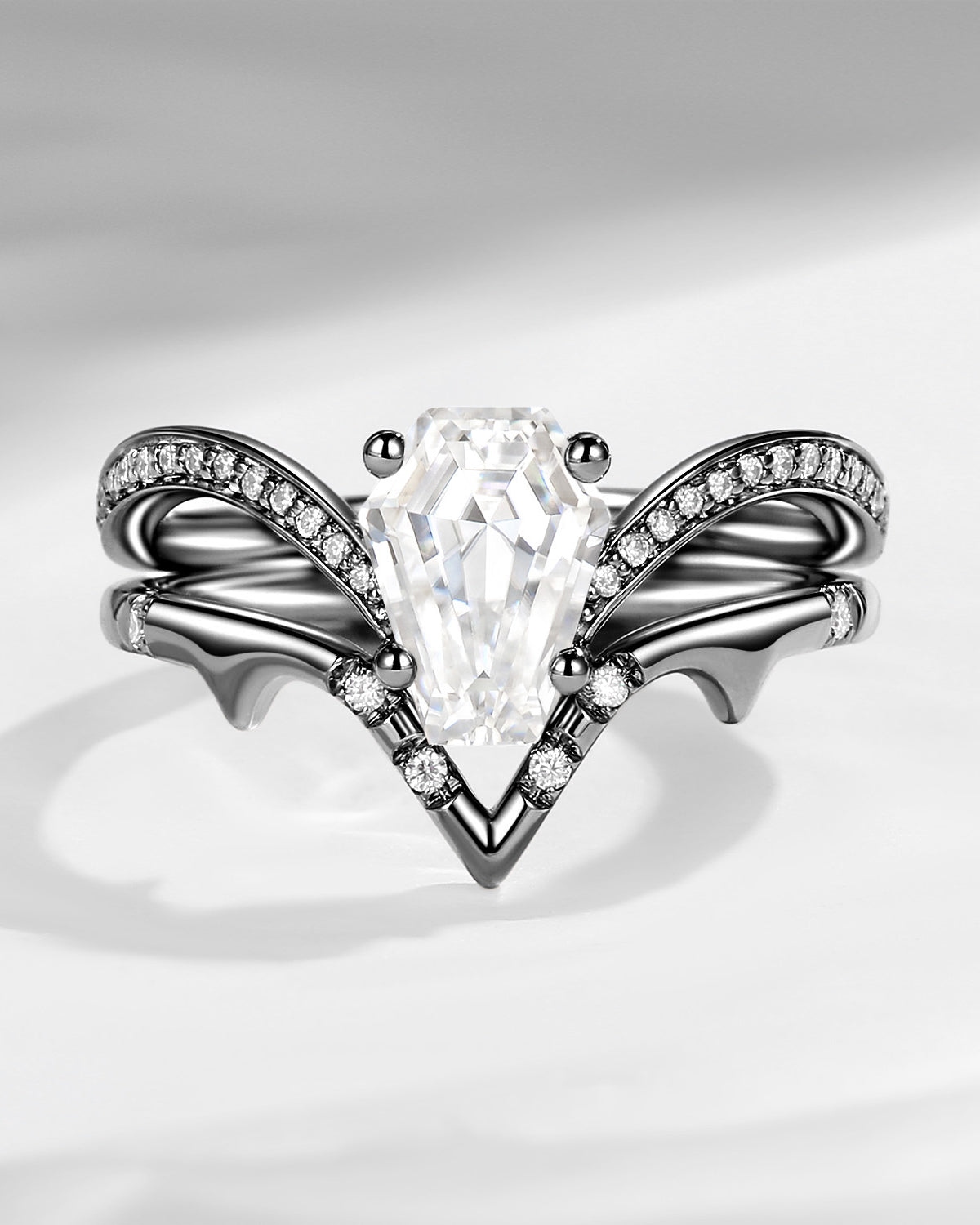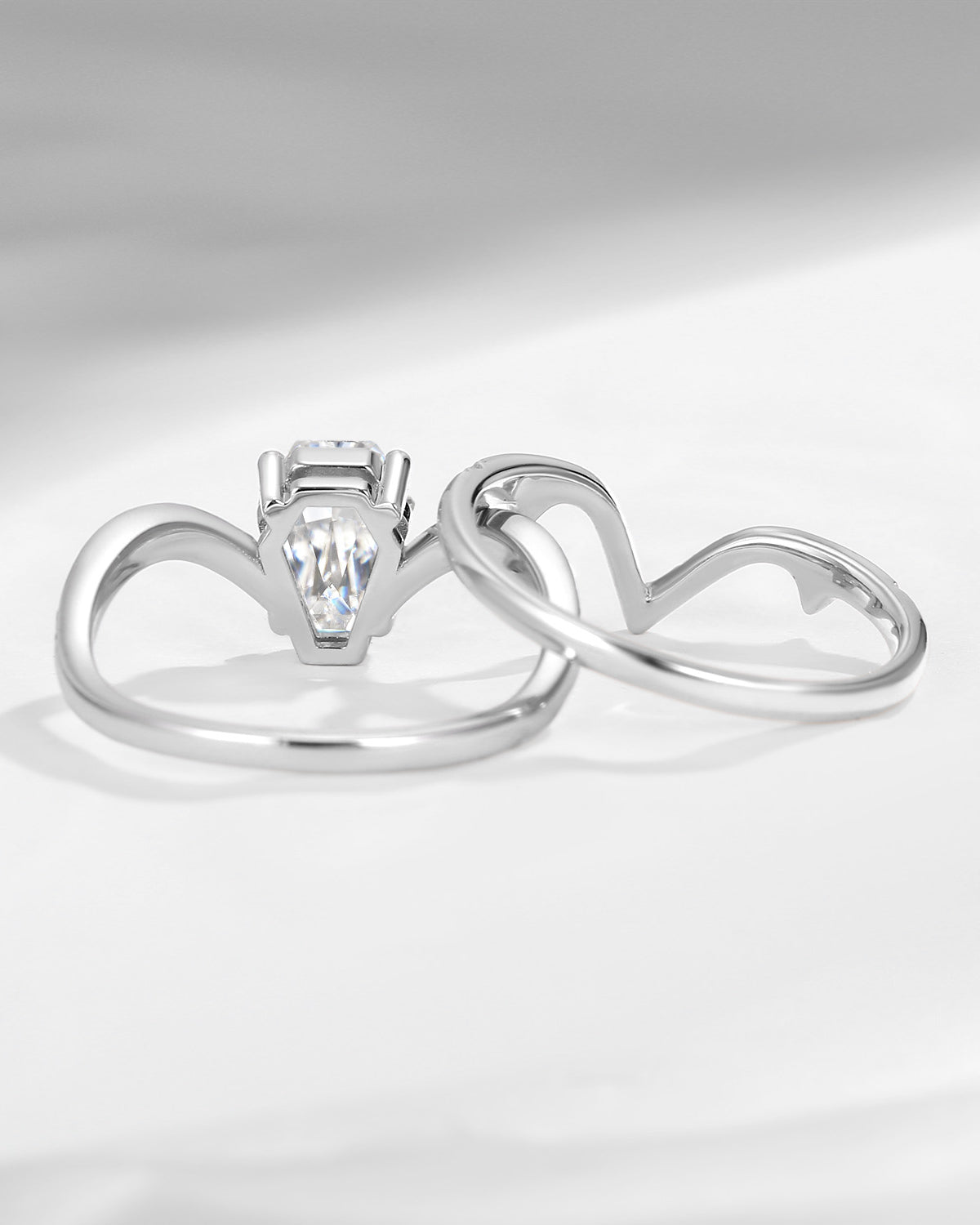 Coffin engagement ring is a unique and non-traditional choice. Coffin rings have a distinct personality and style, making the ring not only a symbol but also a fashionable expression. The coffin cut ring is especially suitable for those seeking uniqueness and innovation. Coffin cut engagement rings symbolize the eternal commitment to love, whether now or in the future, this unique ring will accompany the wearer's life - just like what they say - Till Death Do Us Apart.
