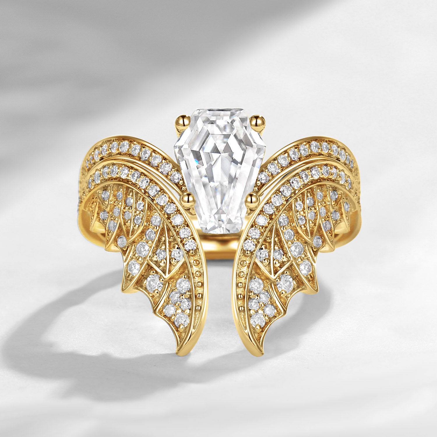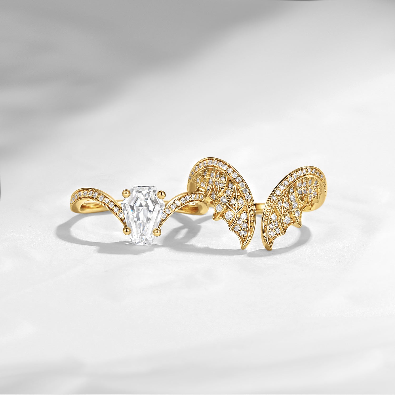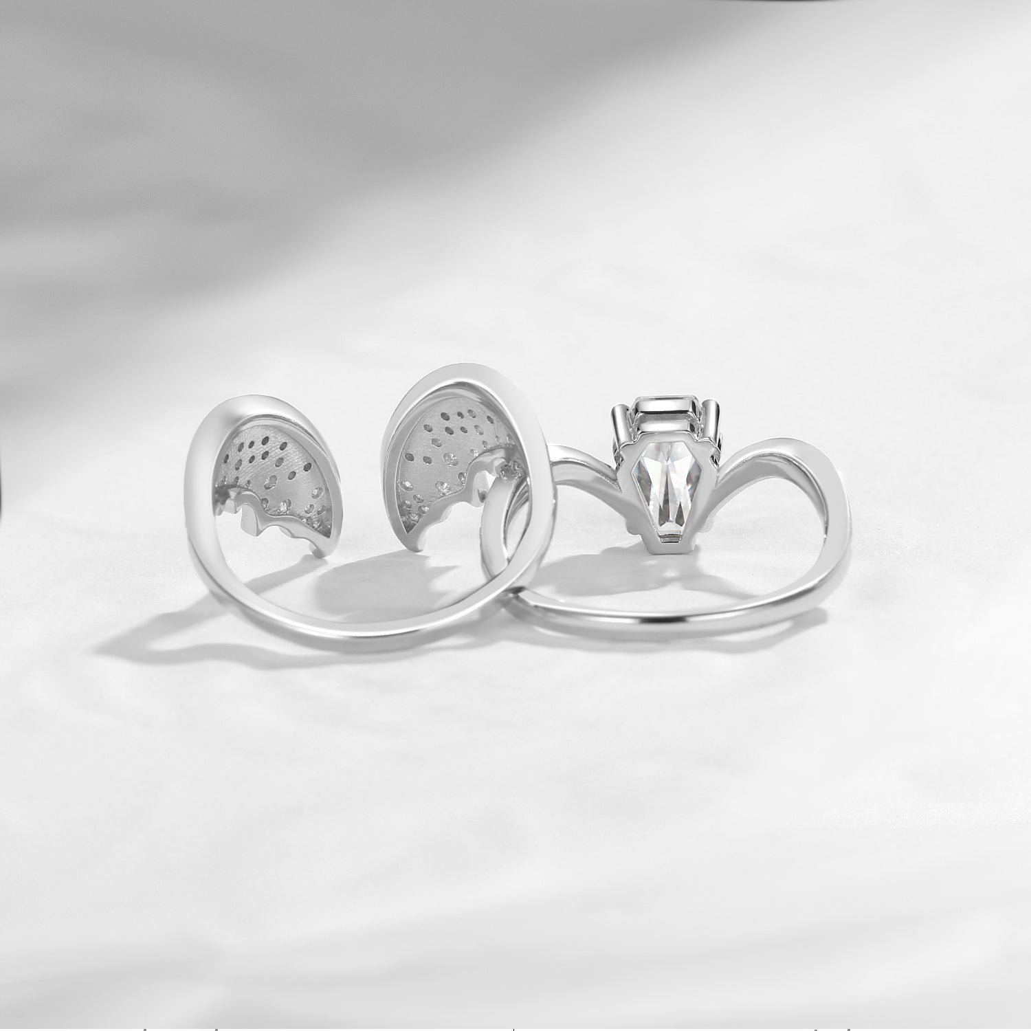 Coffin Cut Moissanite Vintage White Gold Bridal Set 2pcs - Bat Ring