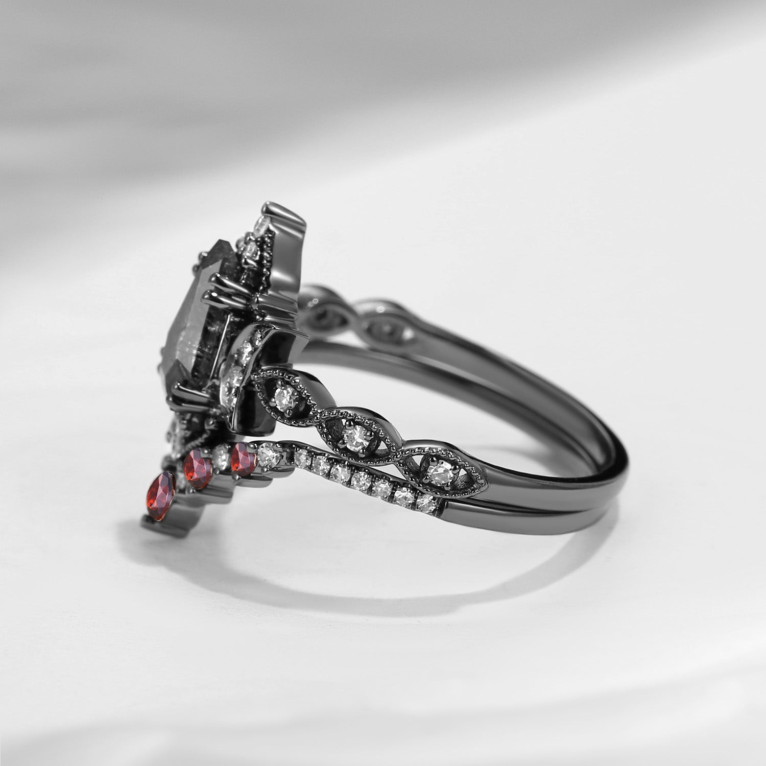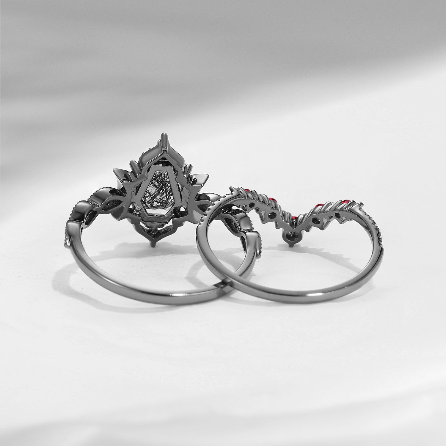 Crescent Moon | Coffin Cut Black Rutilated Quartz Garnet 'Black Statement' Ring Set 2pcs
