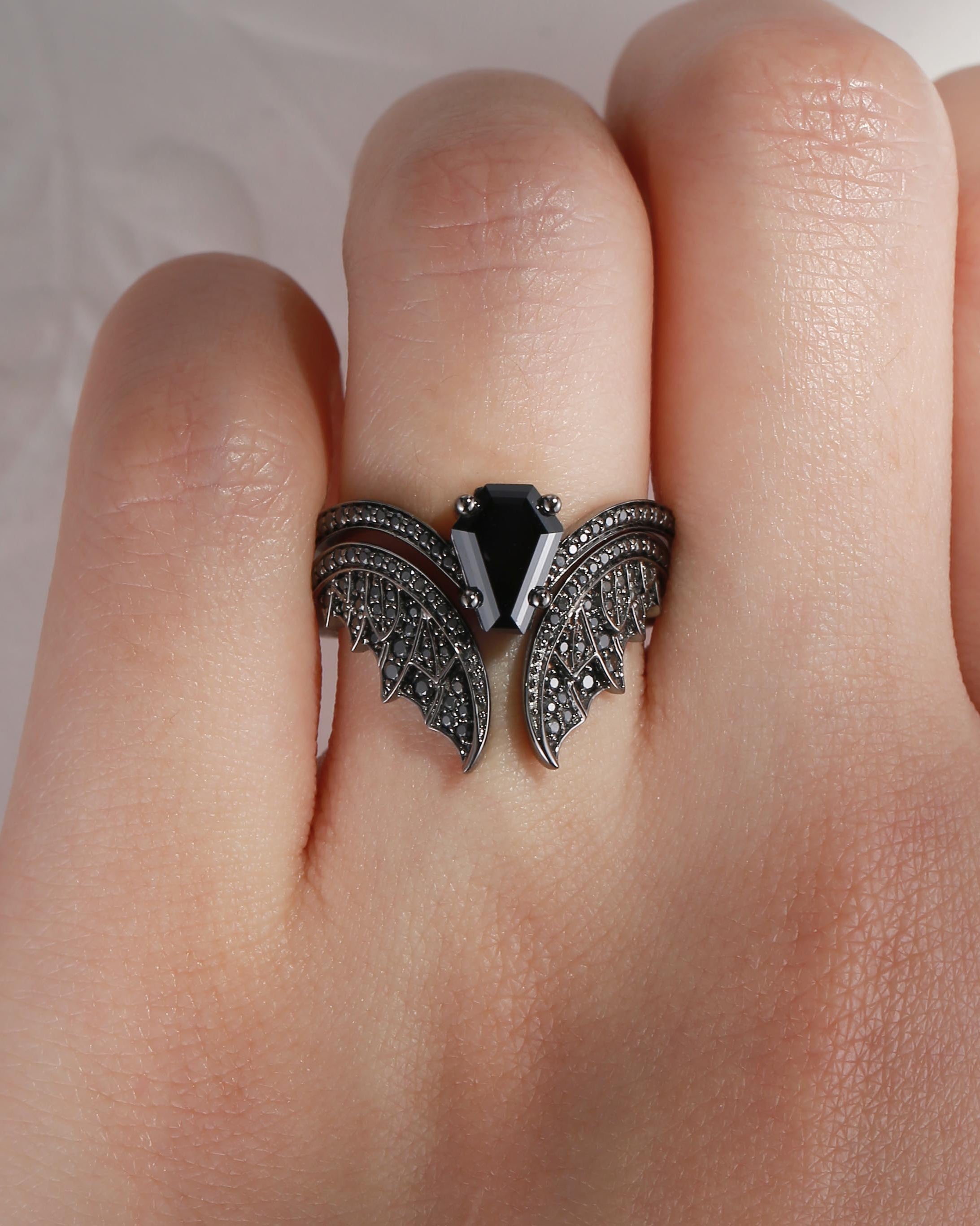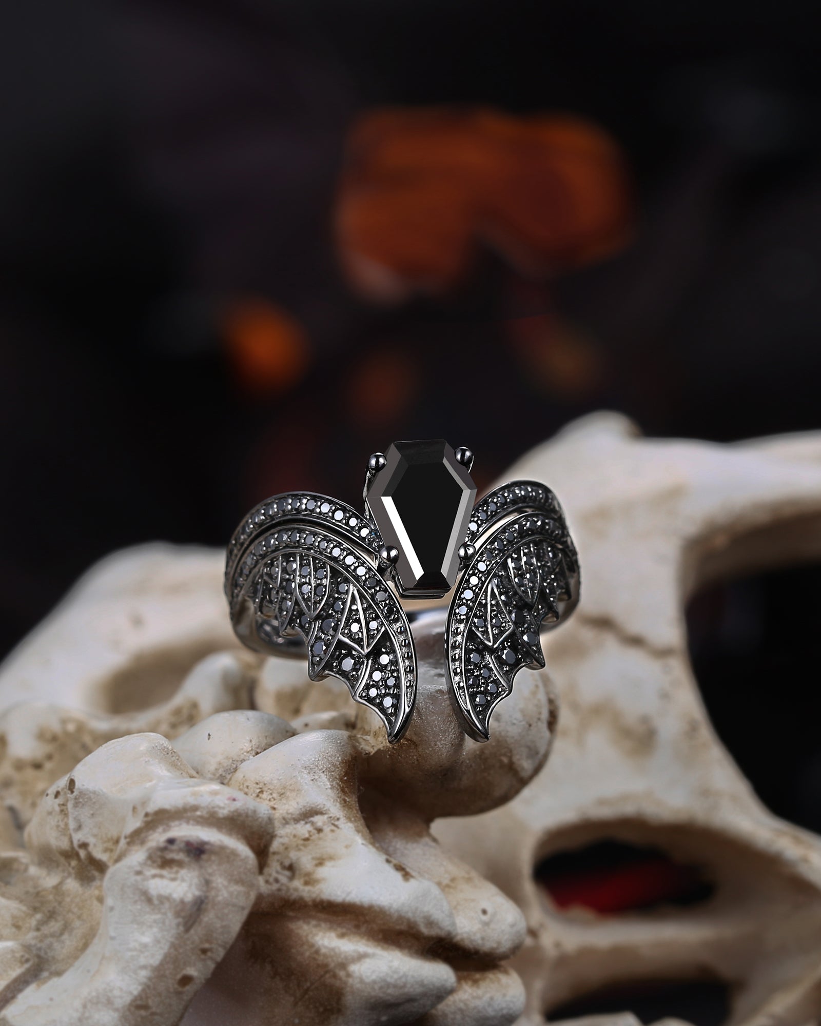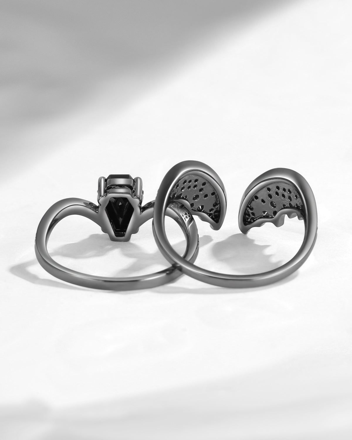 Coffin Cut Black Moissanite Vintage Black Gold Bridal Set 2pcs - Bat Ring