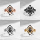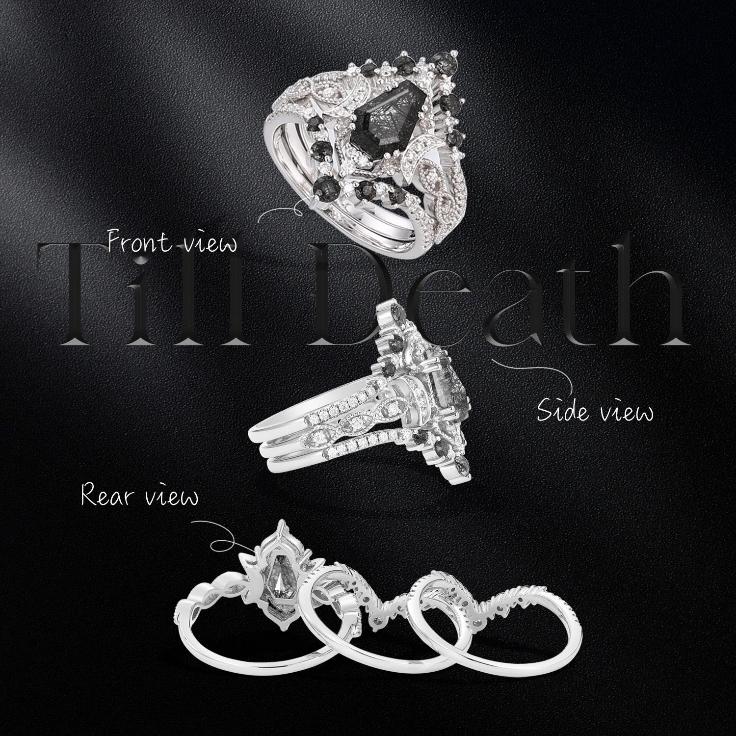 Crescent Moon | Coffin Cut Black Rutilated Quartz Ring 3pcs - Till Death Do Us Part Moon Engagement Ring Unique Engagement Ring