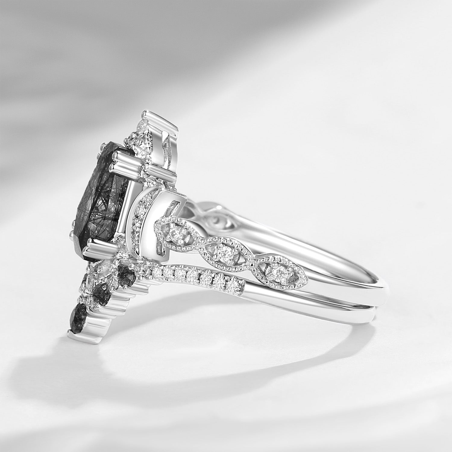 Crescent Moon | Pear Shaped Black Rutilated Quartz Engagement Ring Set 2pcs 18k - Waning Moon