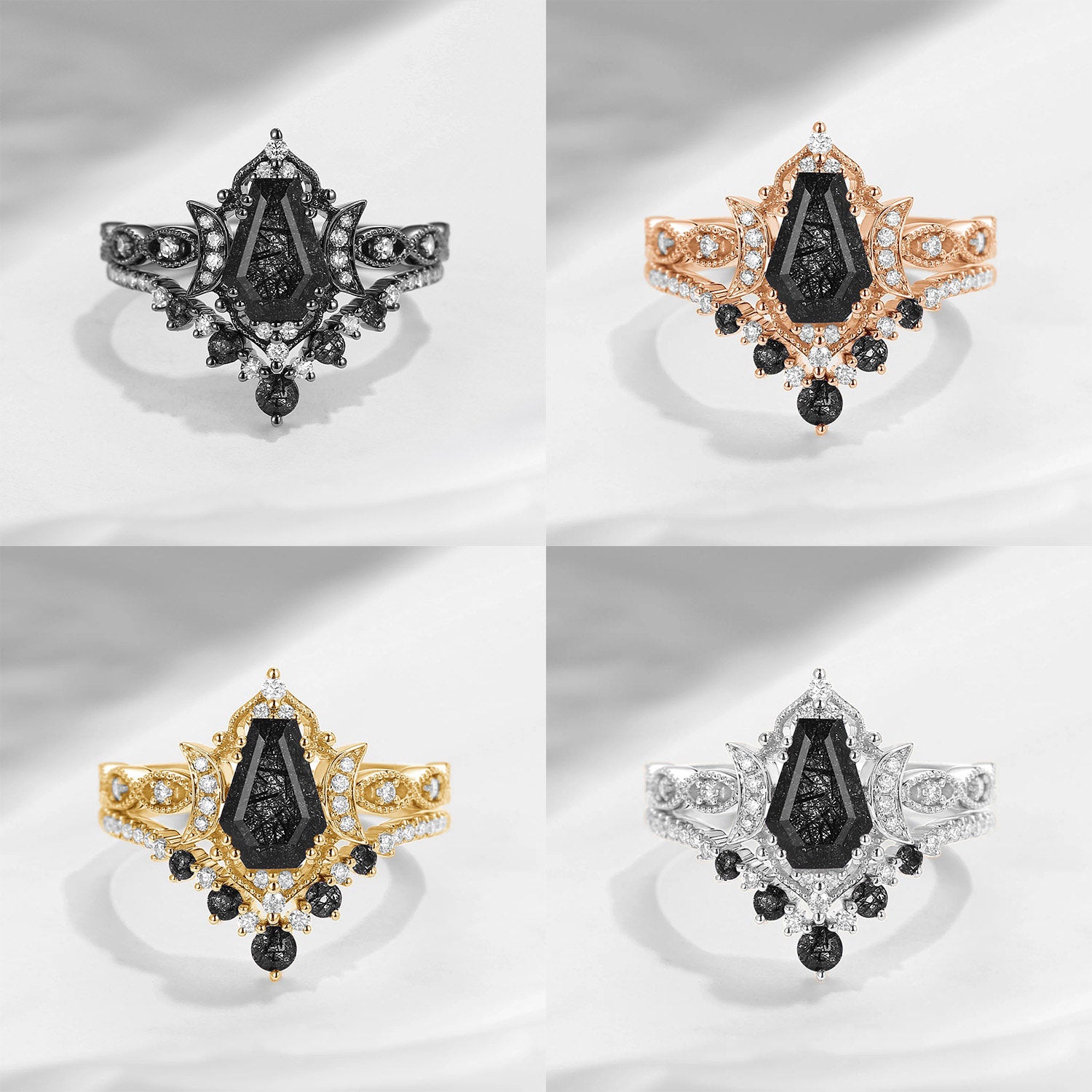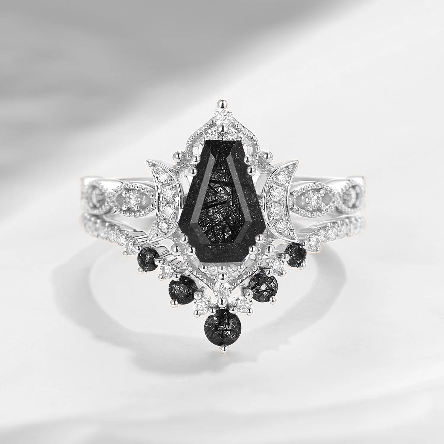Crescent Moon | Coffin Cut Black Rutilated Quartz 'Till Death Do Us Part' Ring Set 2pcs
