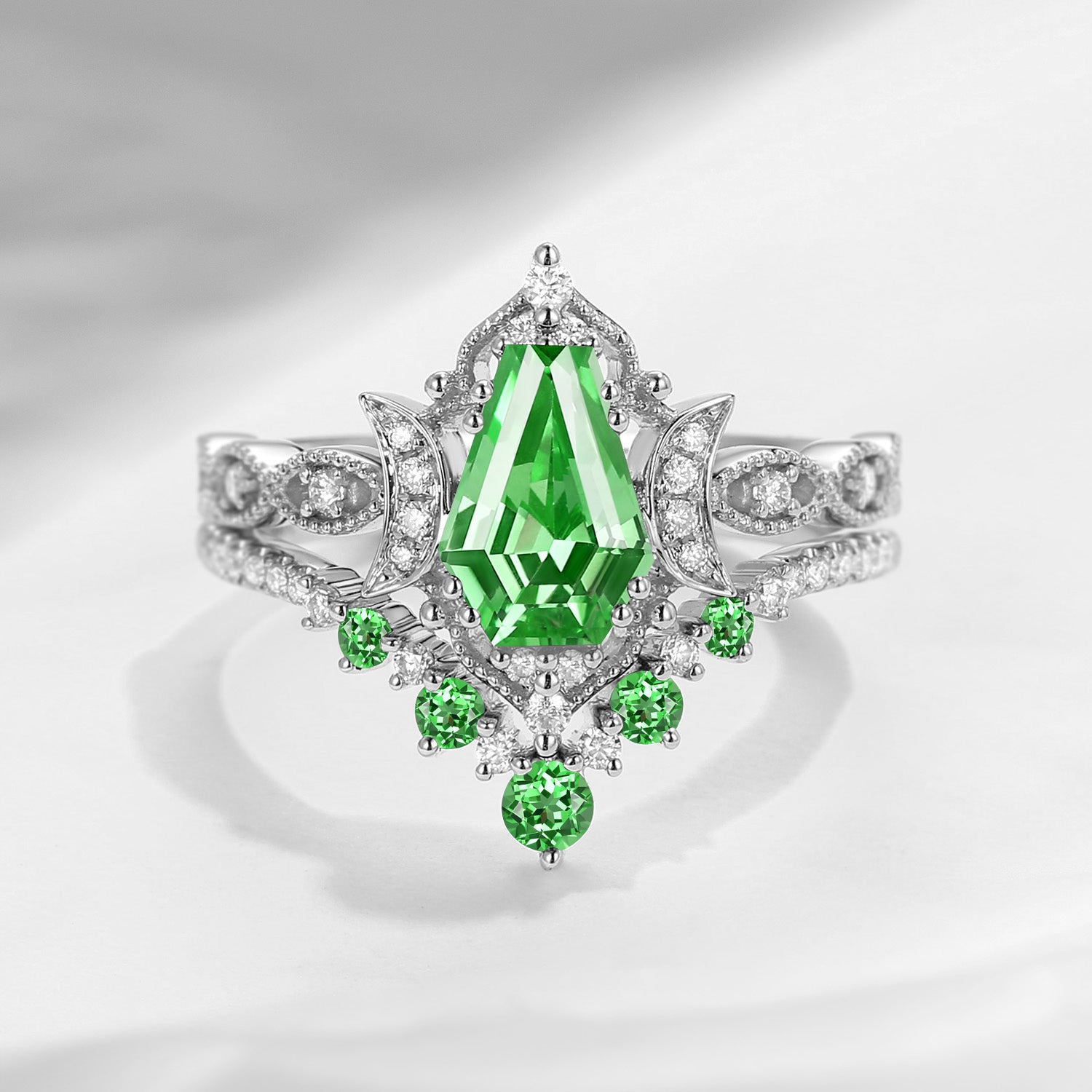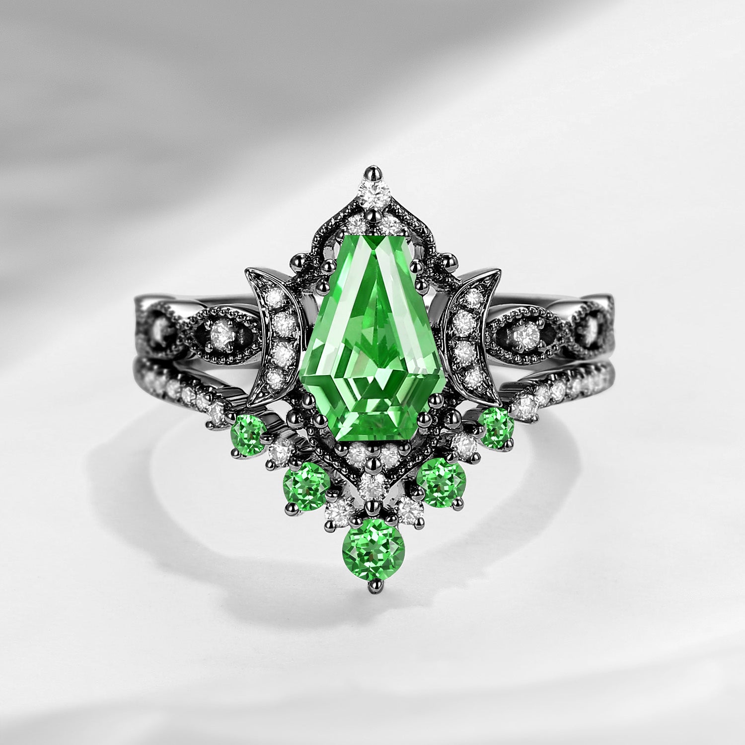 Crescent Moon | Coffin Cut Lab Tsavorite 'Till Death Do Us Part' Engagement Ring Set 2pcs
