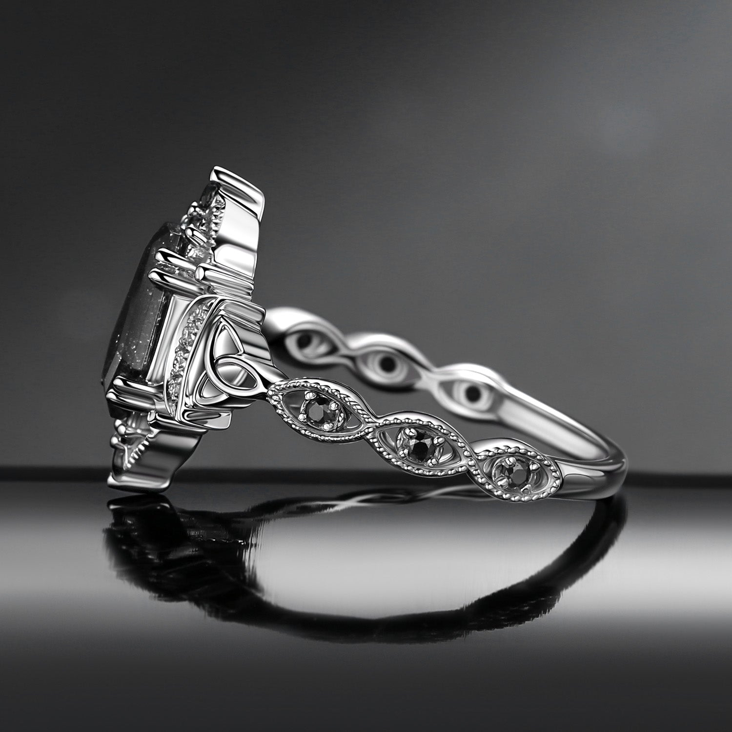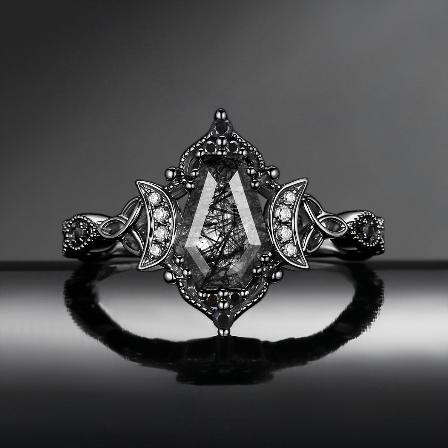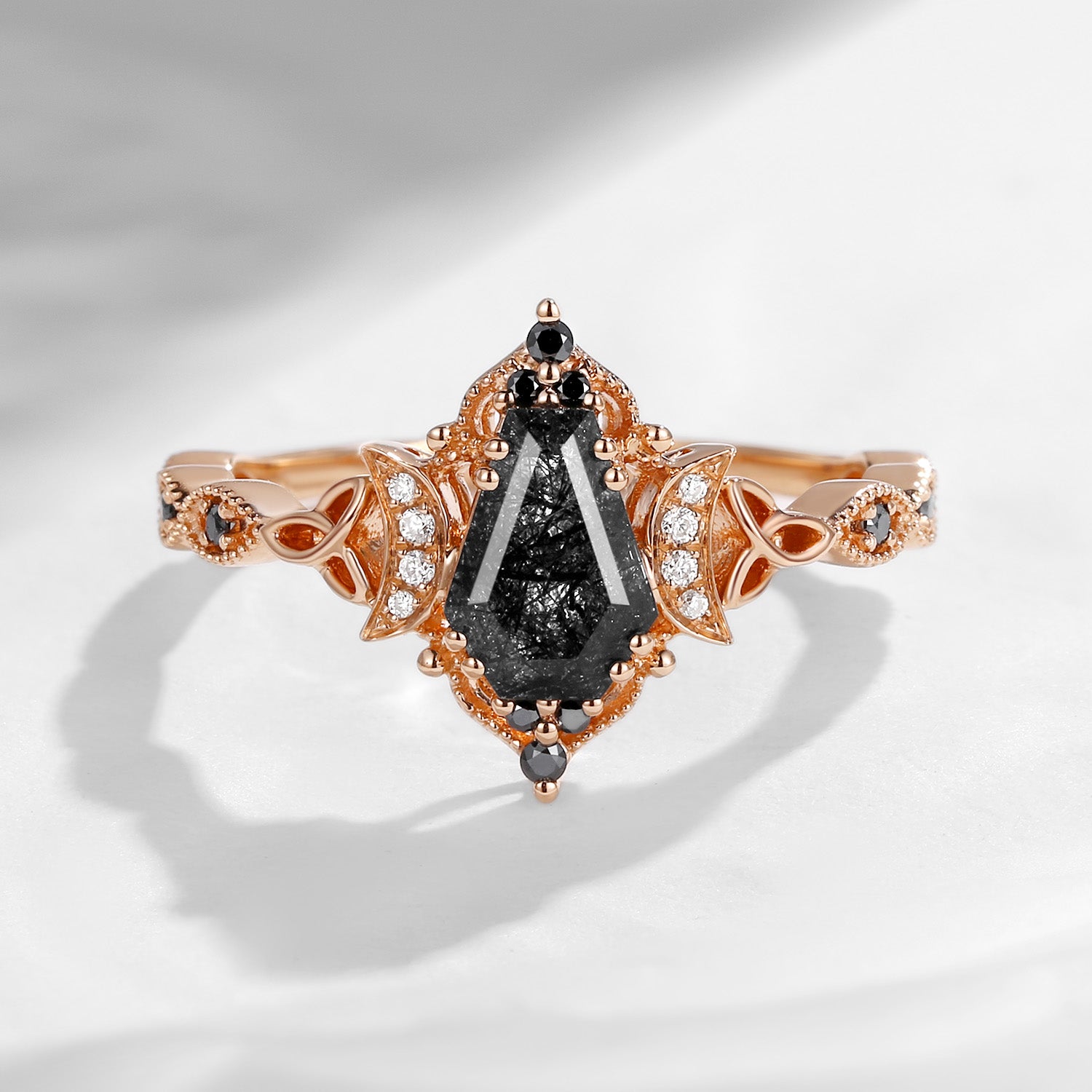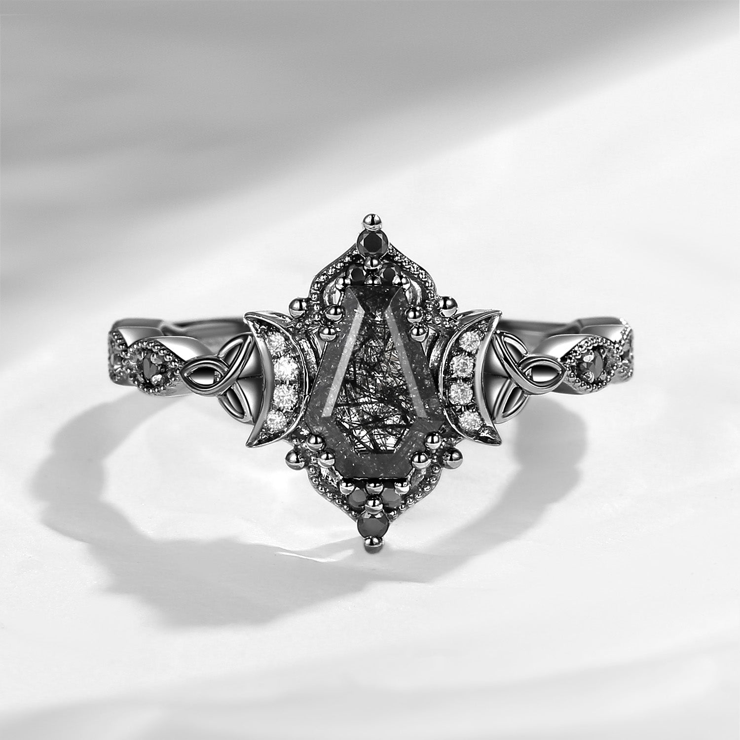 Crescent Moon | Unique Coffin Black Rutilated Quartz Infinity Celtic Engagement Ring
