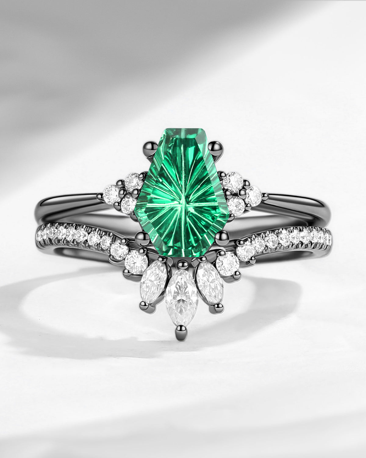 Firework Cut Lab Emerald Coffin Black Gold Bridal Set 2pcs - Bat Ring