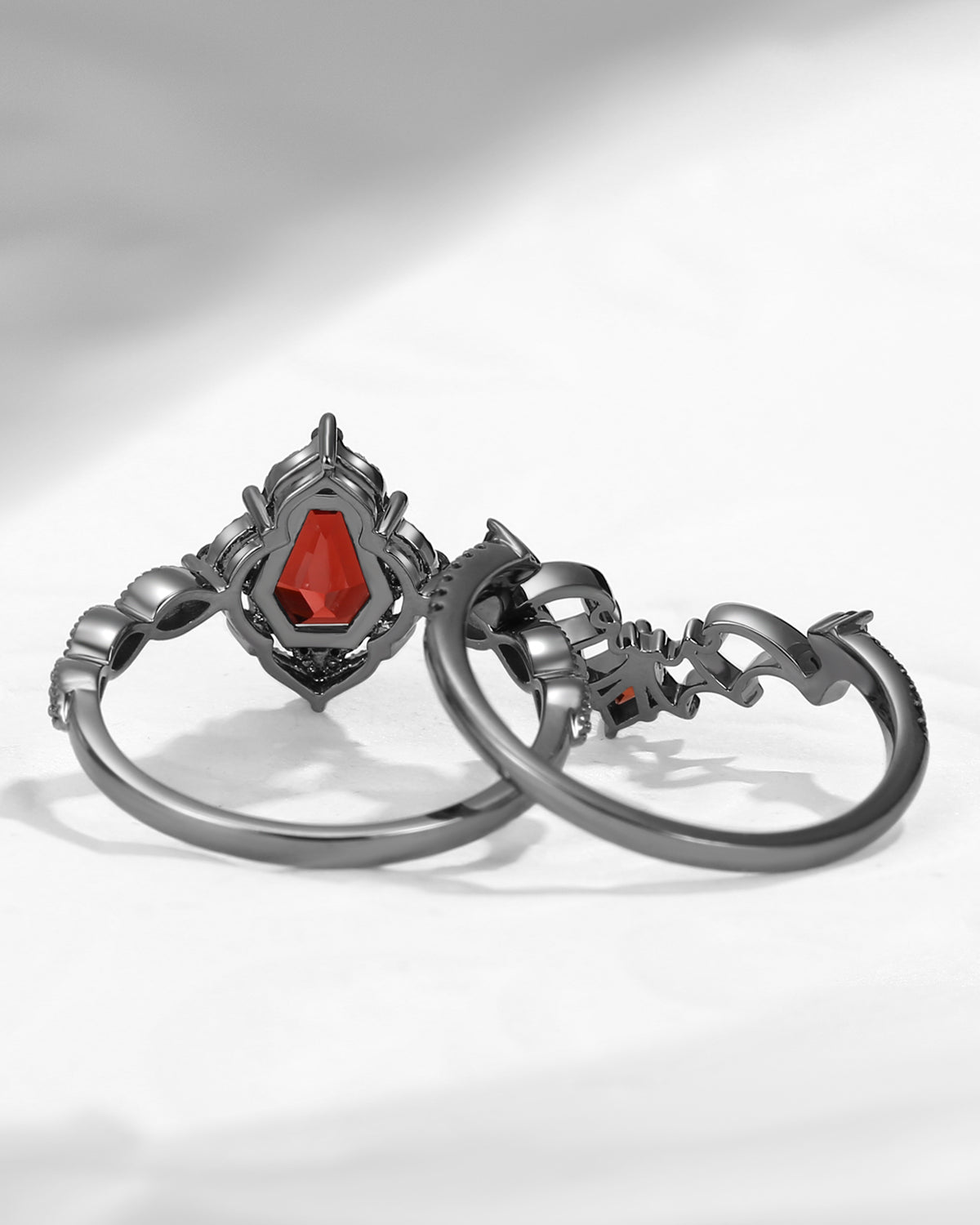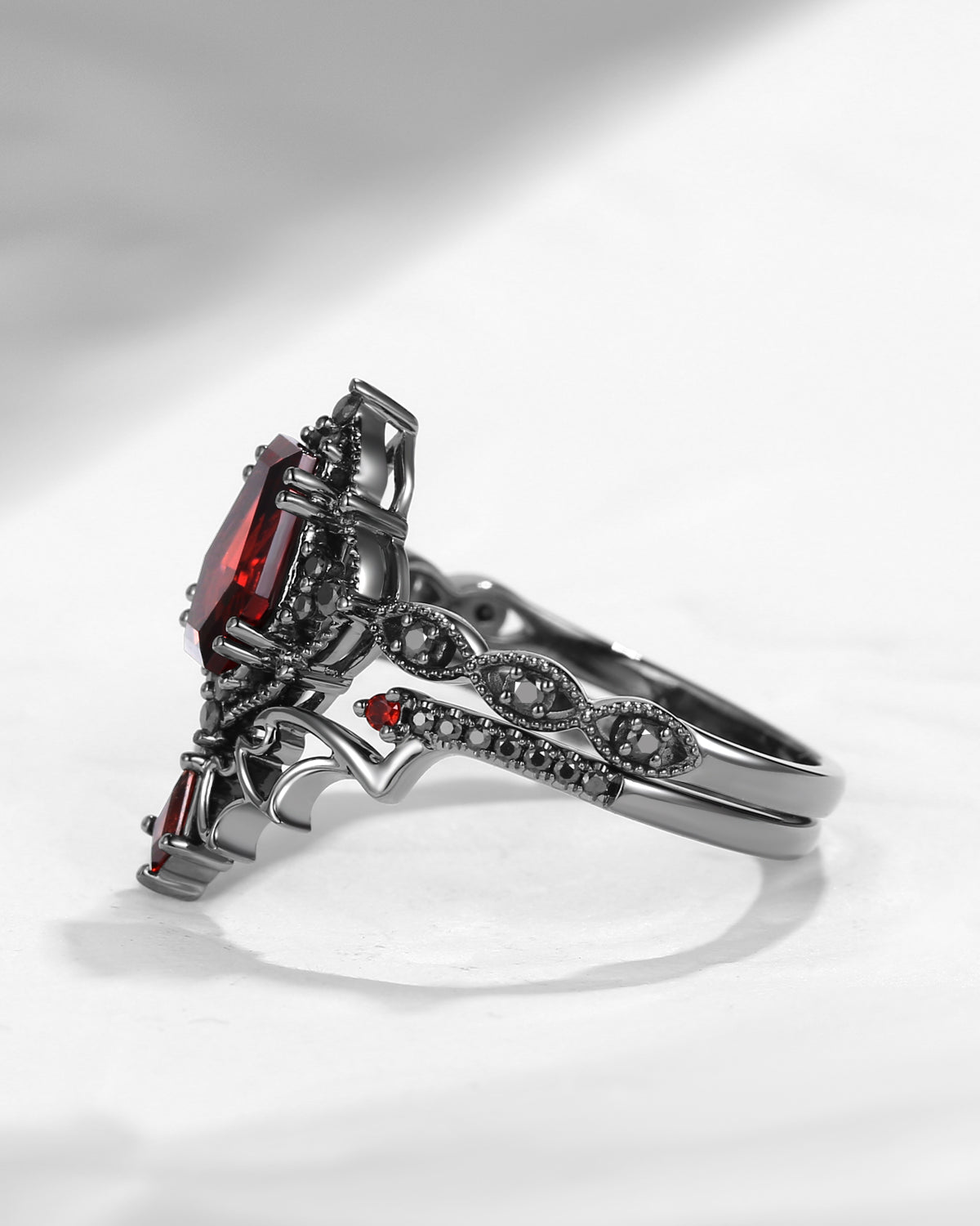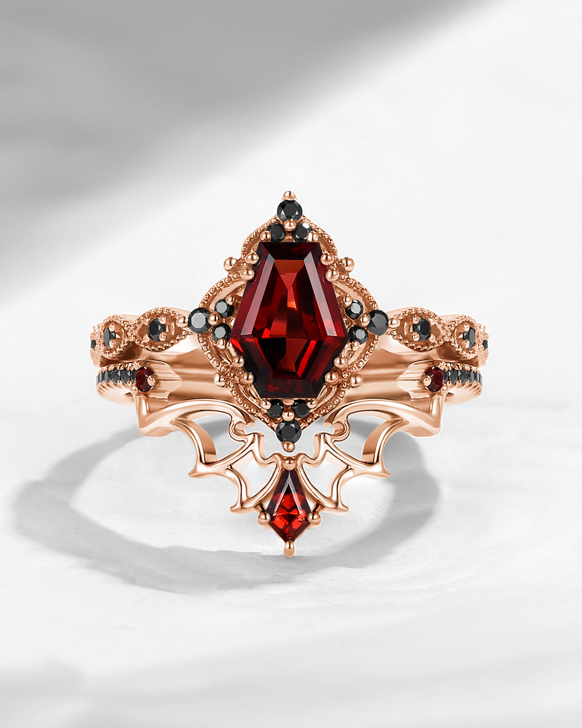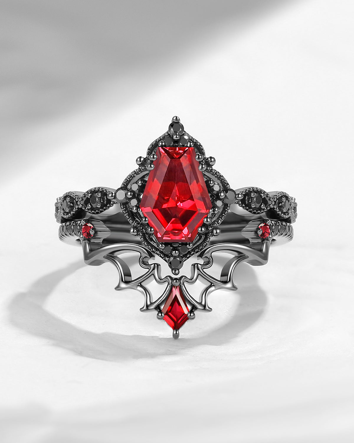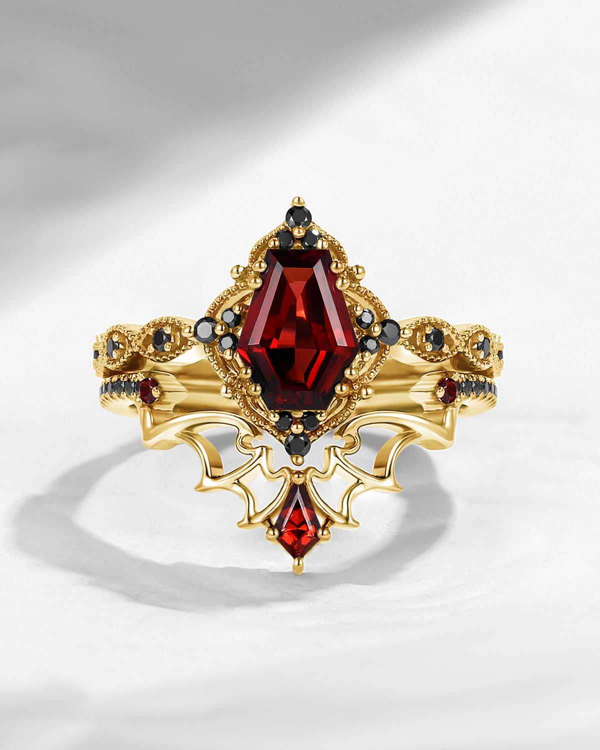Gothic Inspired 'Bat Romance' Coffin Shaped Garnet Black Gold Engagement Ring Set 2pcs