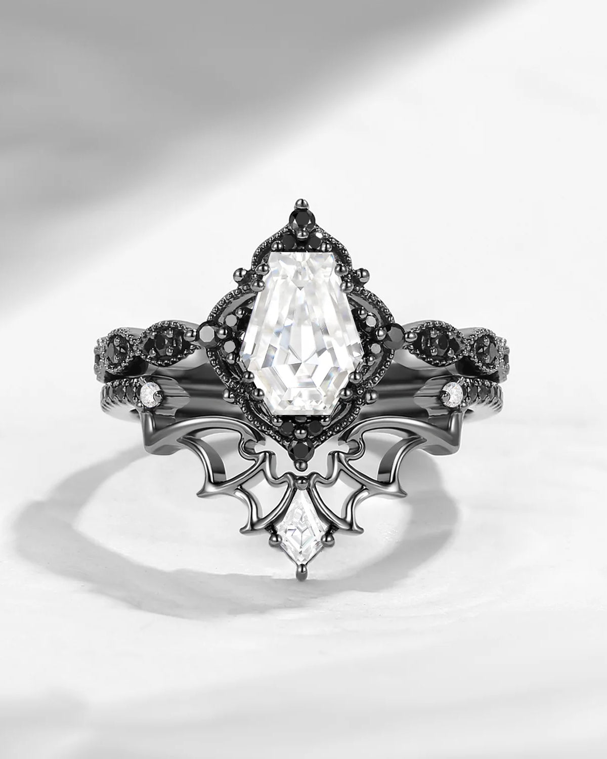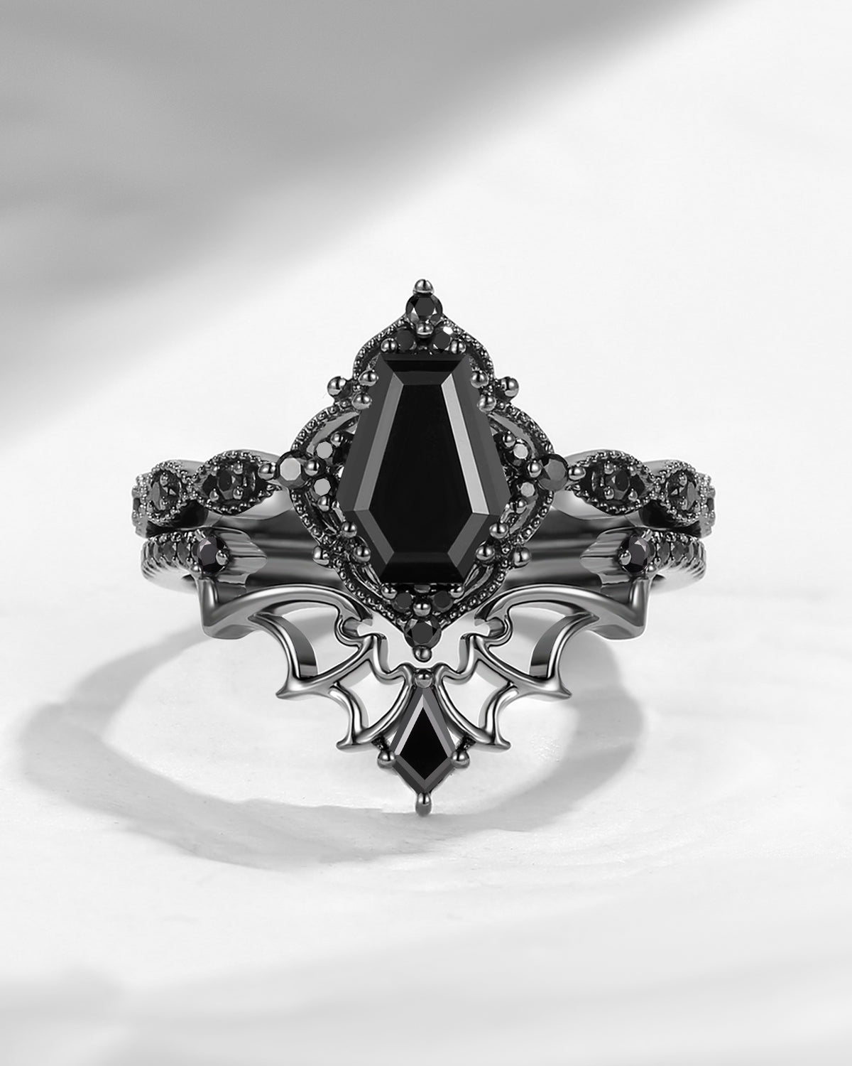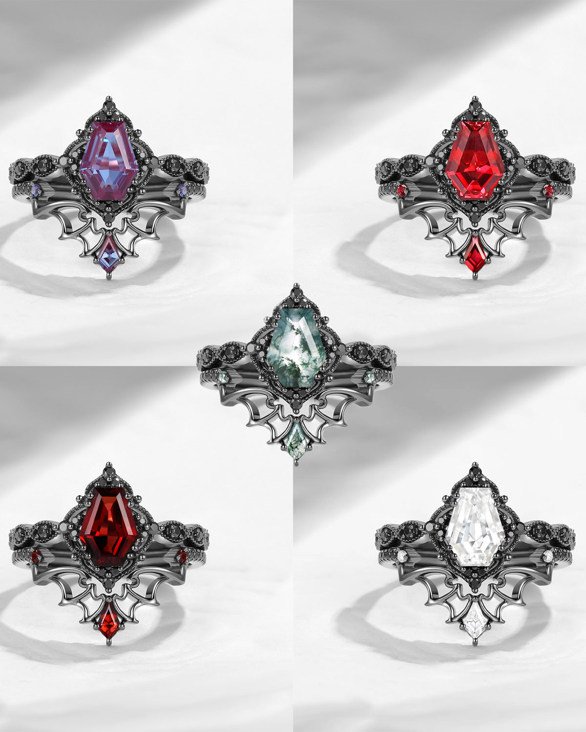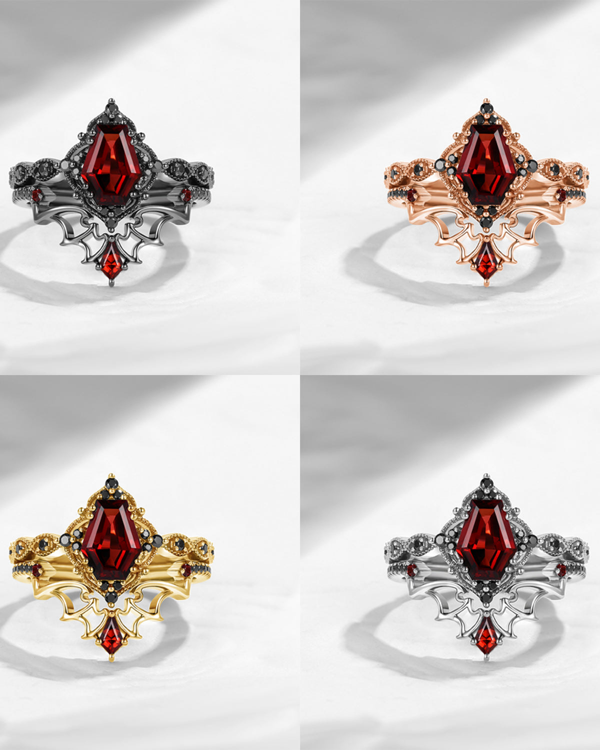 Gothic Inspired 'Bat Romance' Coffin Shaped Garnet Black Gold Engagement Ring Set 2pcs