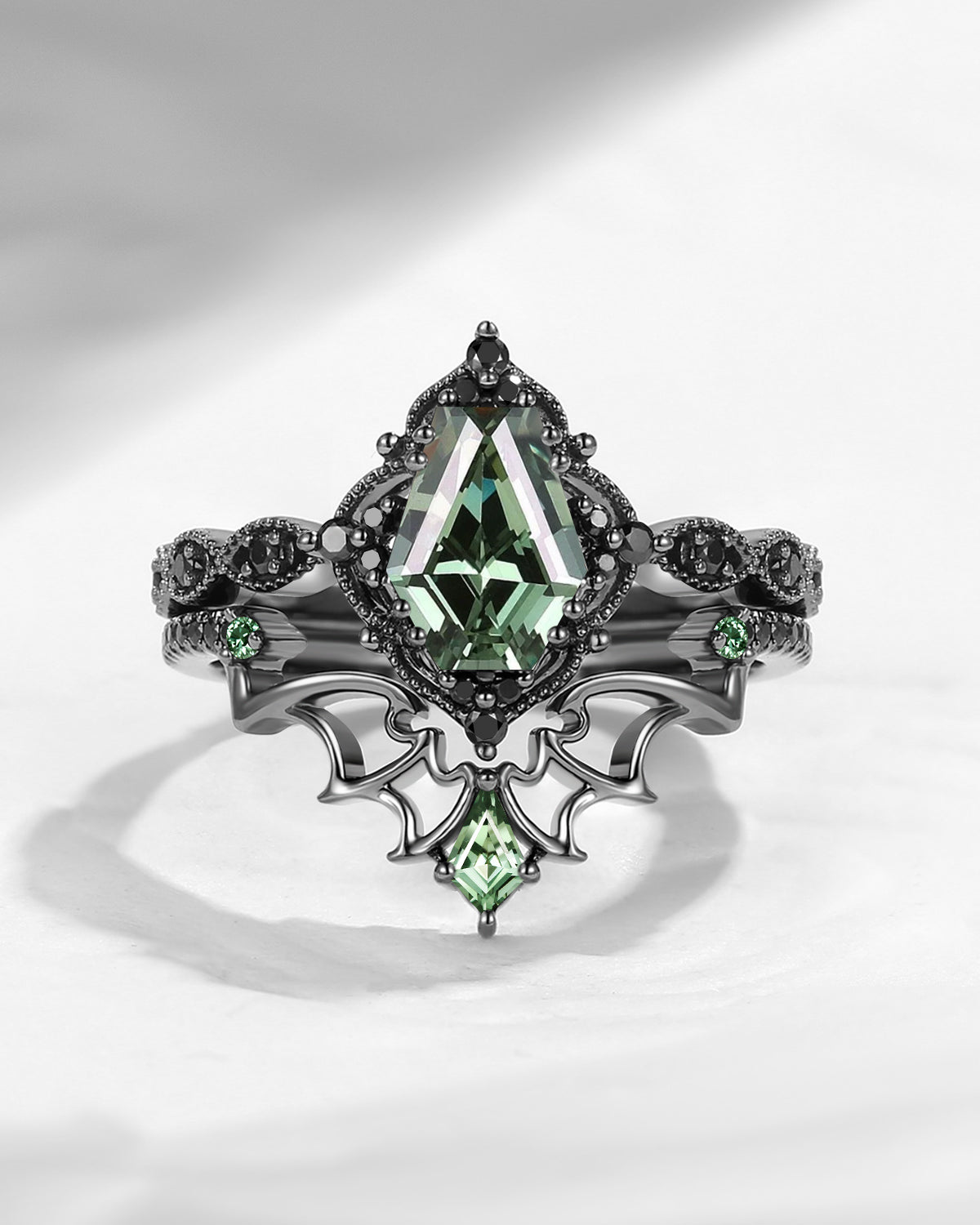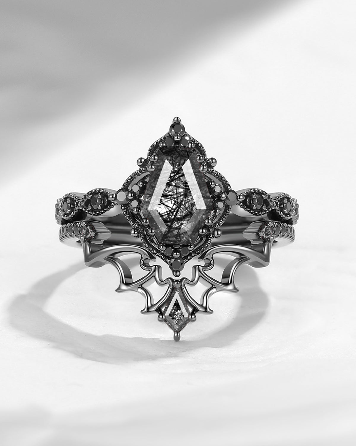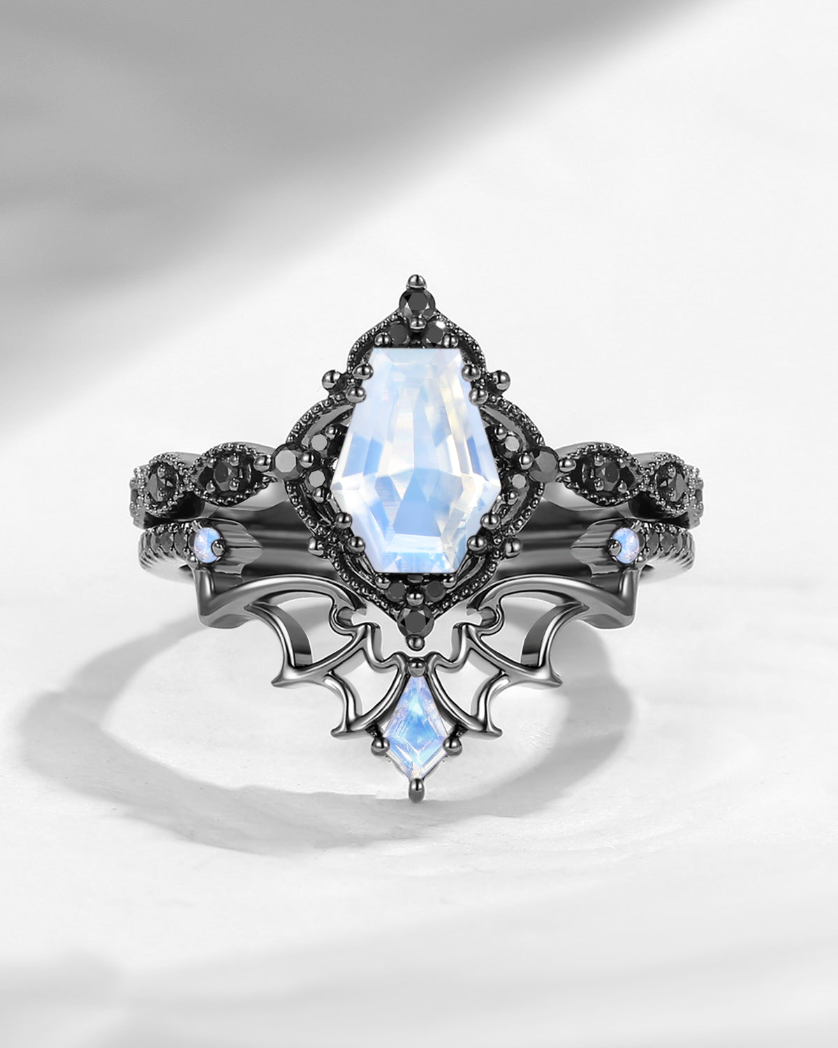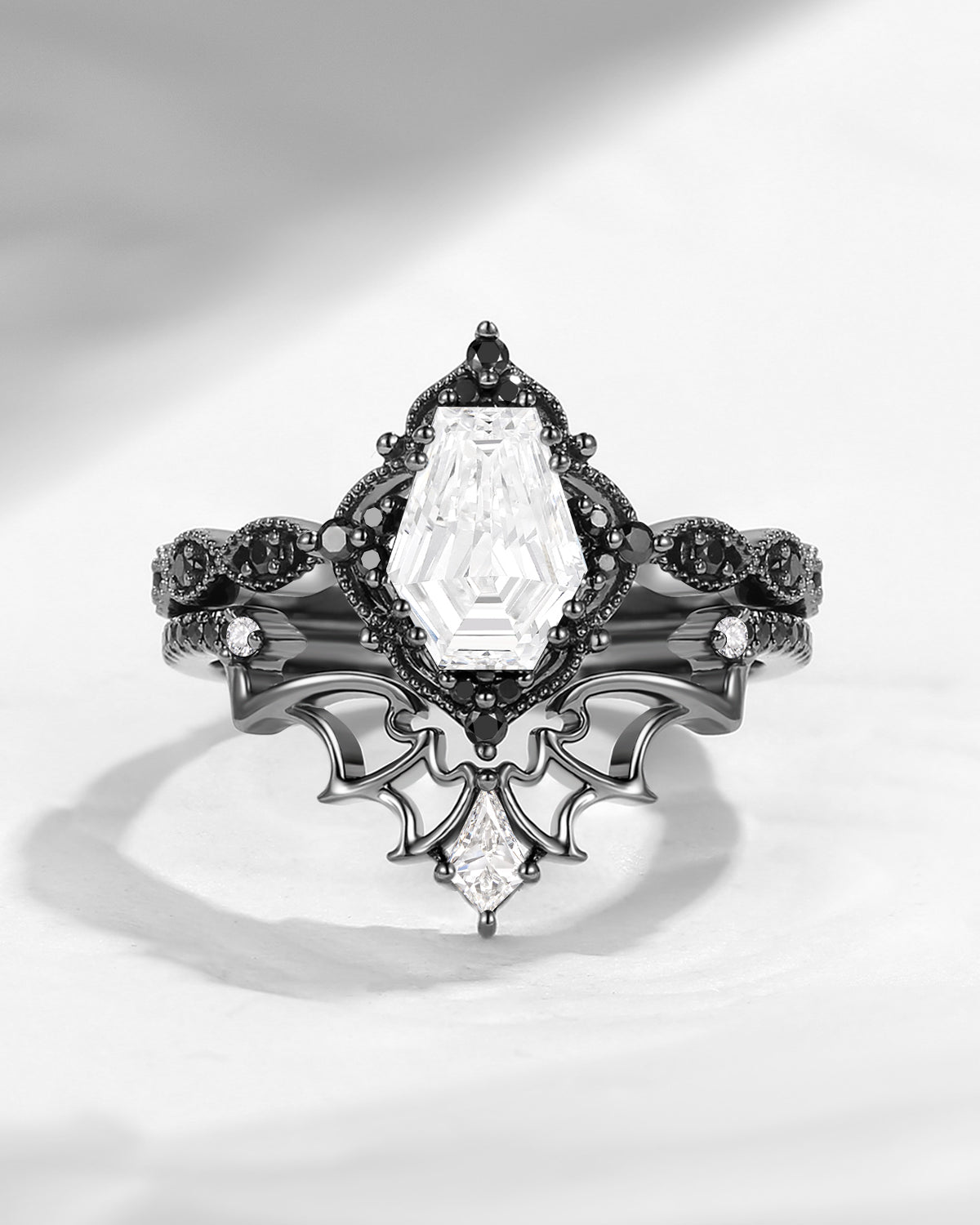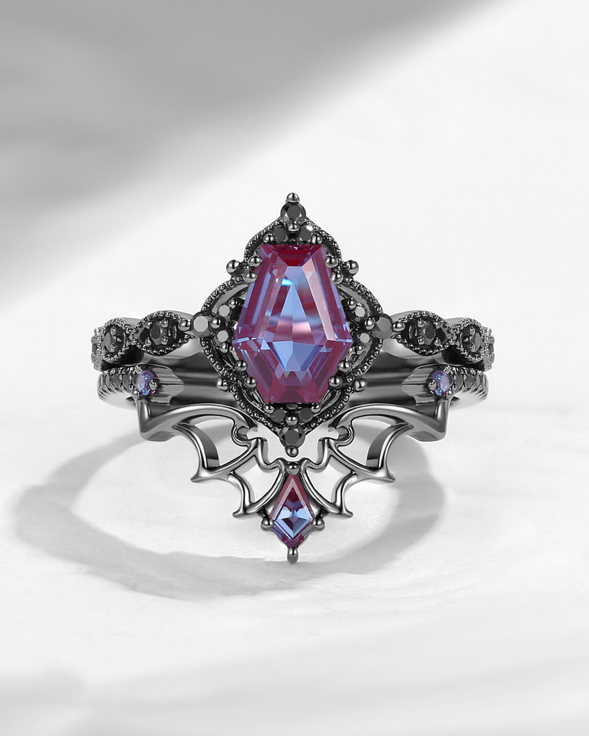 Gothic Inspired 'Bat Romance' Coffin Shaped Garnet Black Gold Engagement Ring Set 2pcs