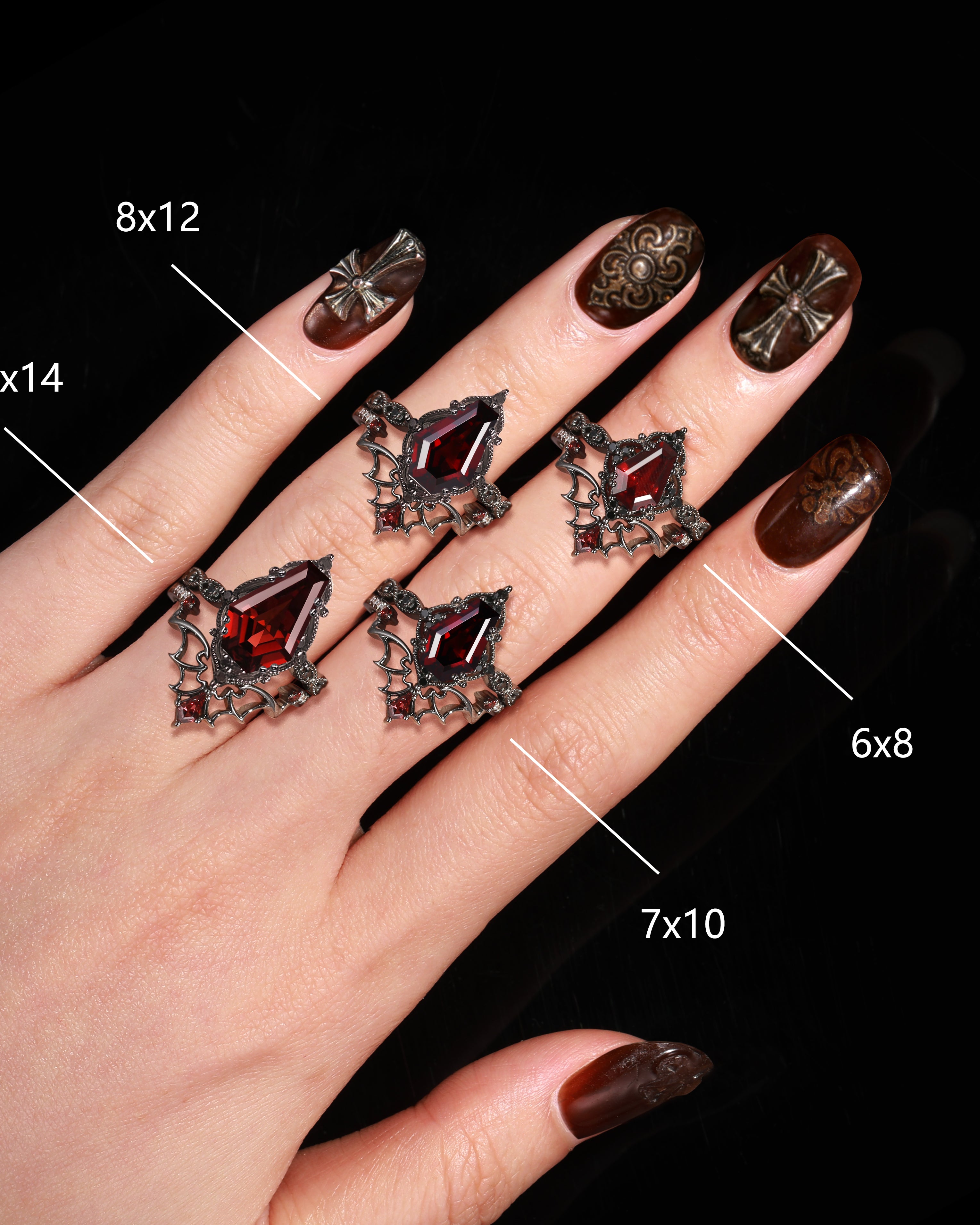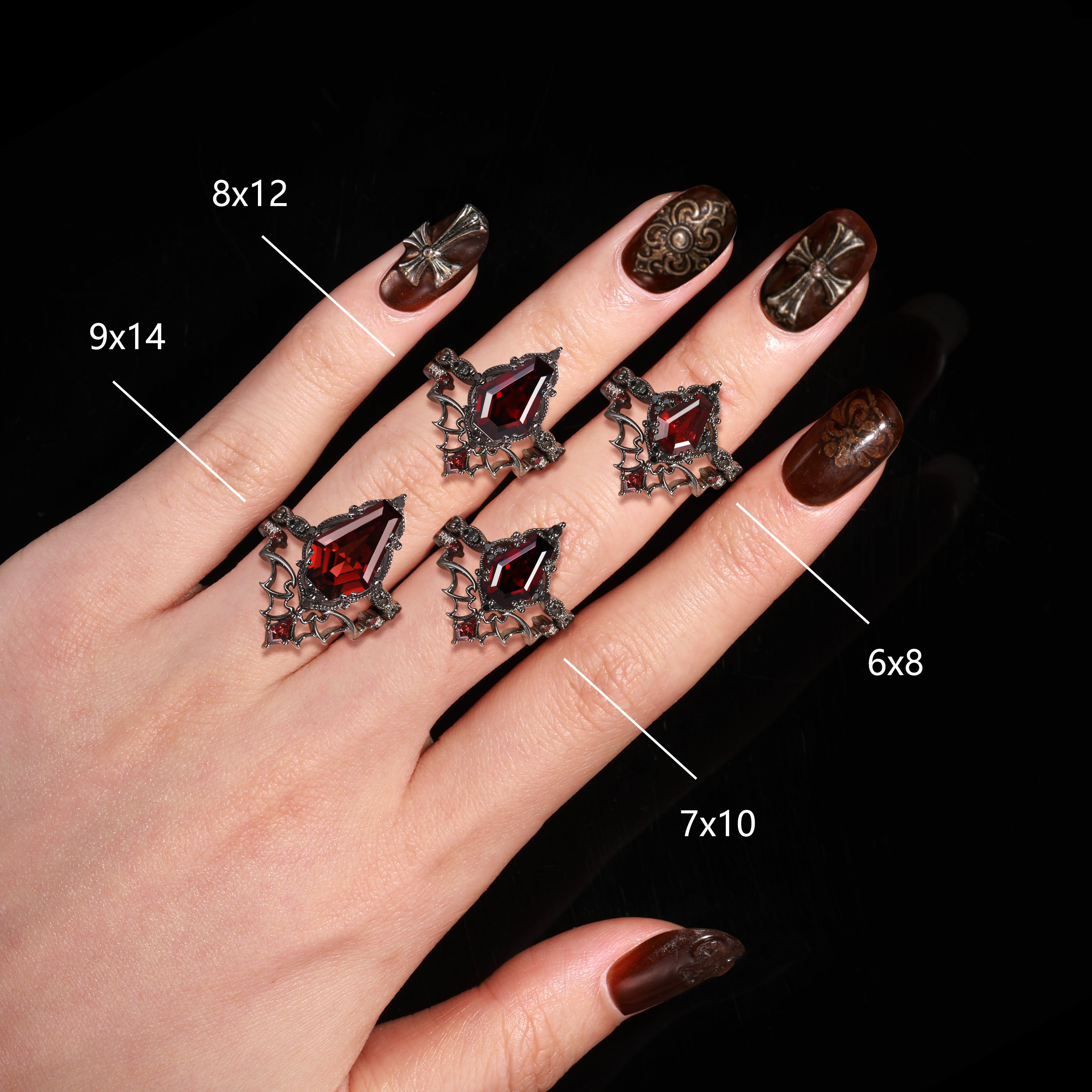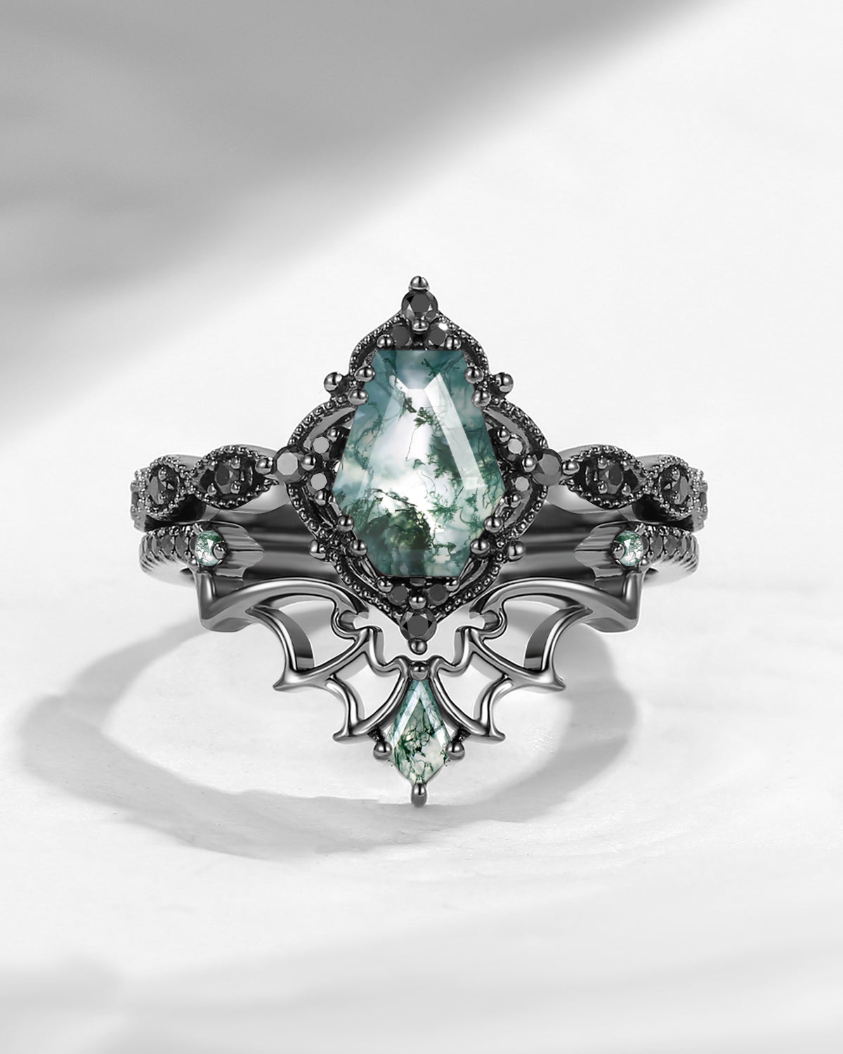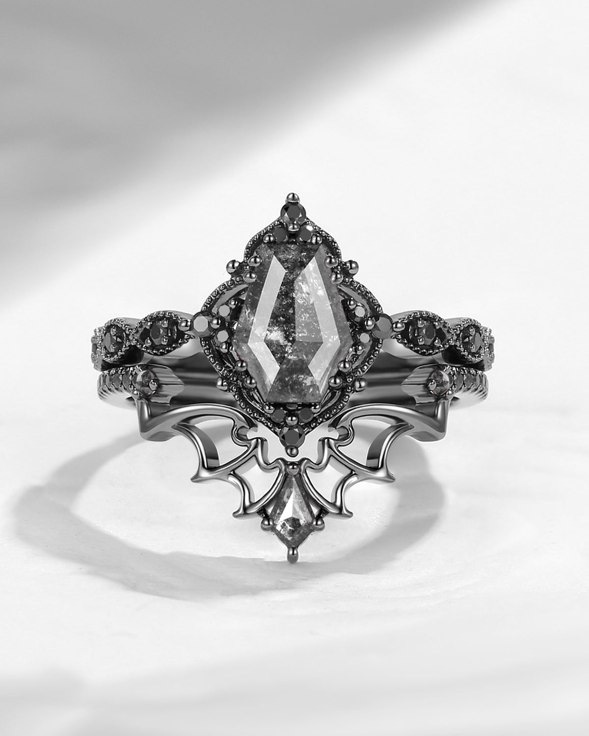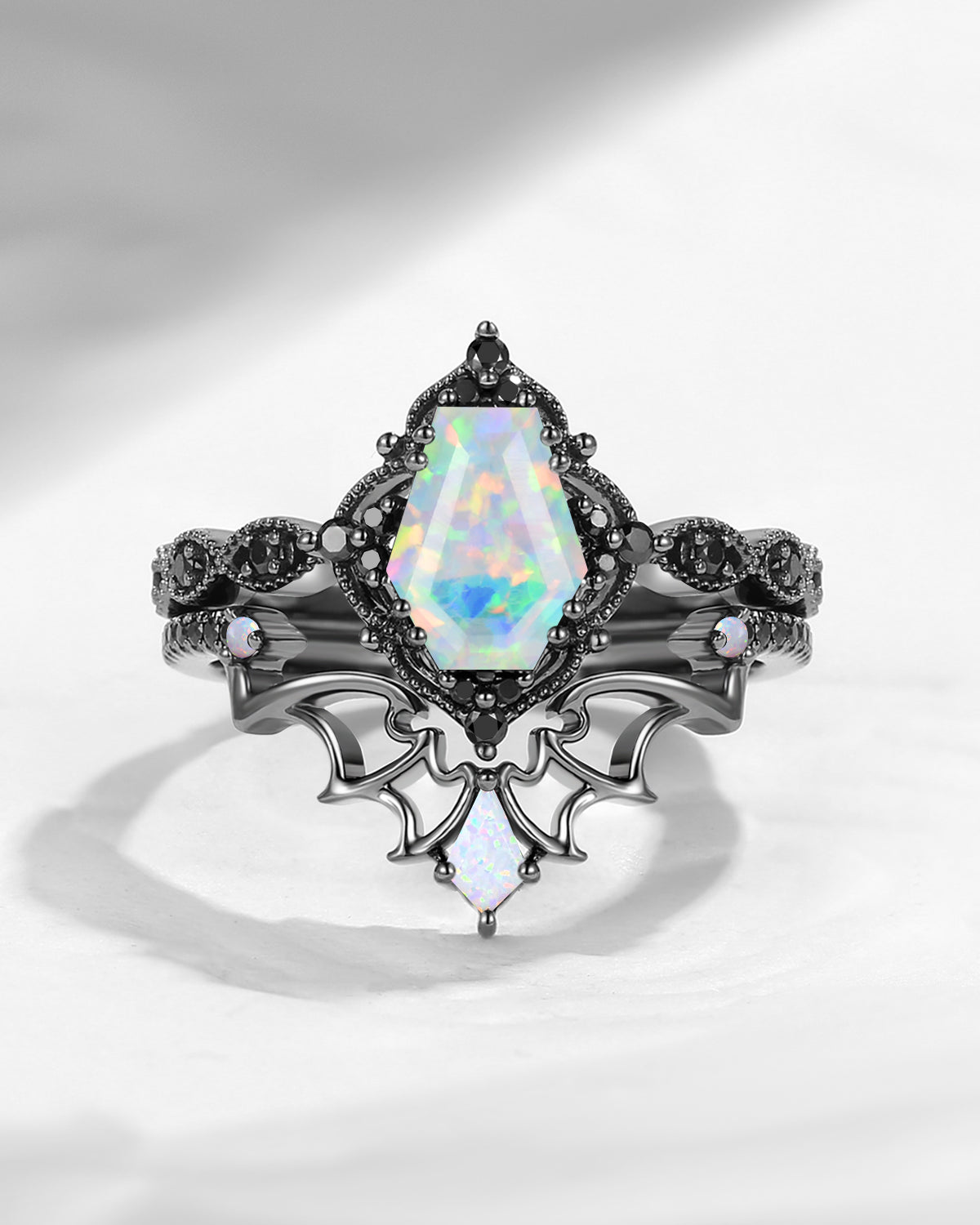 Gothic Inspired 'Bat Romance' Coffin Shaped Garnet Black Gold Engagement Ring Set 2pcs