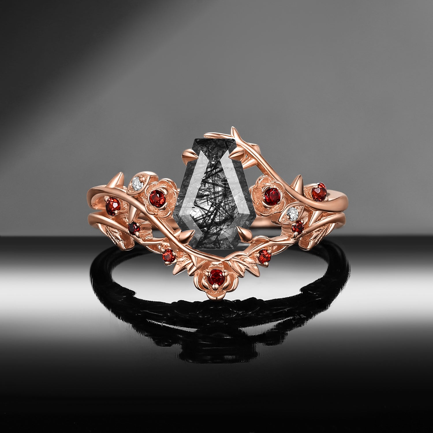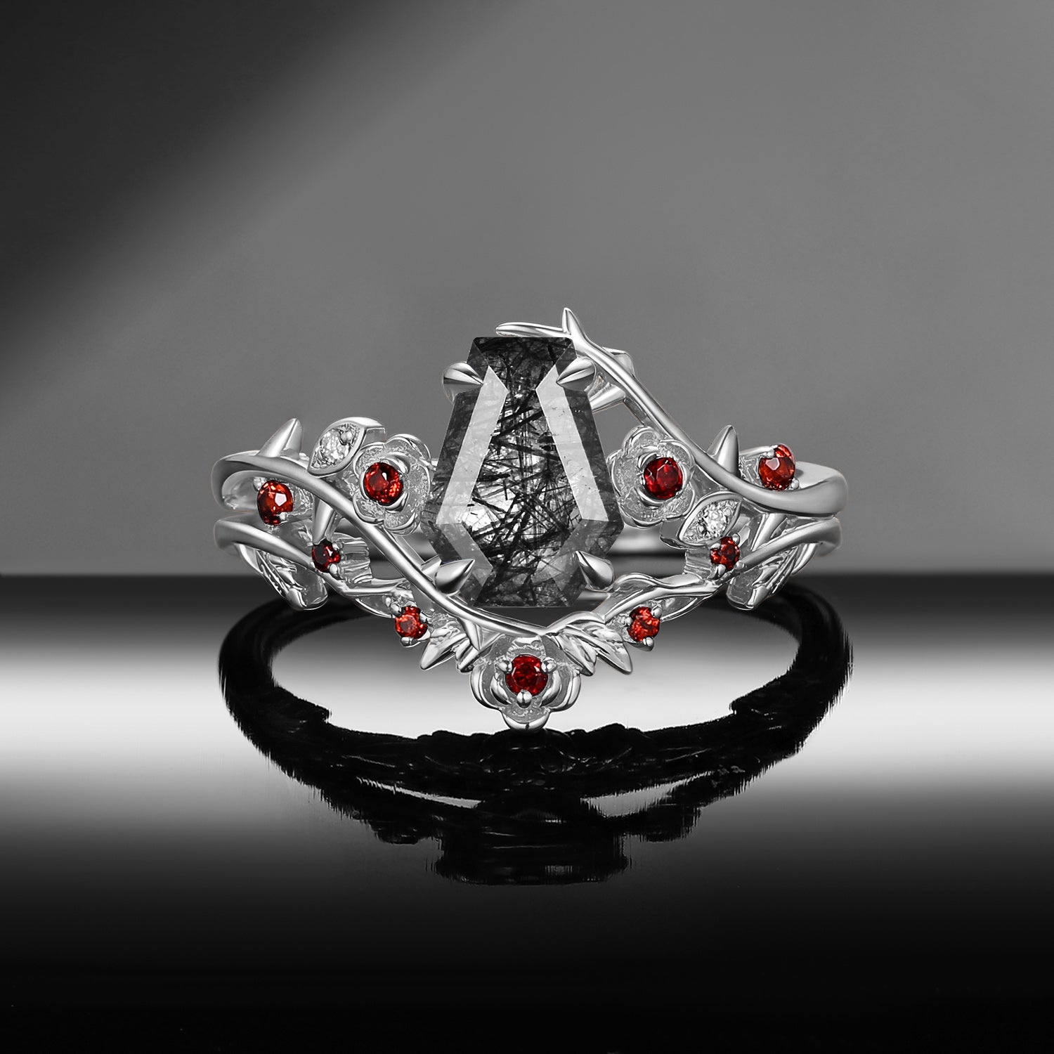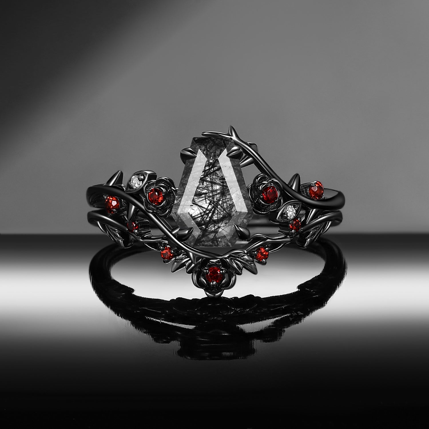 Gothic Nature Inspired Coffin Black Rutilated Quartz Engagement Ring Set 2pcs - 'Thorns & Roses'
