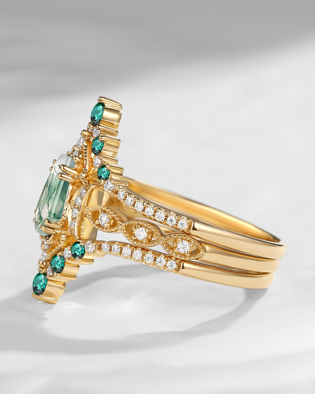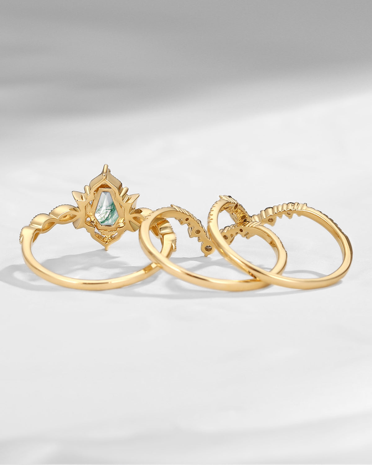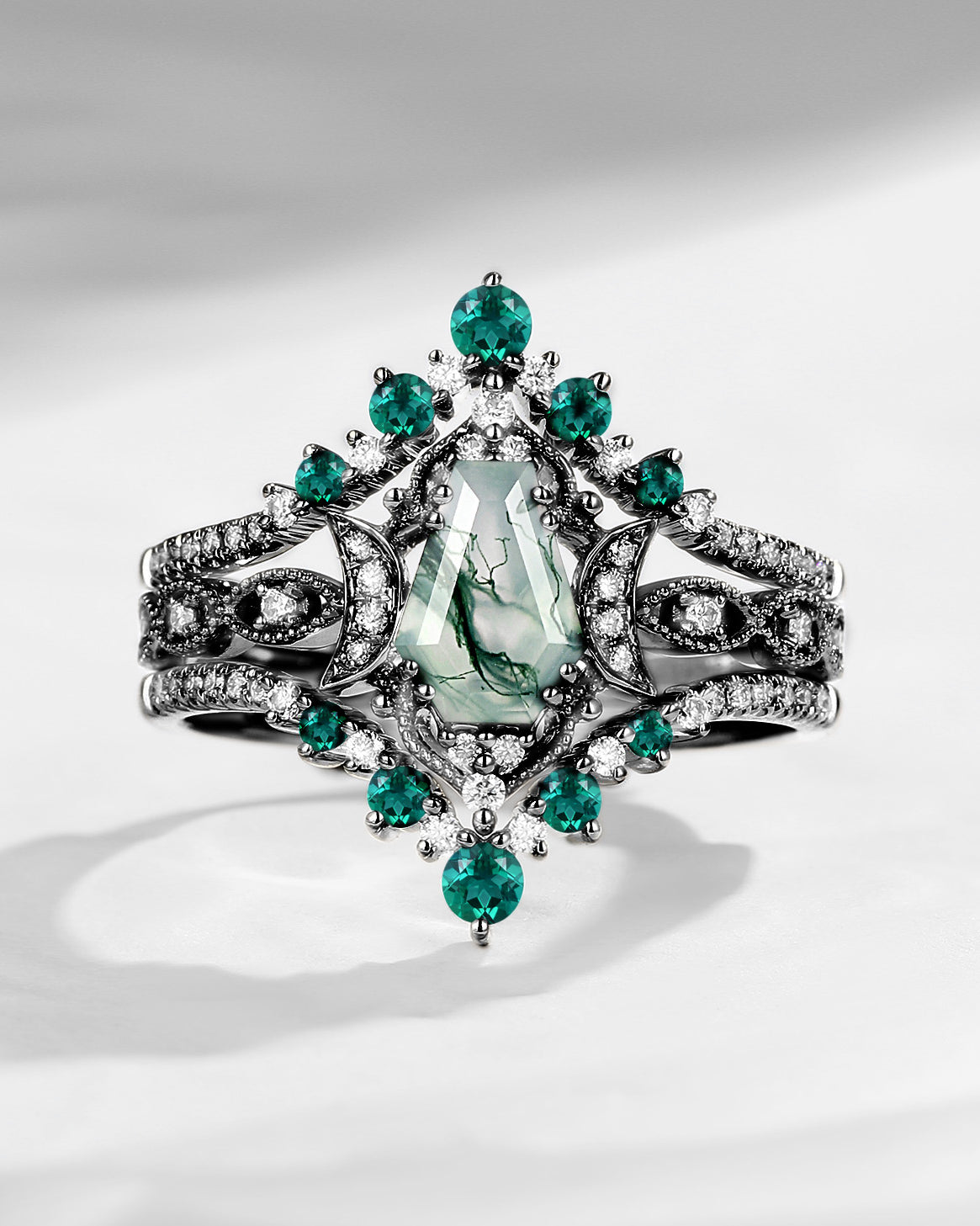 Crescent Moon | Coffin Moss Agate & Lab Emerald Ring 3pcs 18k - Till Death Do Us Part