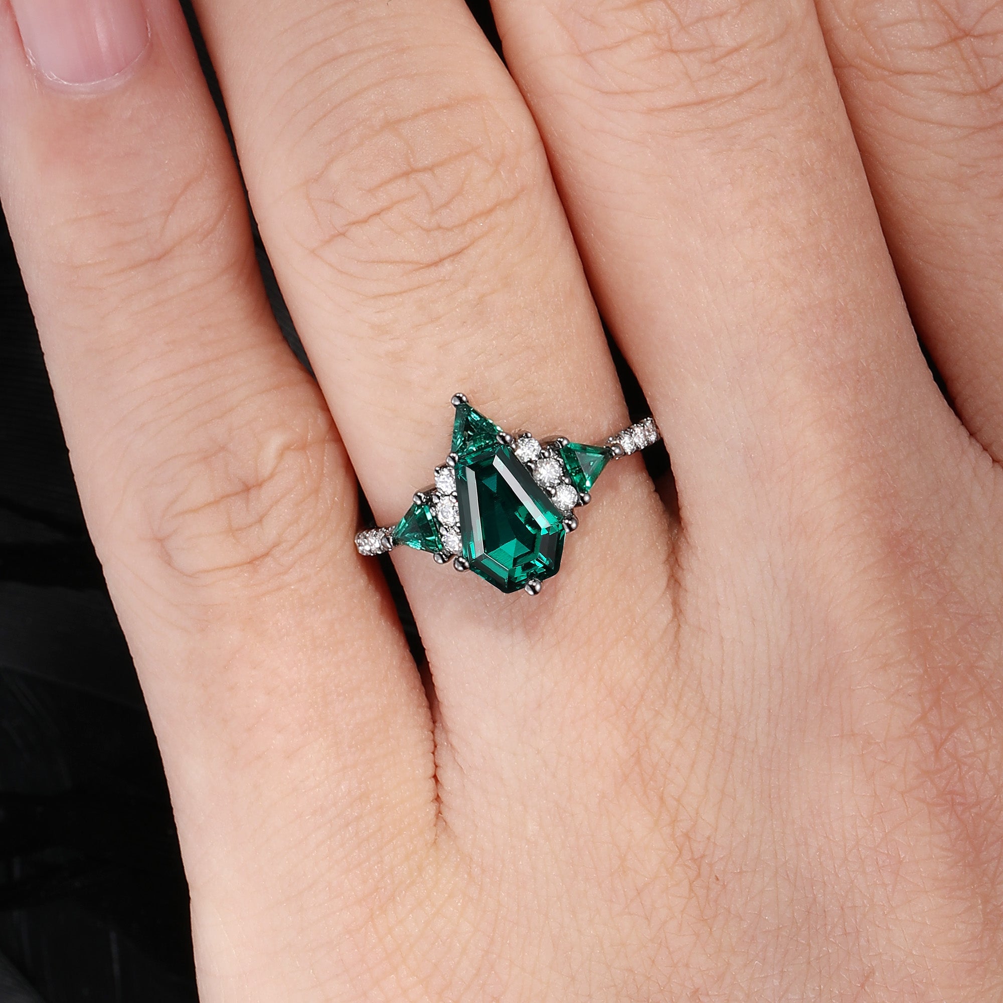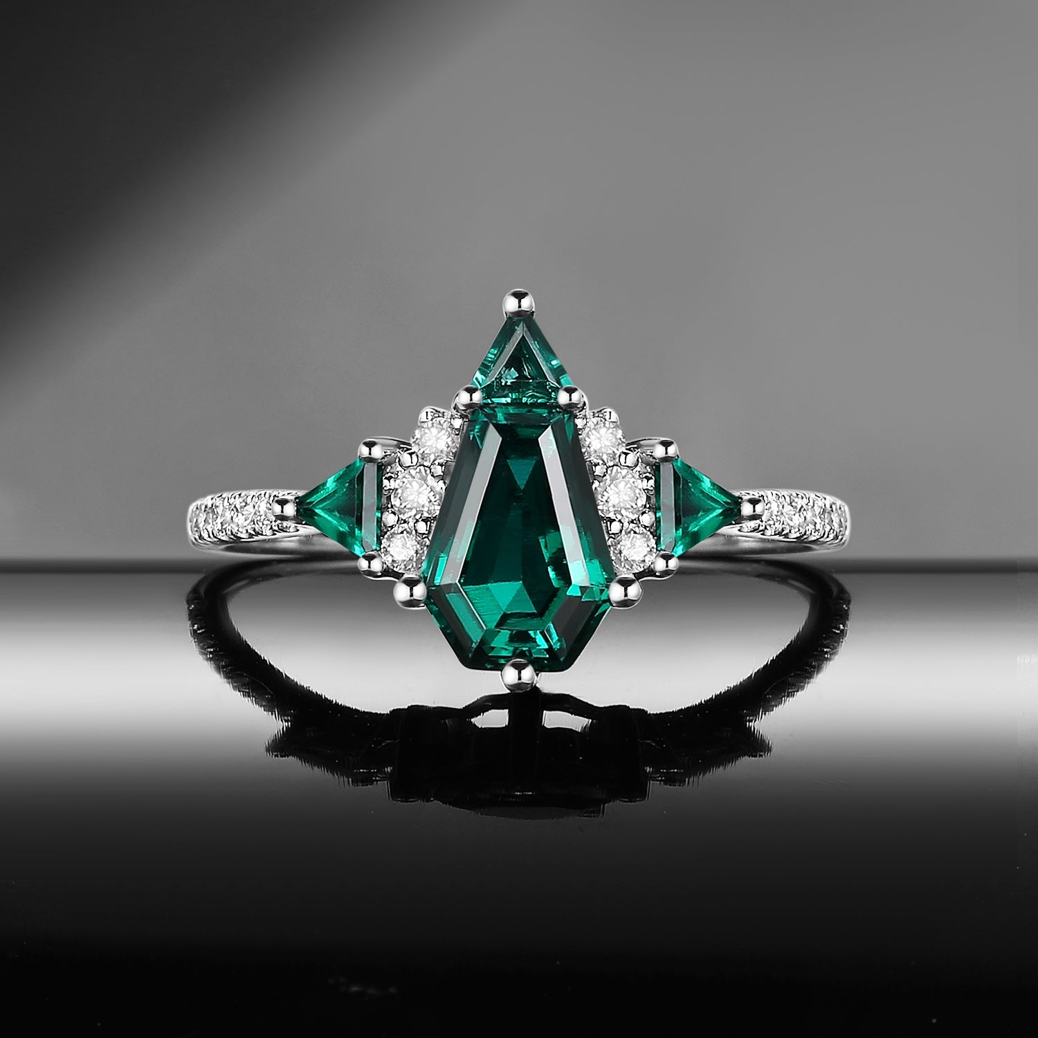 Unique Style Coffin Shaped Lab Emerald Cluster Engagement Ring