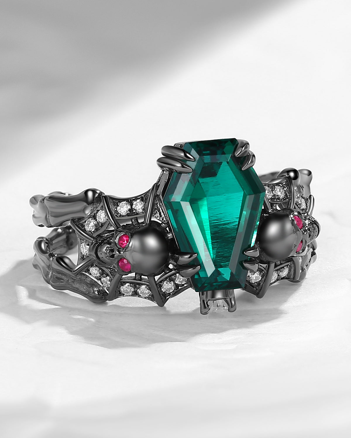 Gothic Coffin Shaped Lab Alexandrite Spider Inspired Engagement Ring Set 2pcs