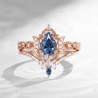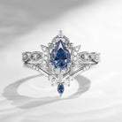 Pear Shaped Blue Moissanite Engagement Ring Unique Crescent Ring Moon Wedding Ring Vine Boho Ring Cluster Bridal Set 2pcs Galaxy