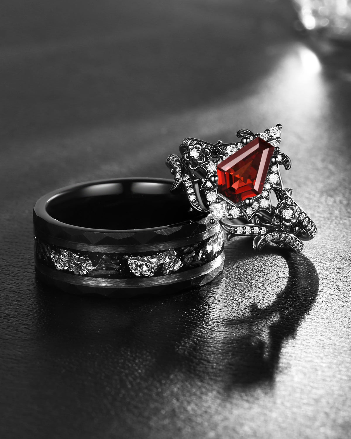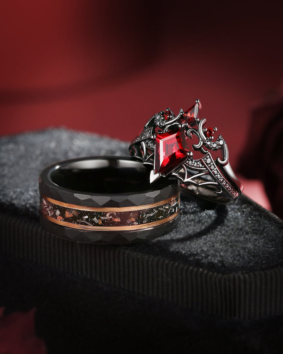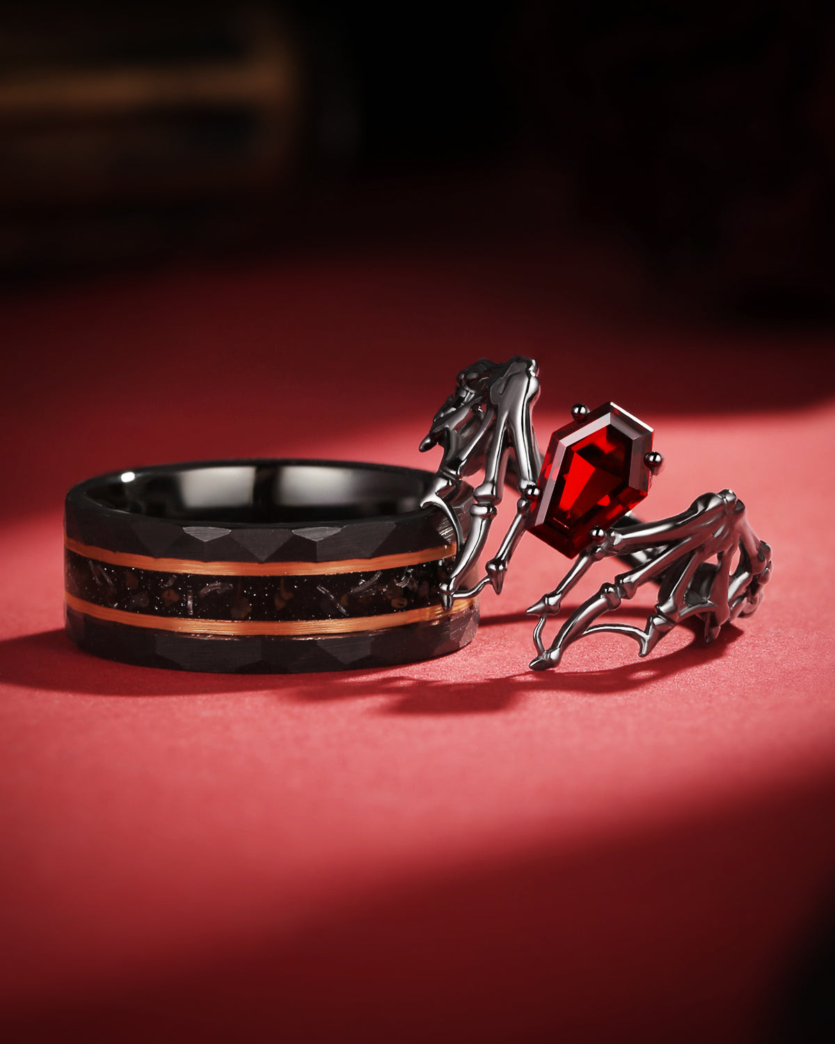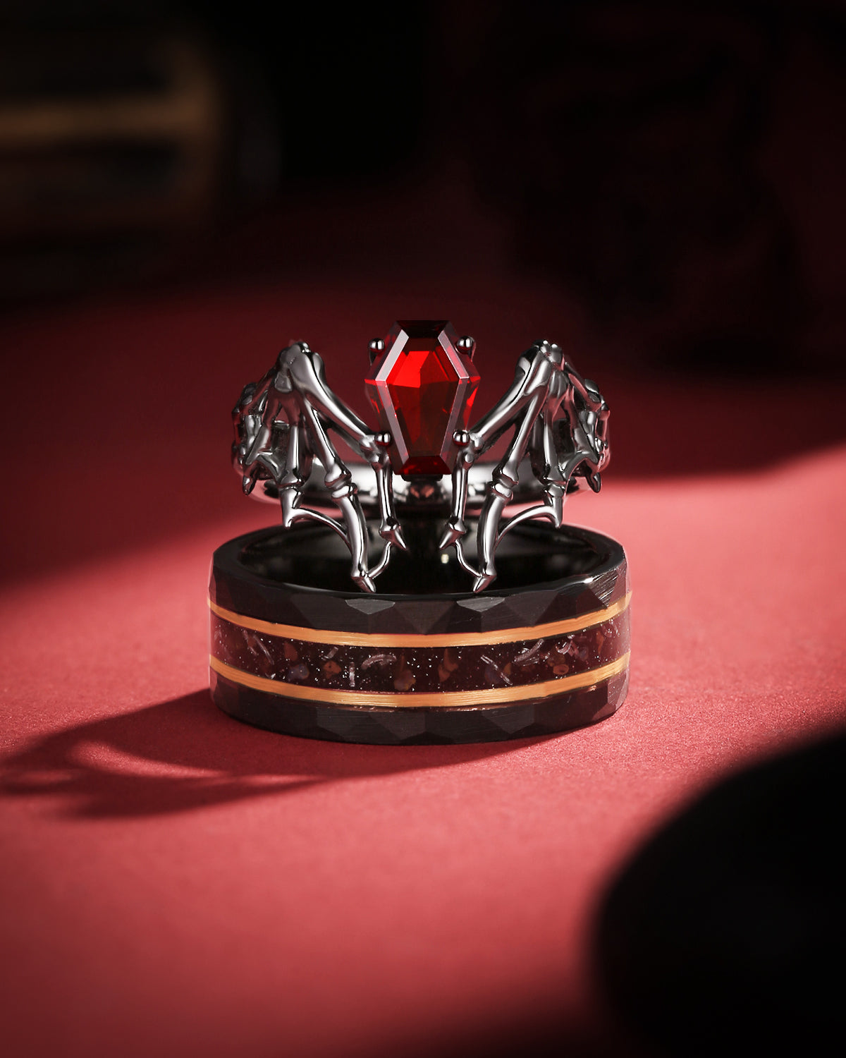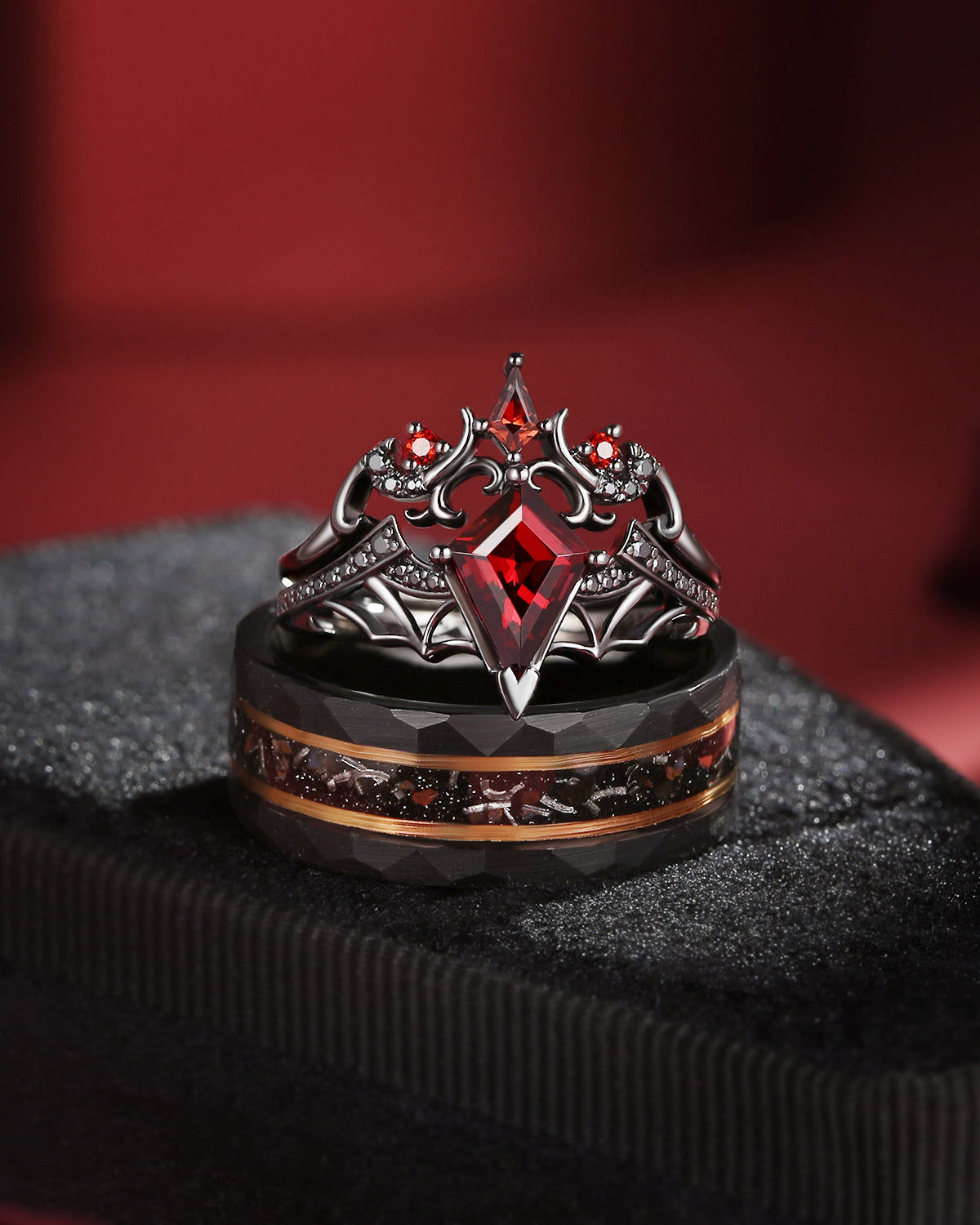 Bat Wing Inspired Coffin Garnet With Gold Strips Couple Bridal Ring Set