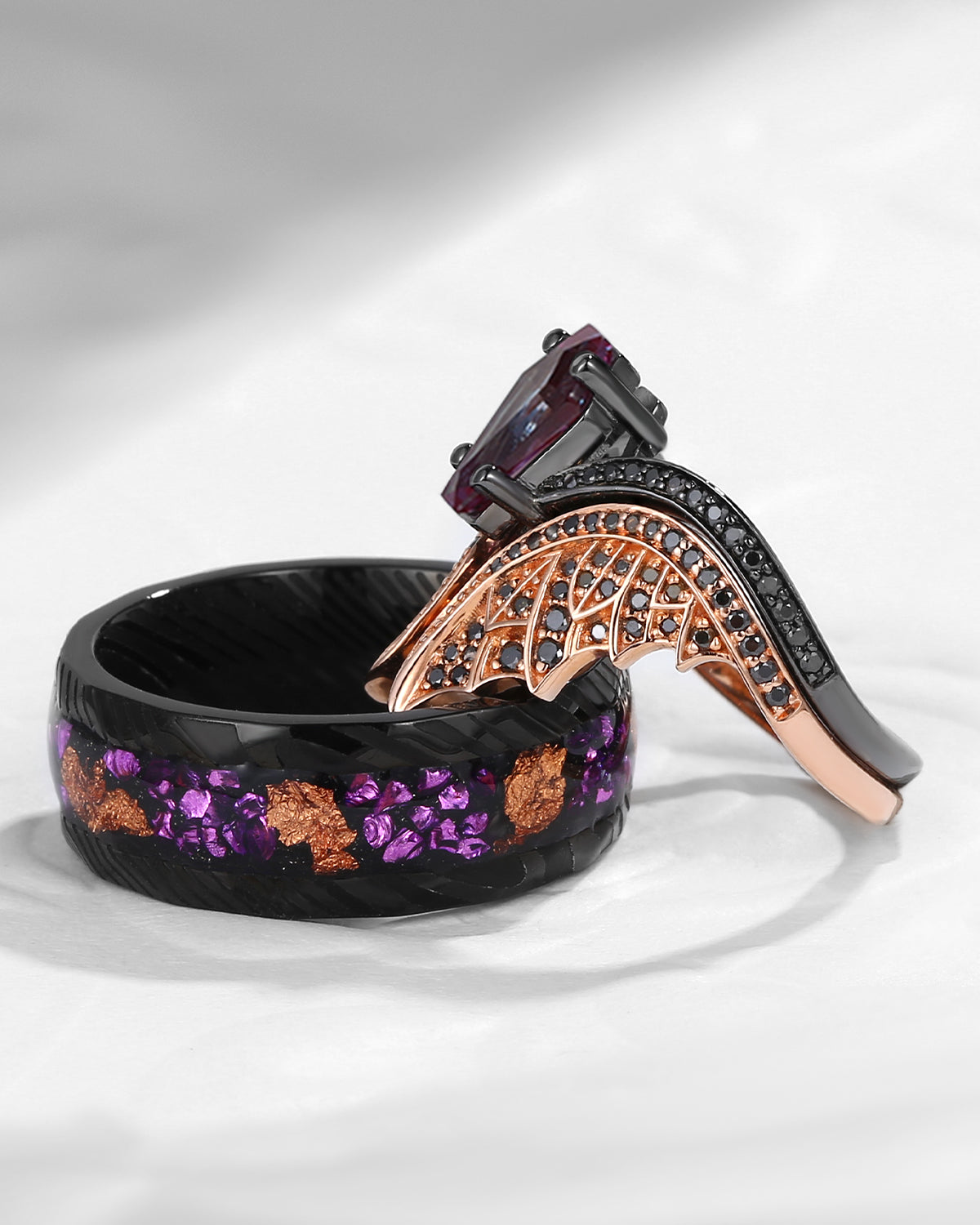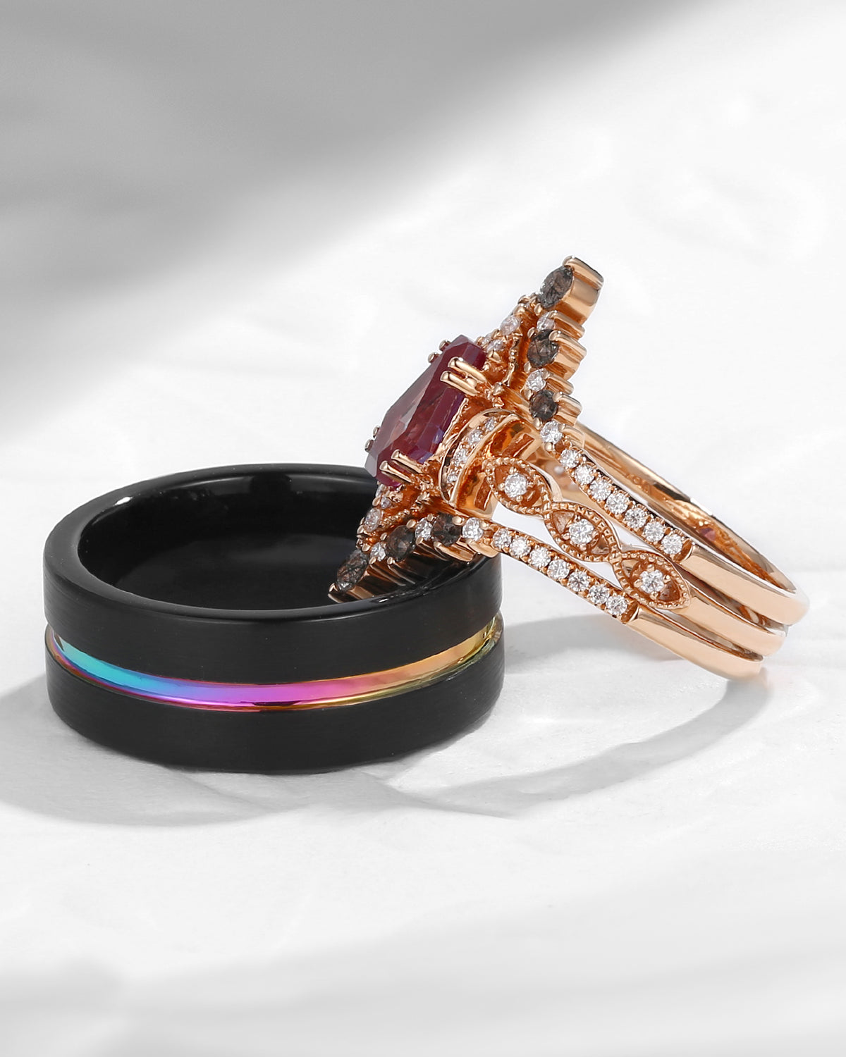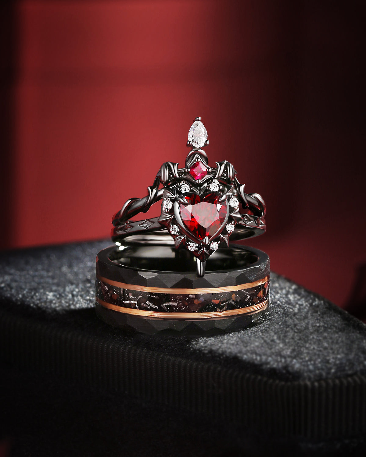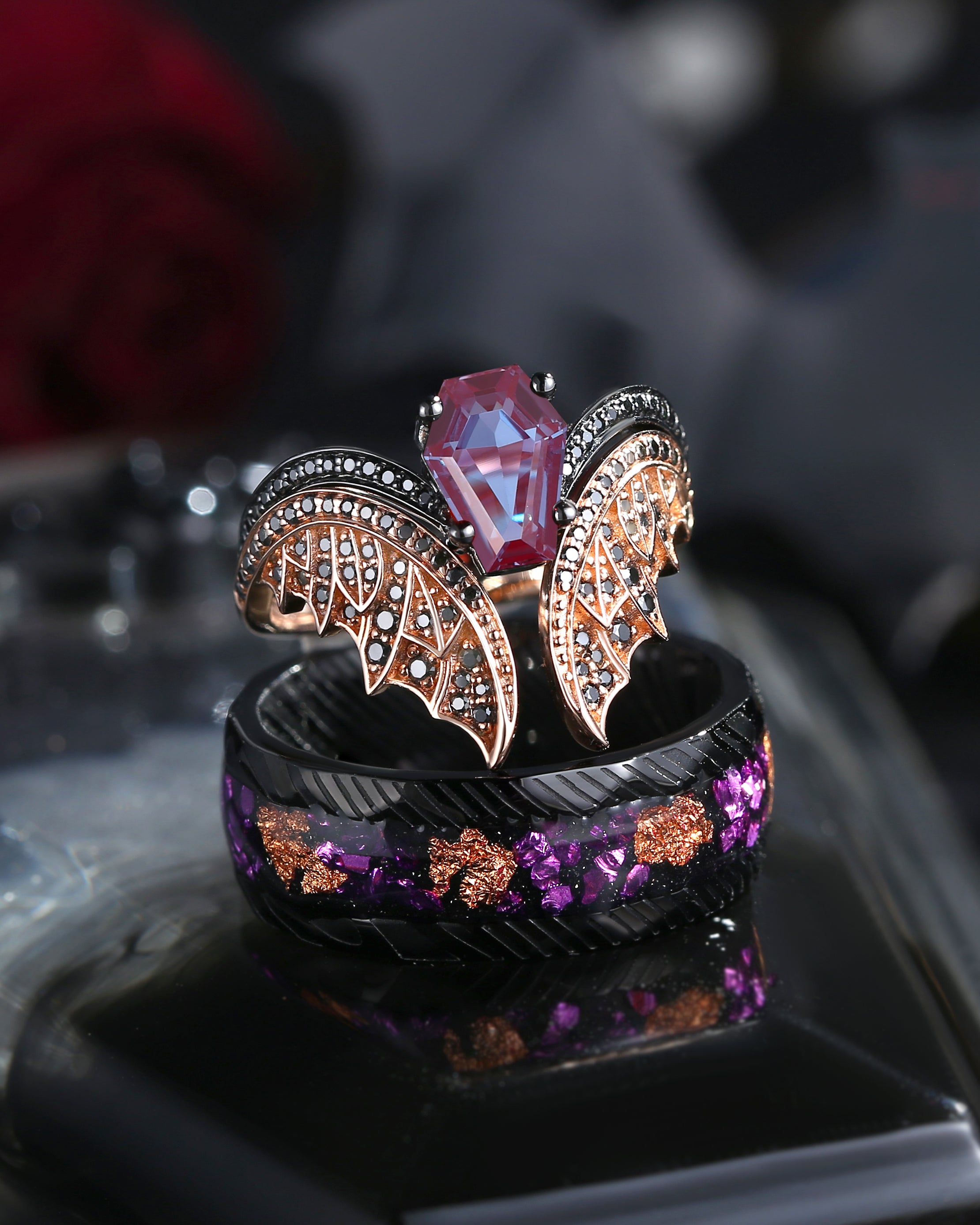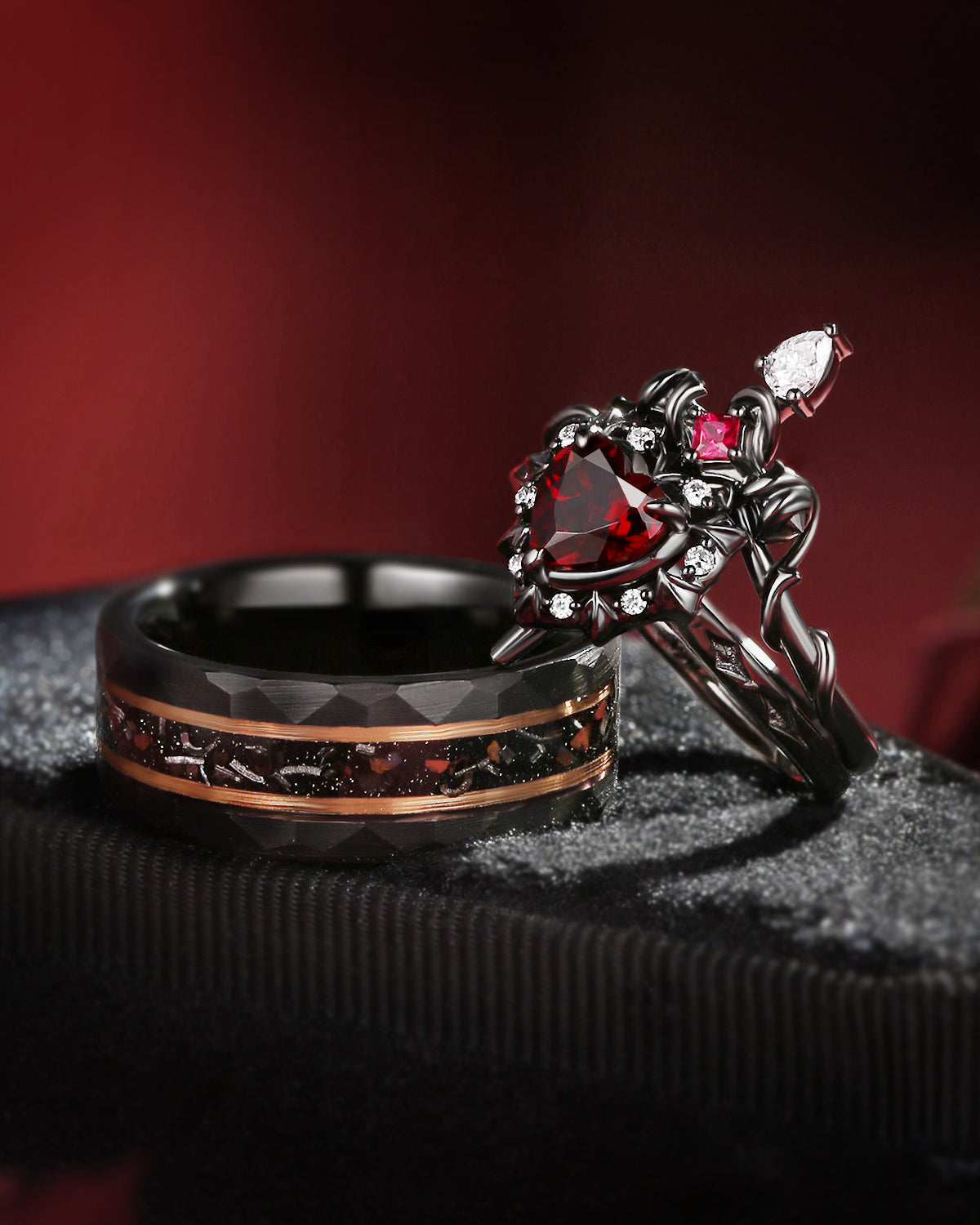 Bat Wing Inspired Coffin Garnet With Gold Strips Couple Bridal Ring Set