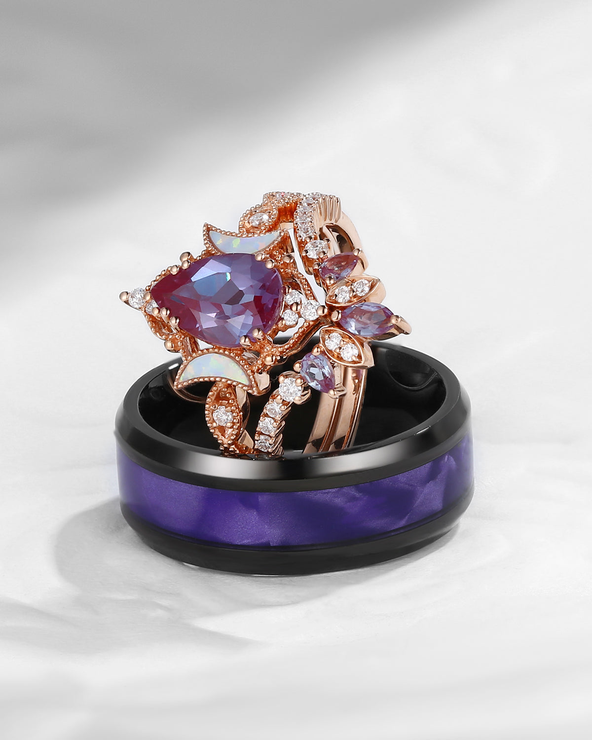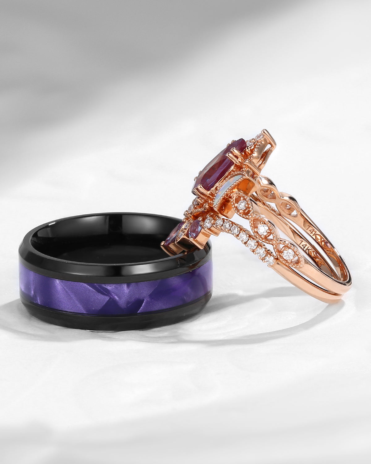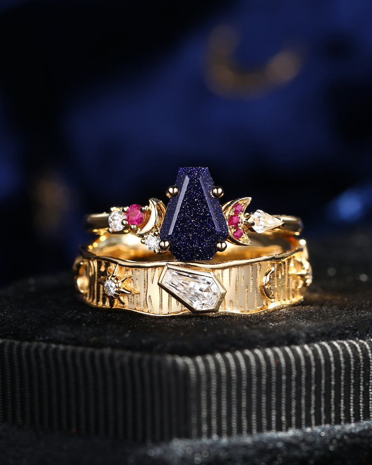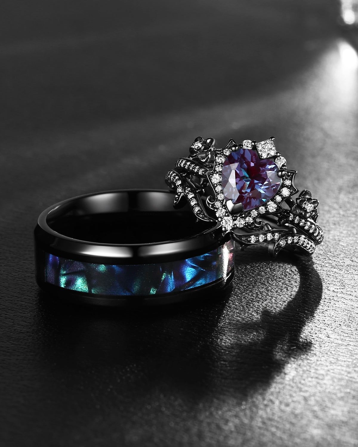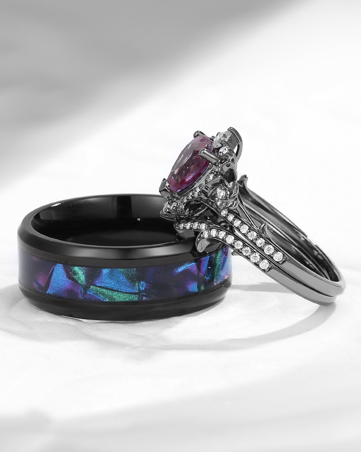 Bat Wing Inspired Coffin Garnet With Gold Strips Couple Bridal Ring Set