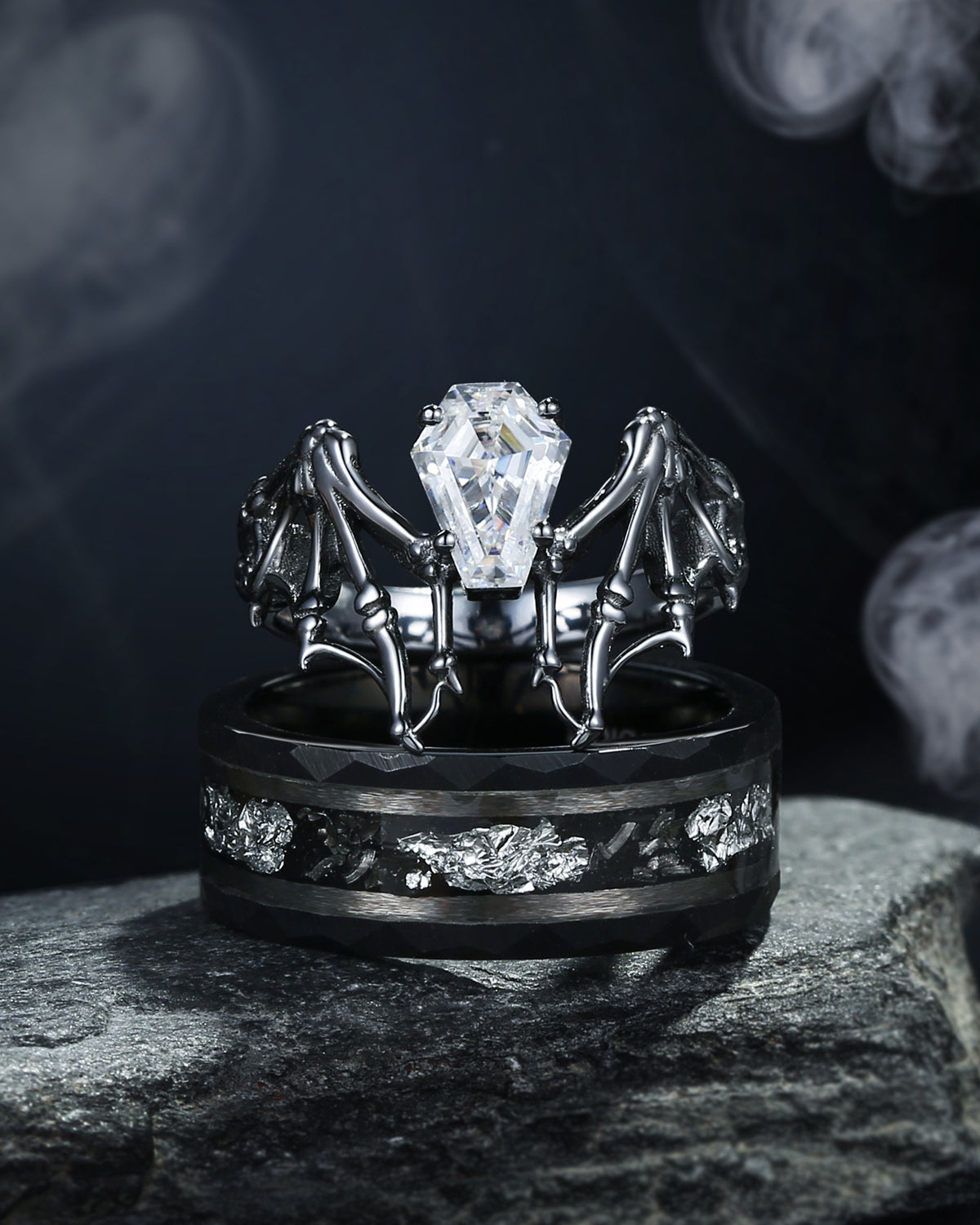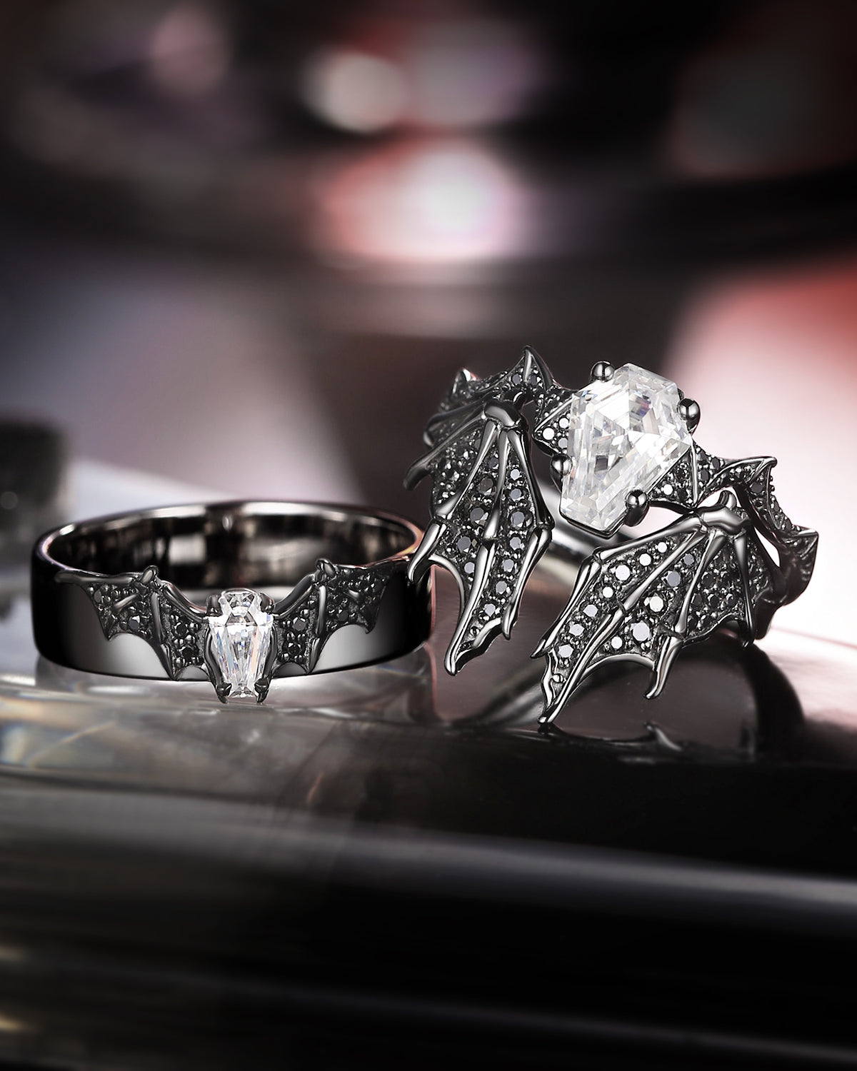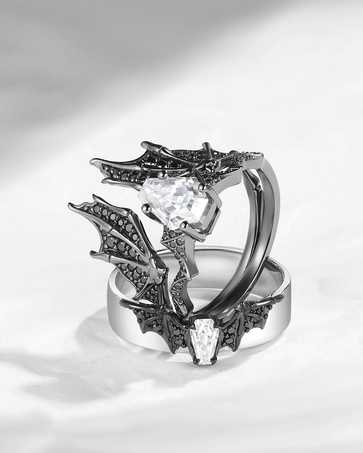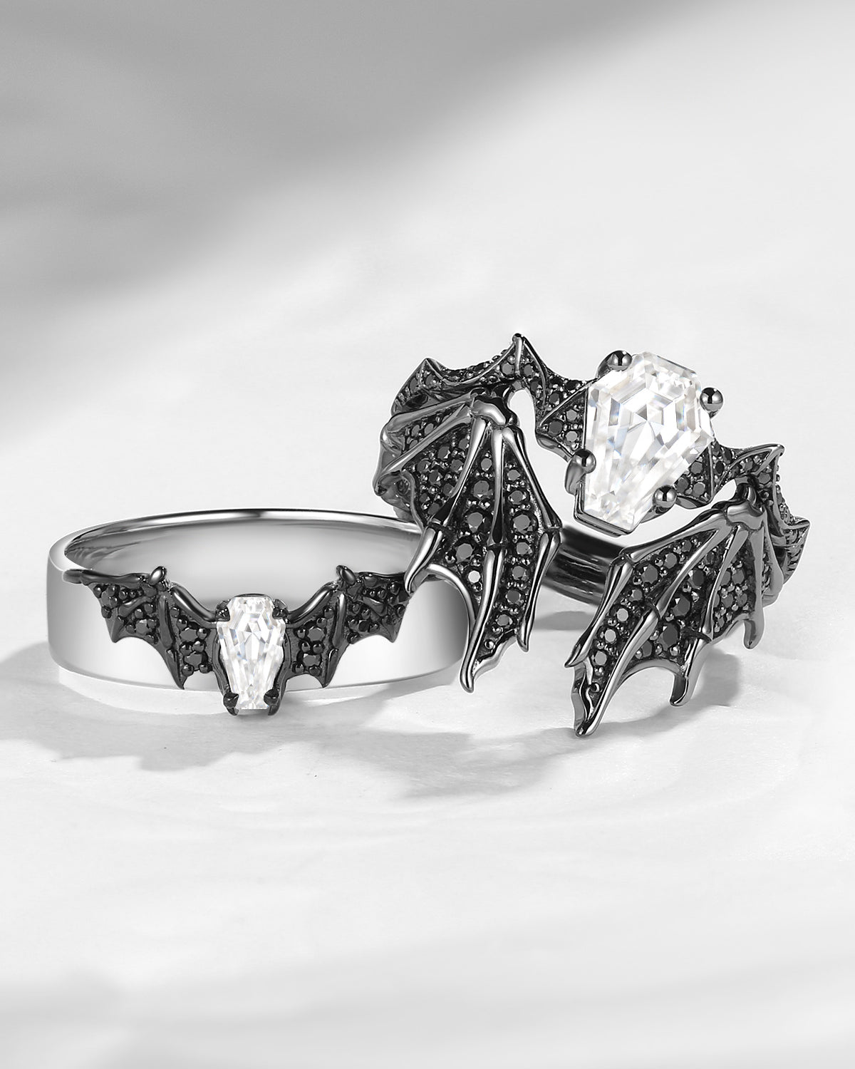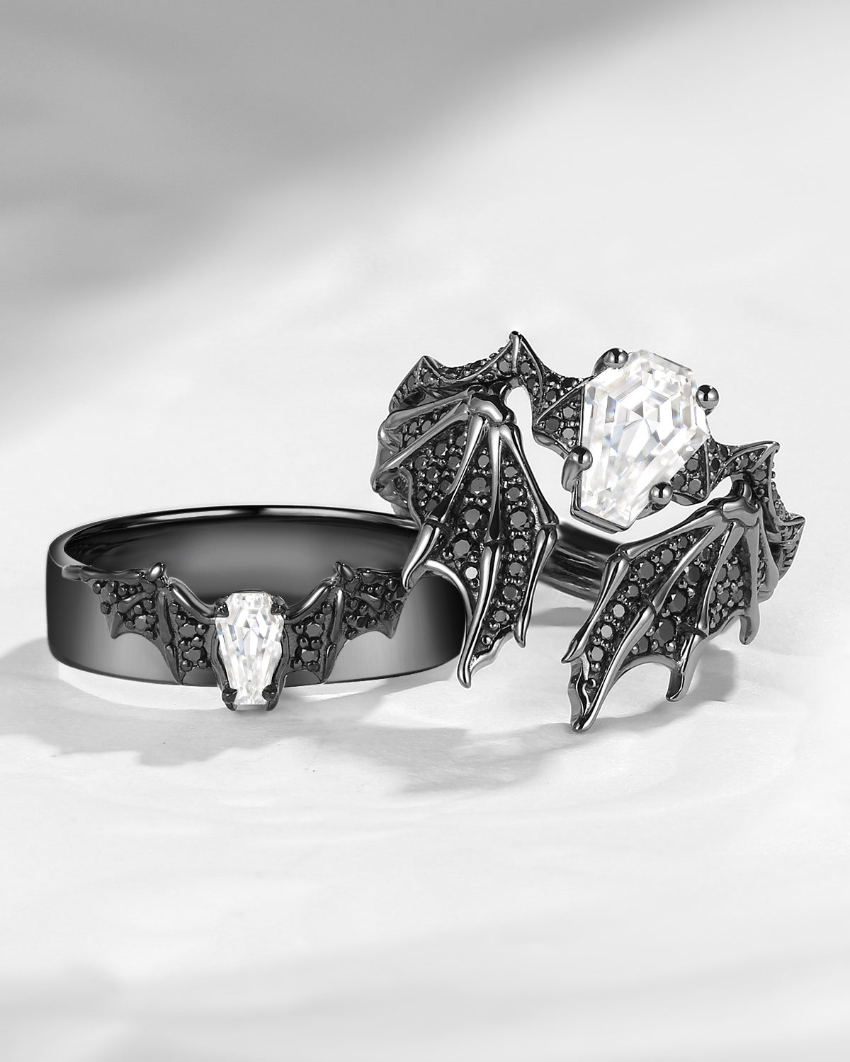 Bat Wing Inspired Coffin Moissanite Couple Bridal Ring Set