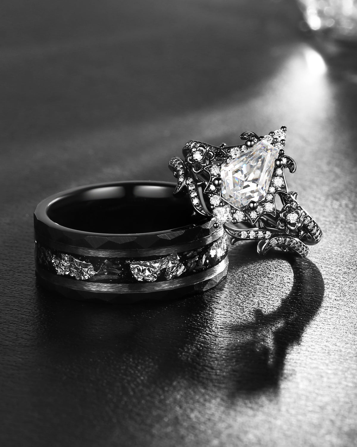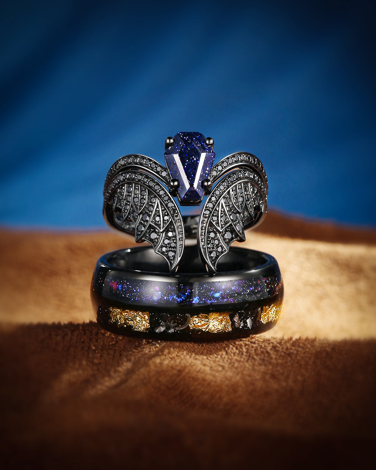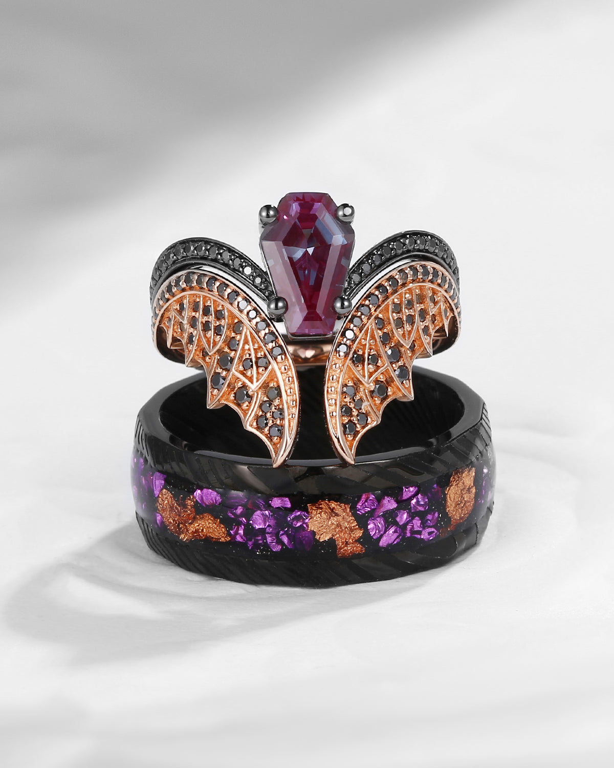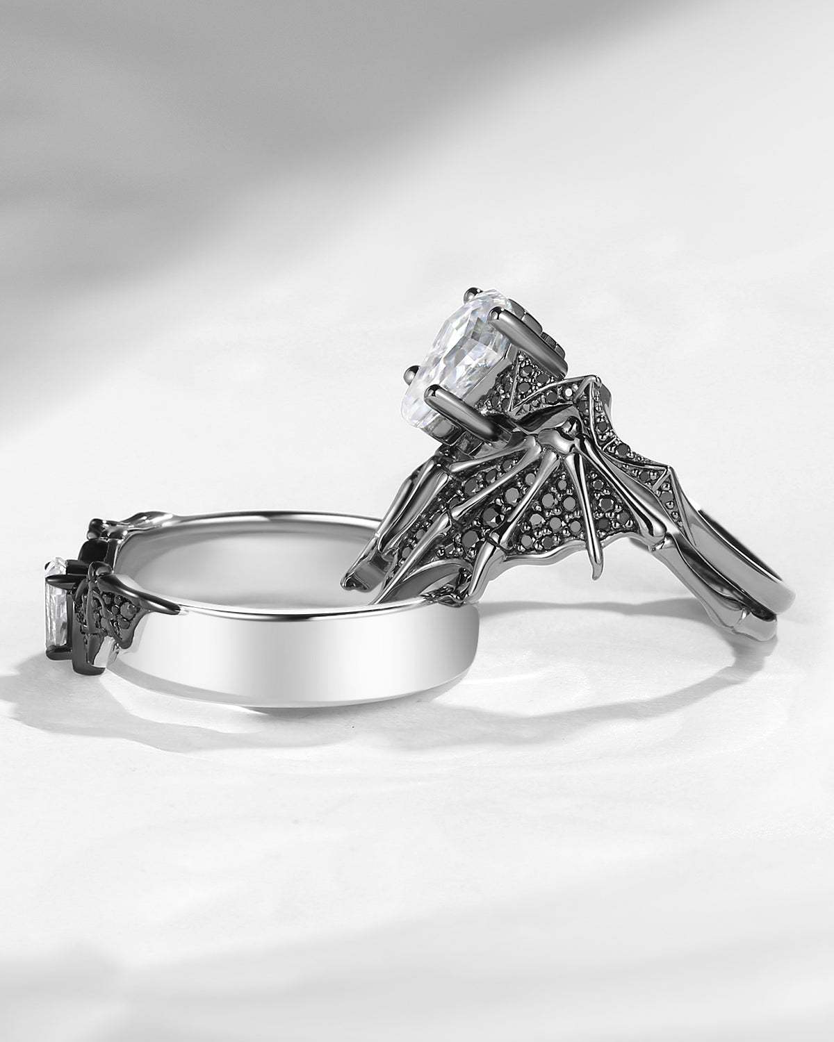 Bat Wing Inspired Coffin Moissanite Couple Bridal Ring Set