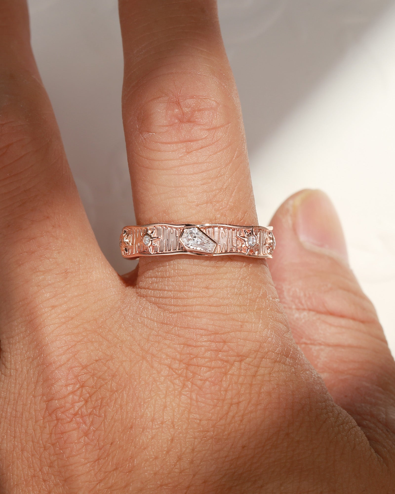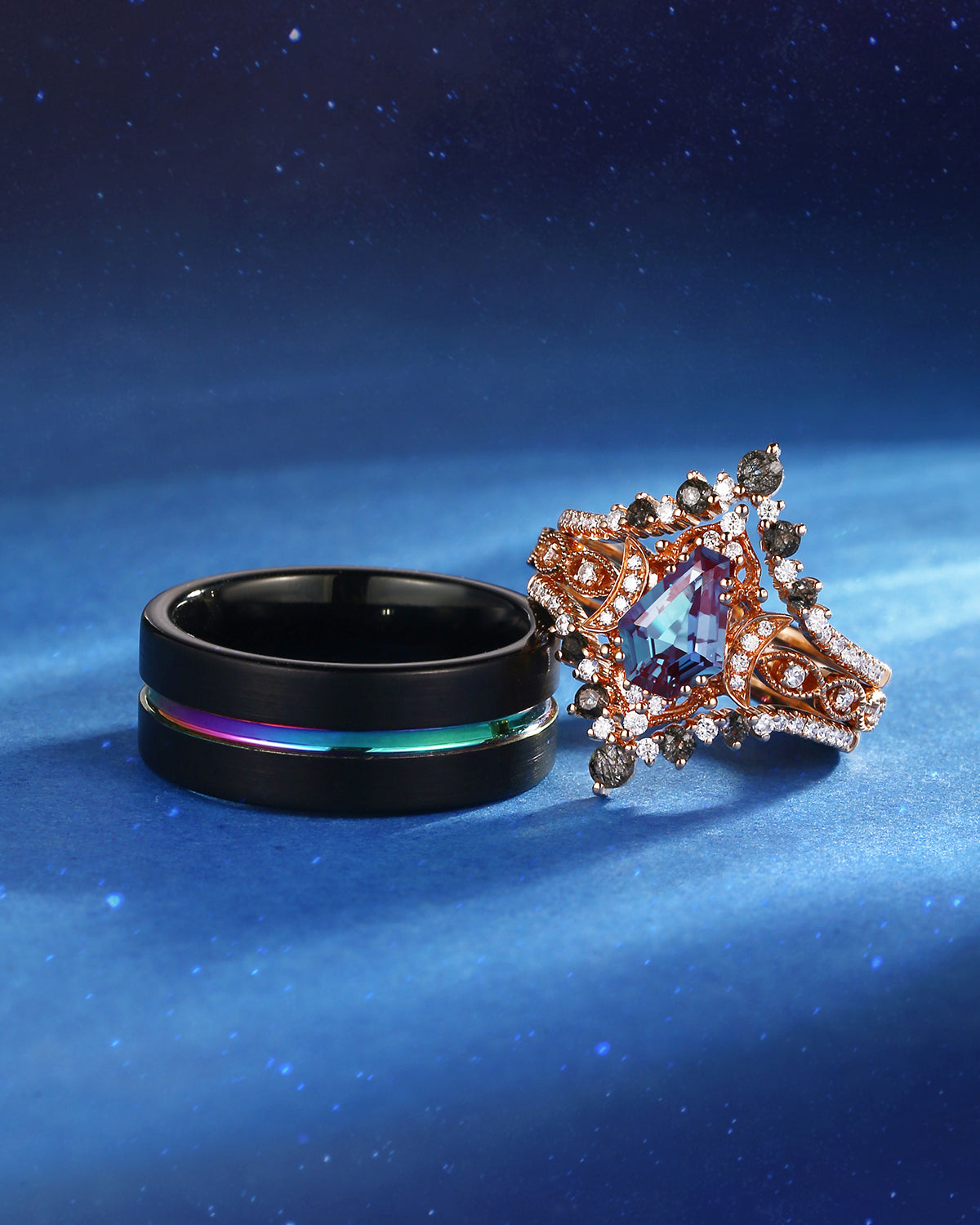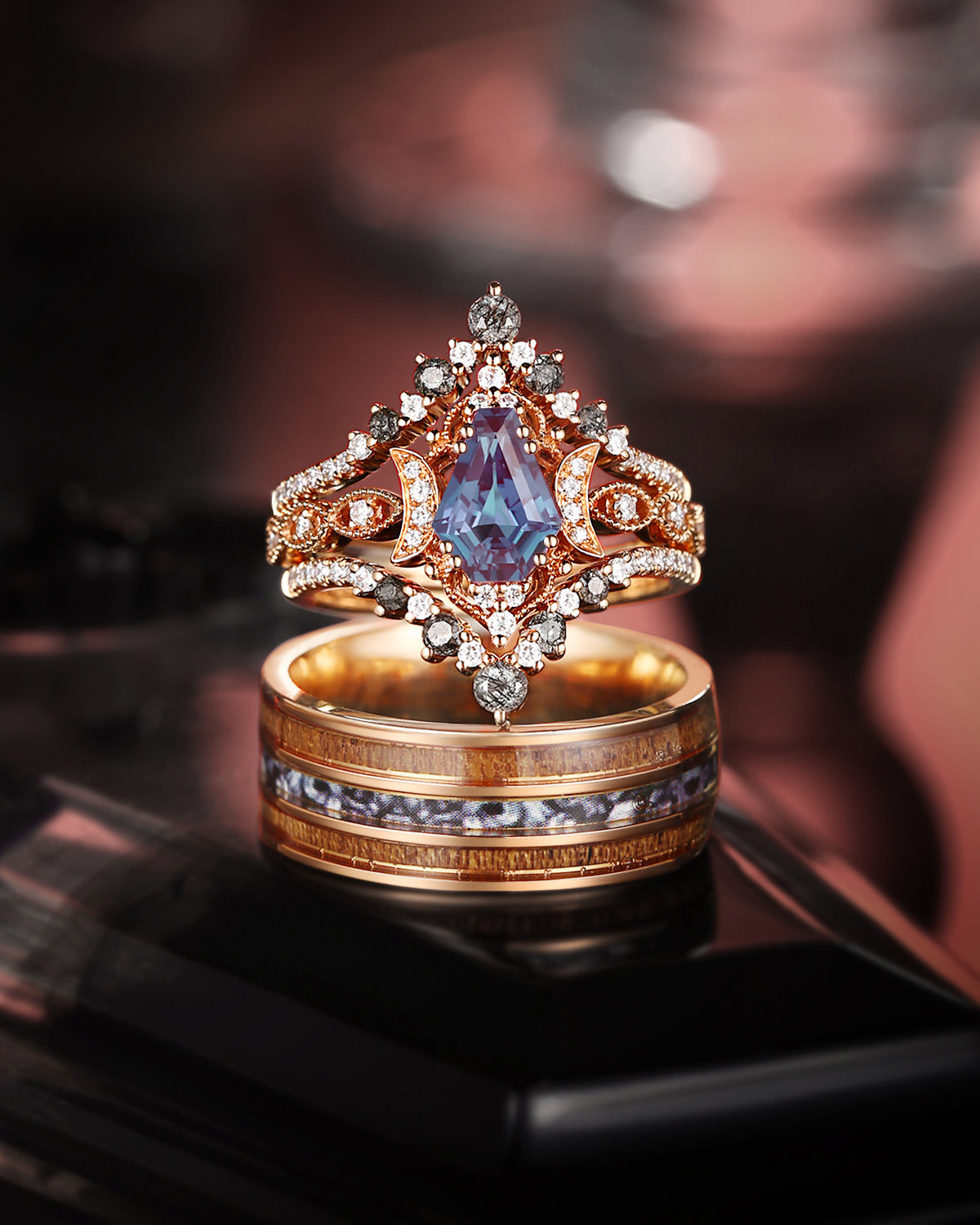 Art Deco Coffin ‘Blossom Moon' Couple Wedding Ring Set
