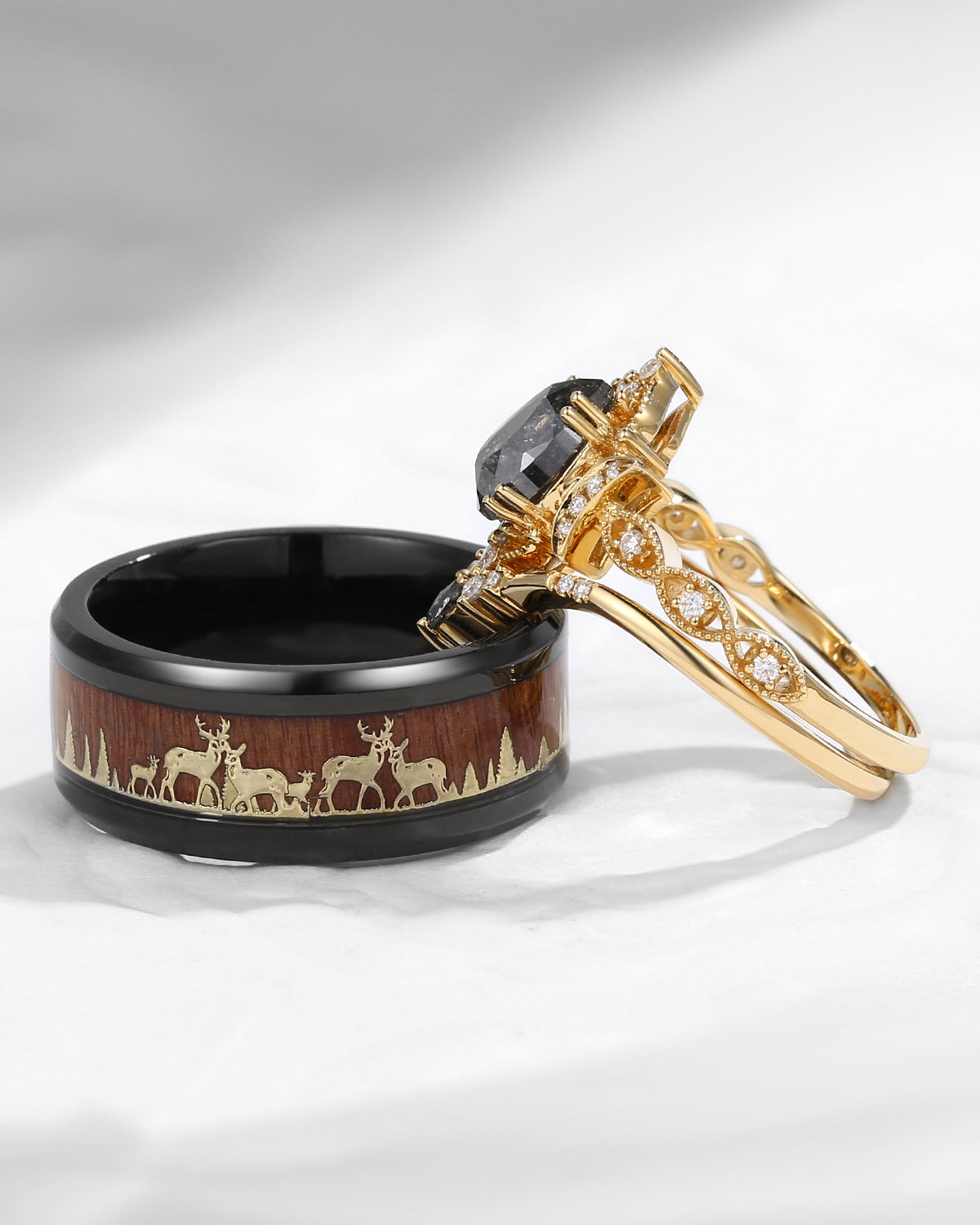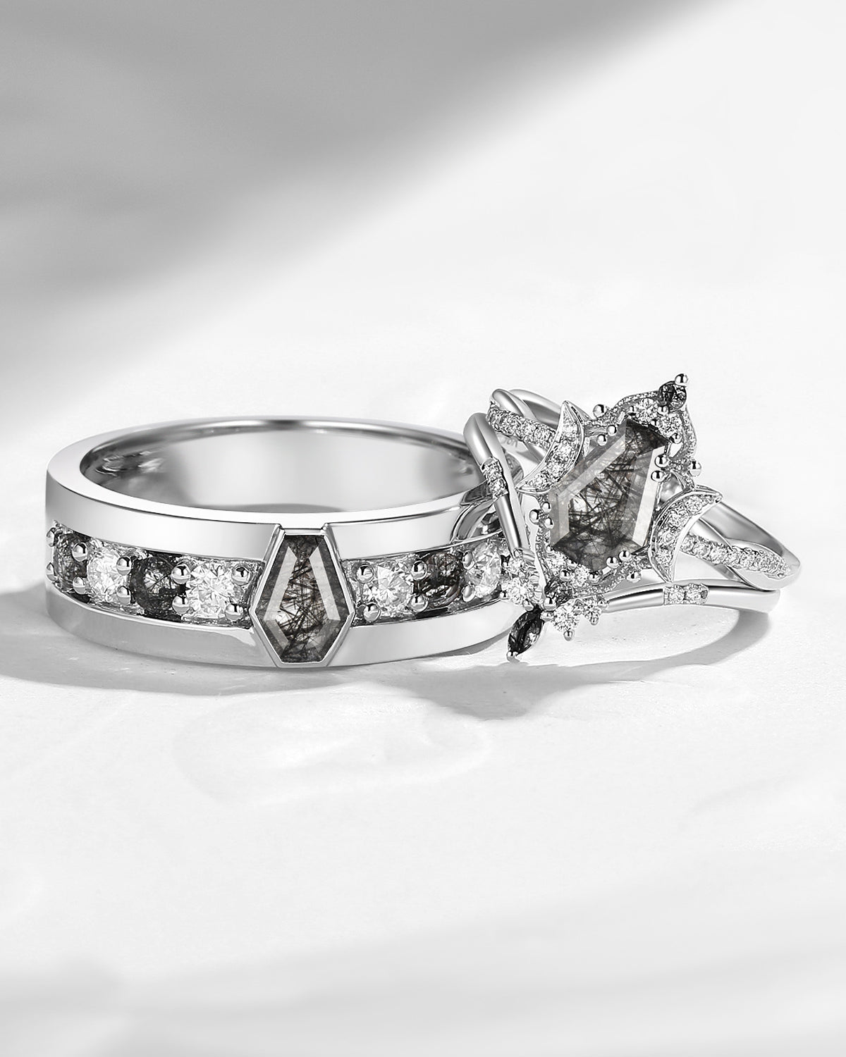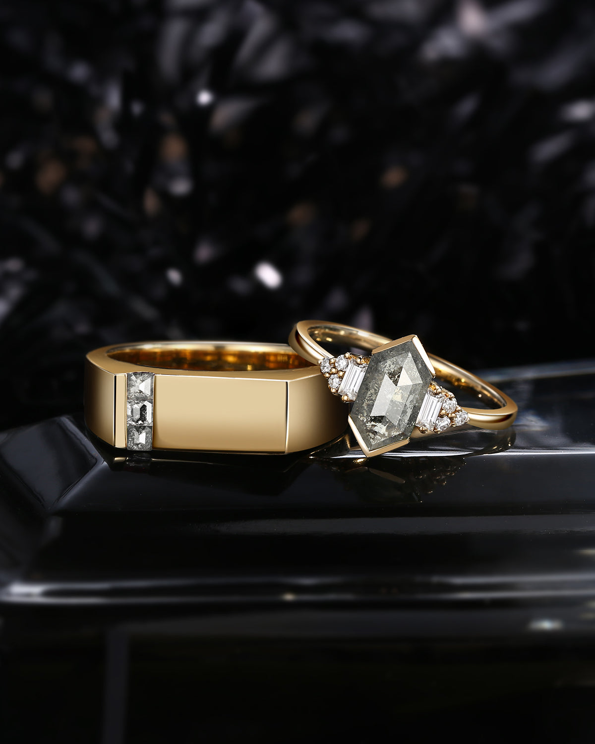 Vintage Long Hexagon Natural Salt And Pepper Diamond Couple Rings