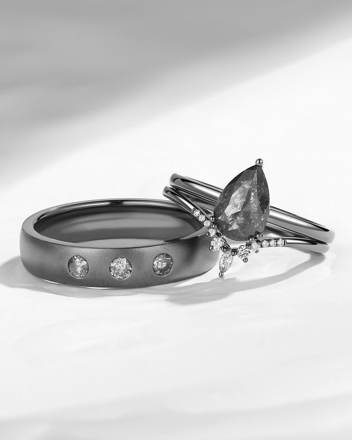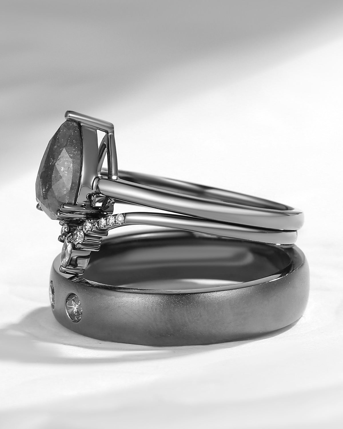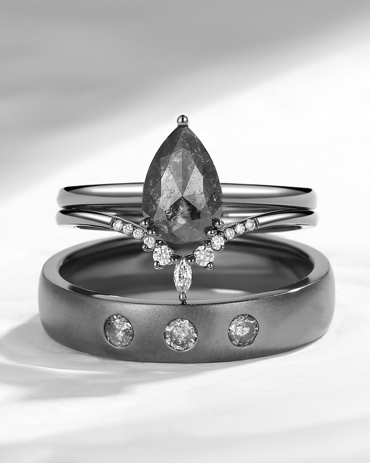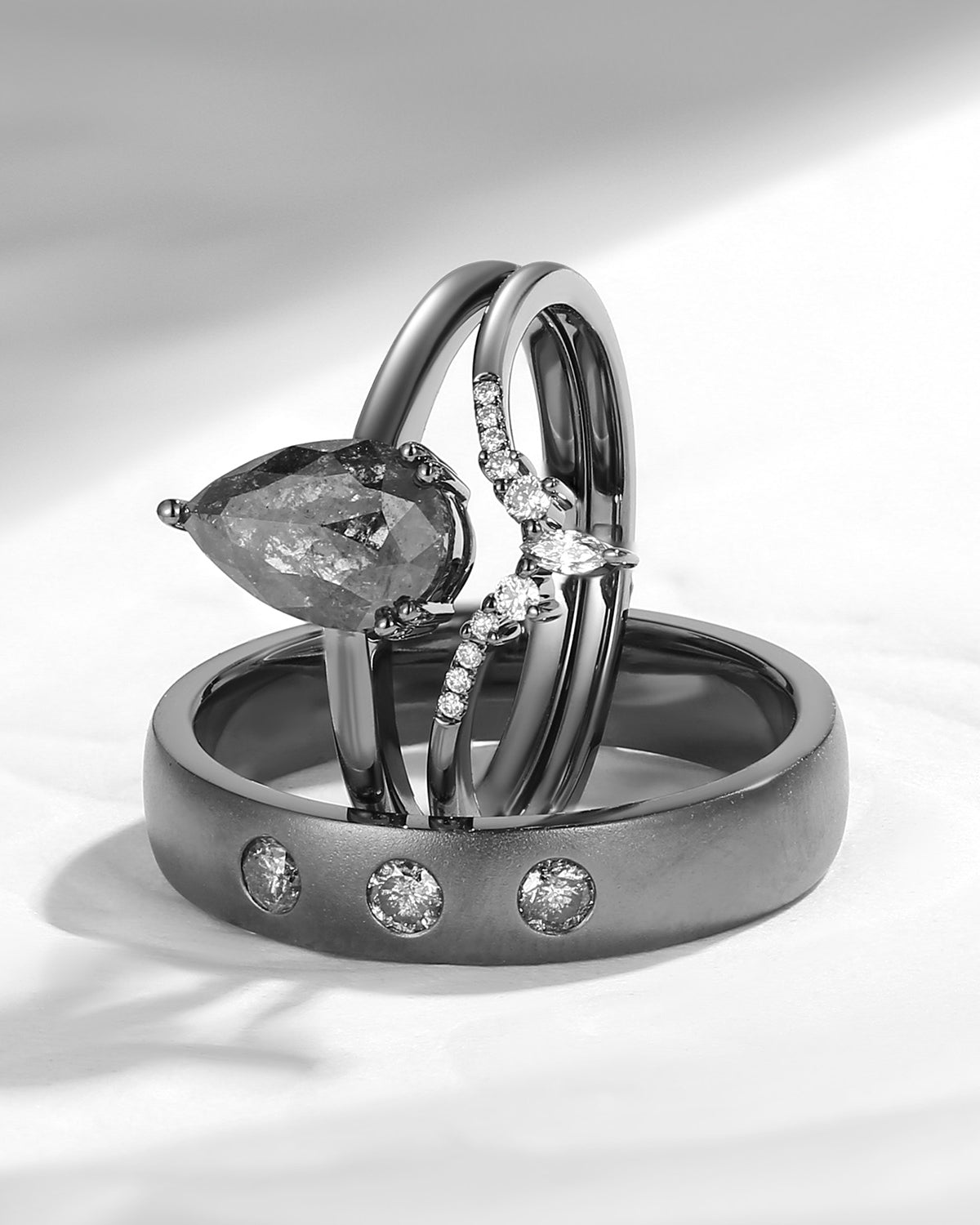 Textured Pear Shaped Salt And Pepper Diamond Couple Rings