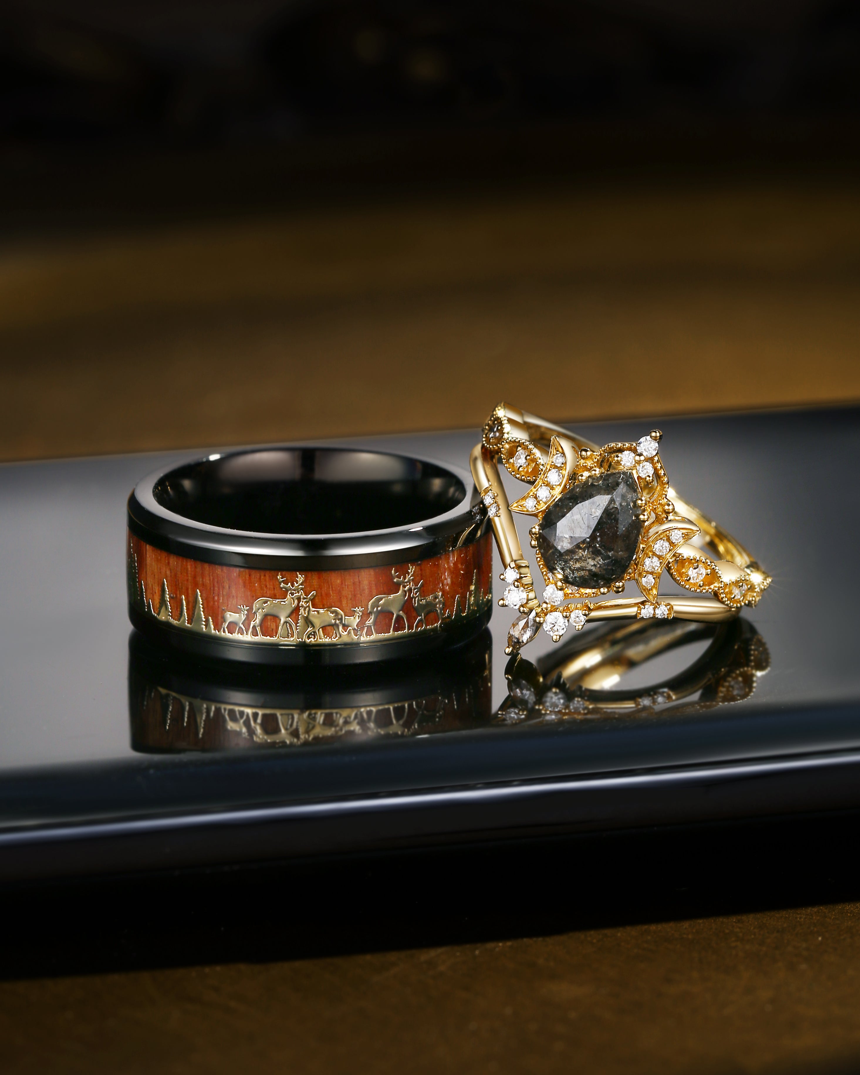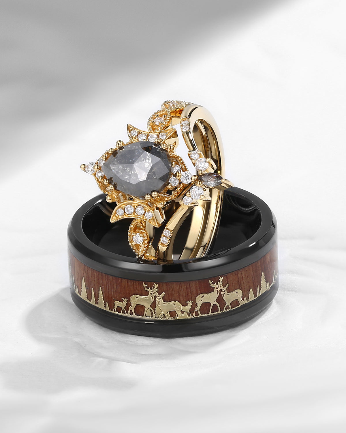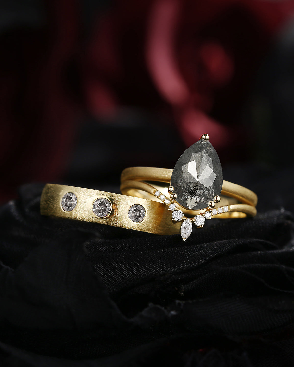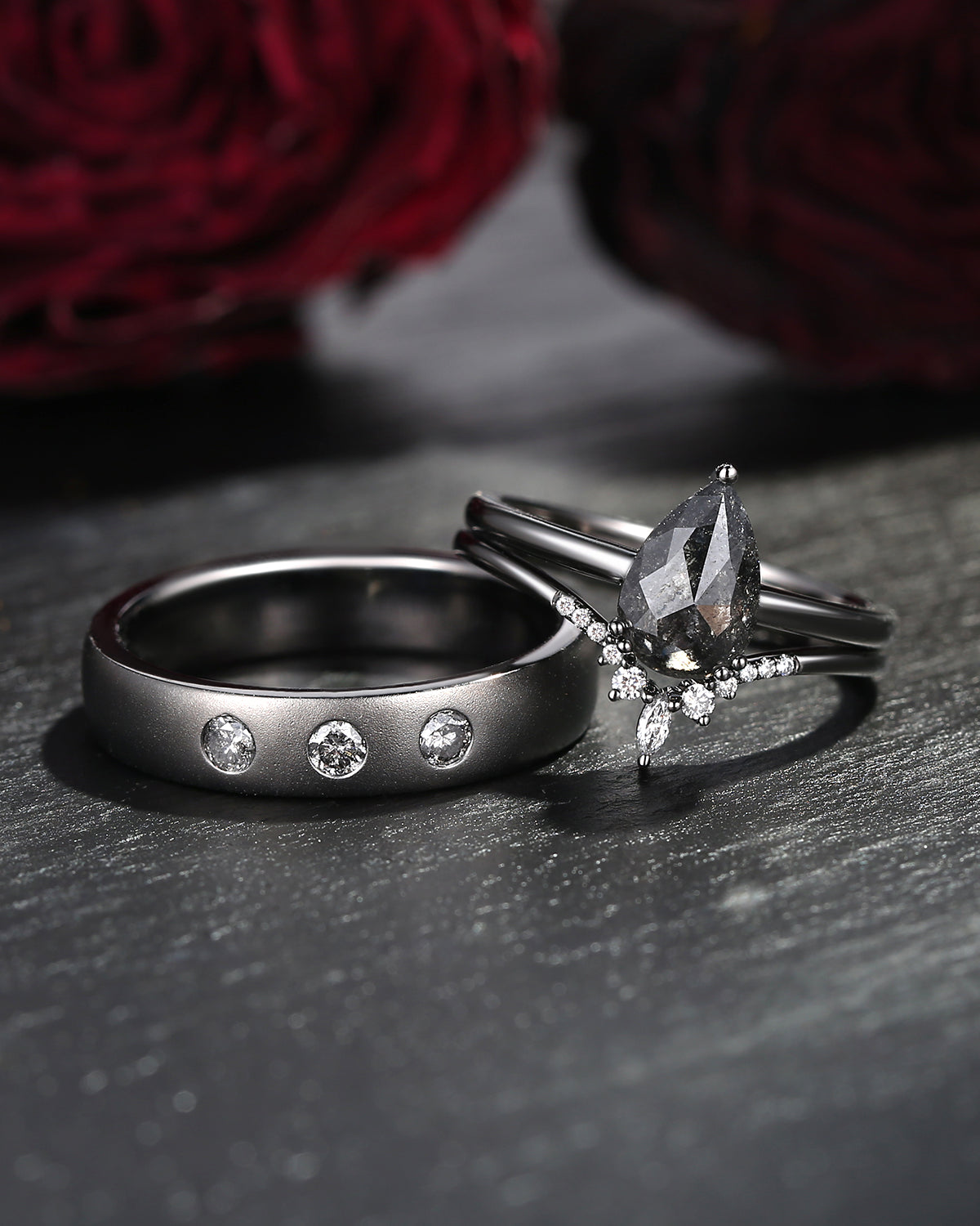 Textured Pear Shaped Salt And Pepper Diamond Couple Rings