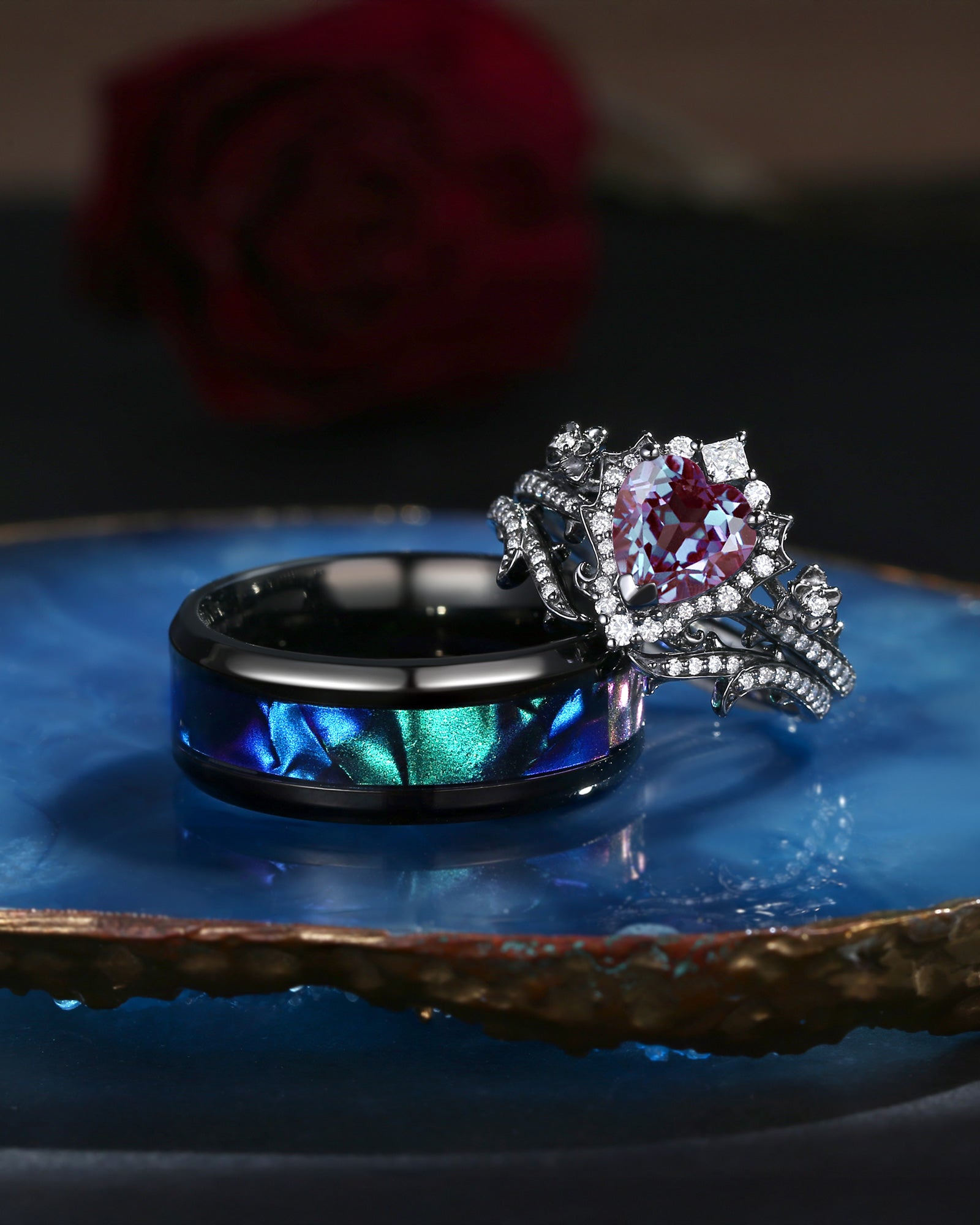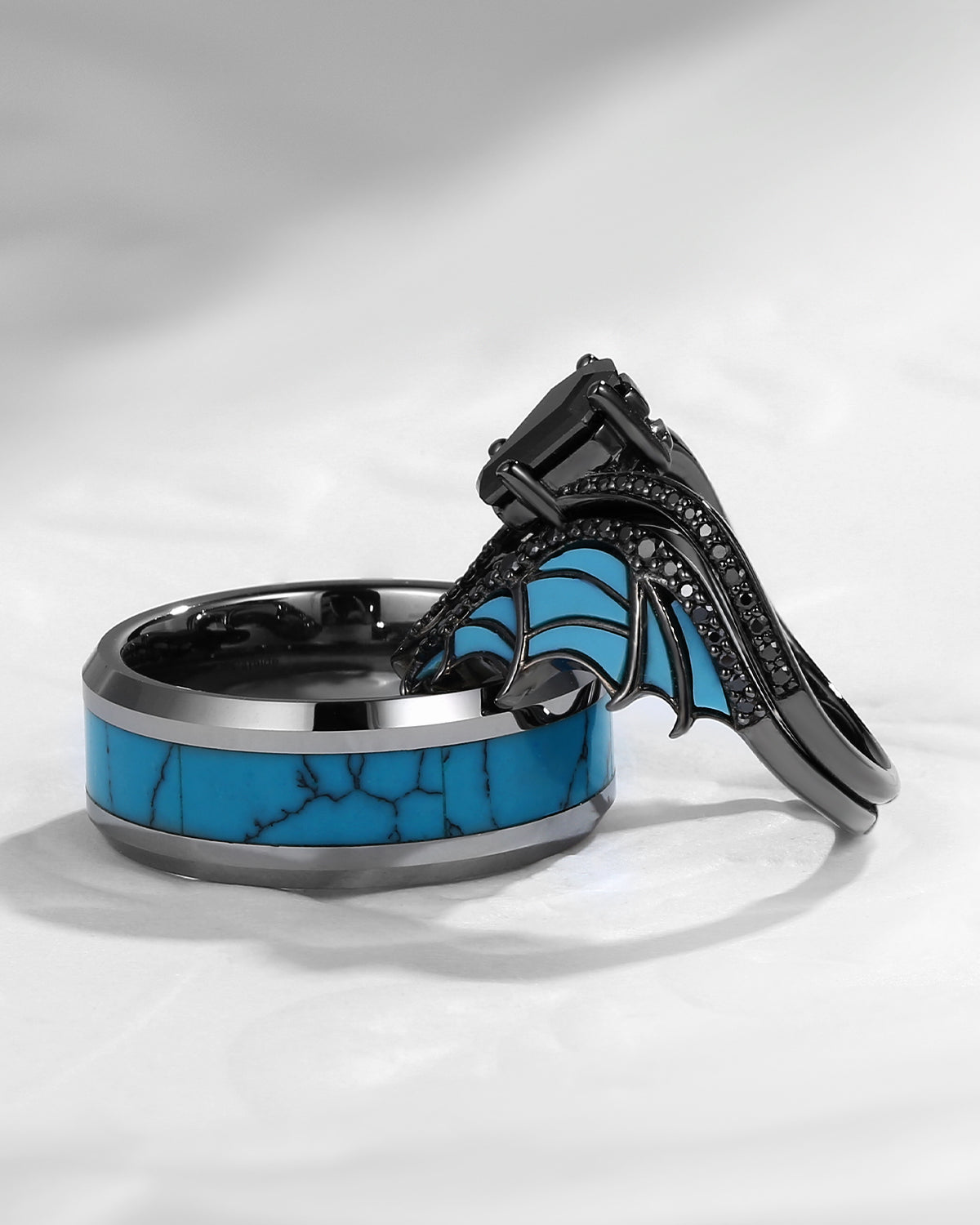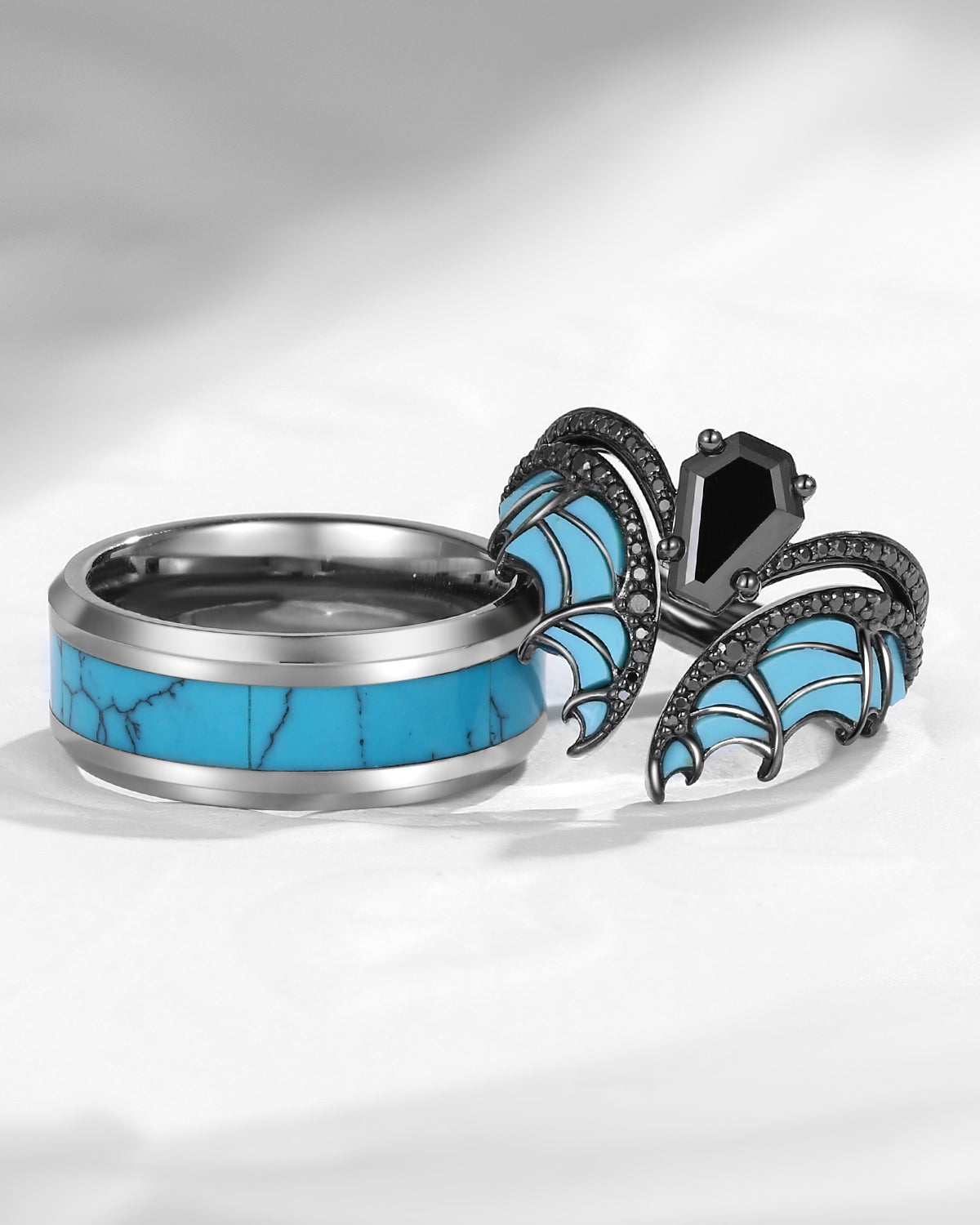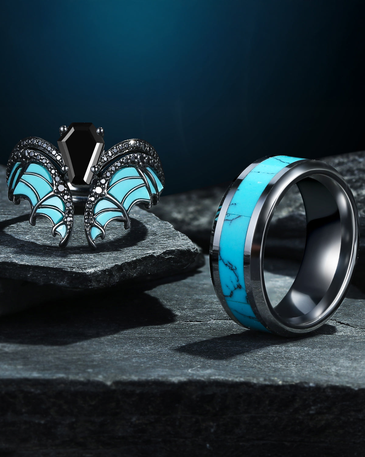 Bat Wing Inspired Coffin Black Moissanite Turquoise Couple Bridal Ring Set