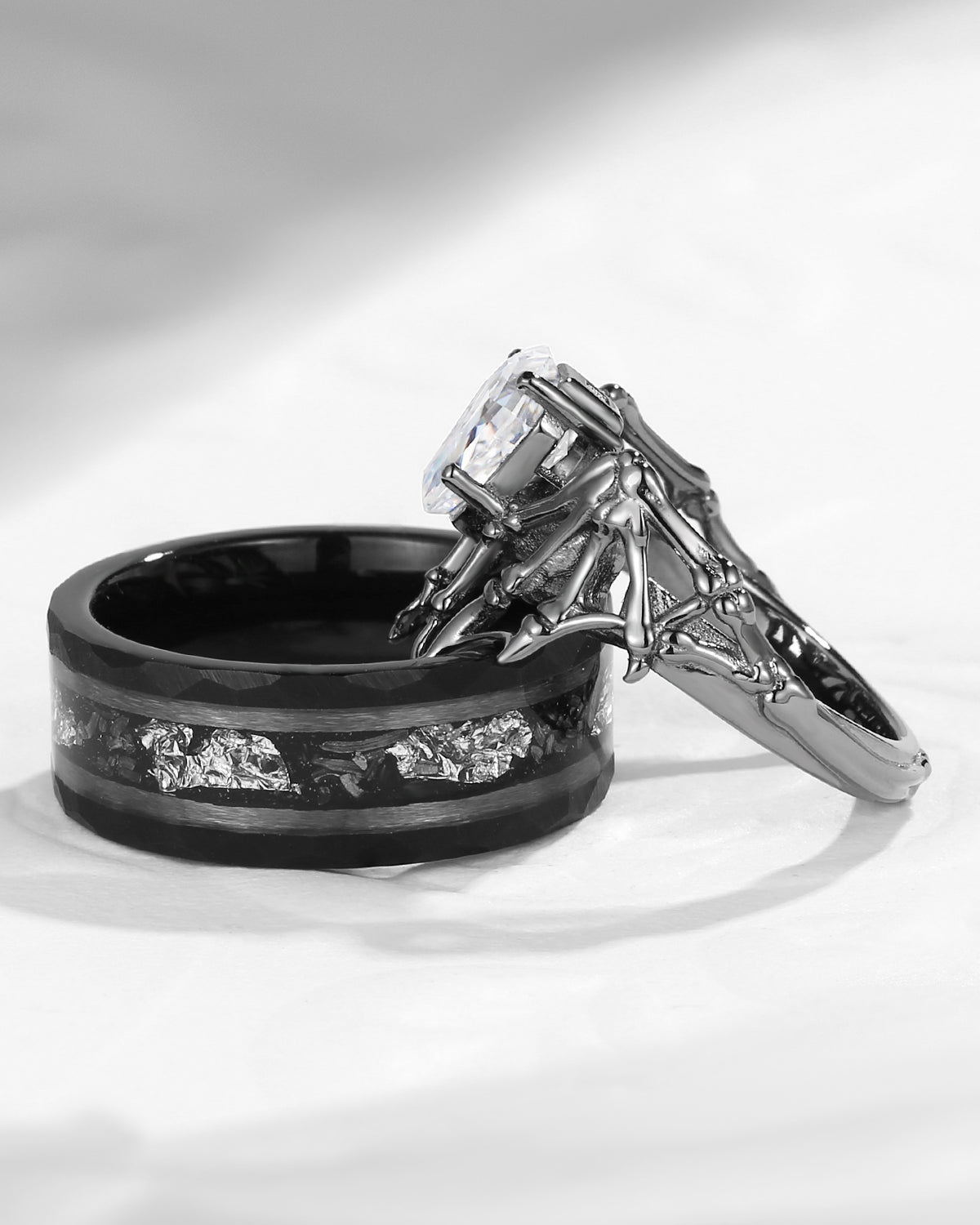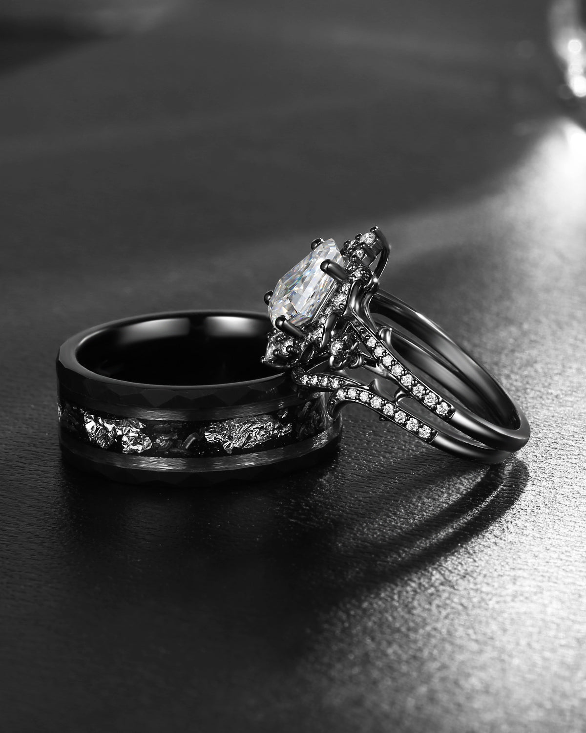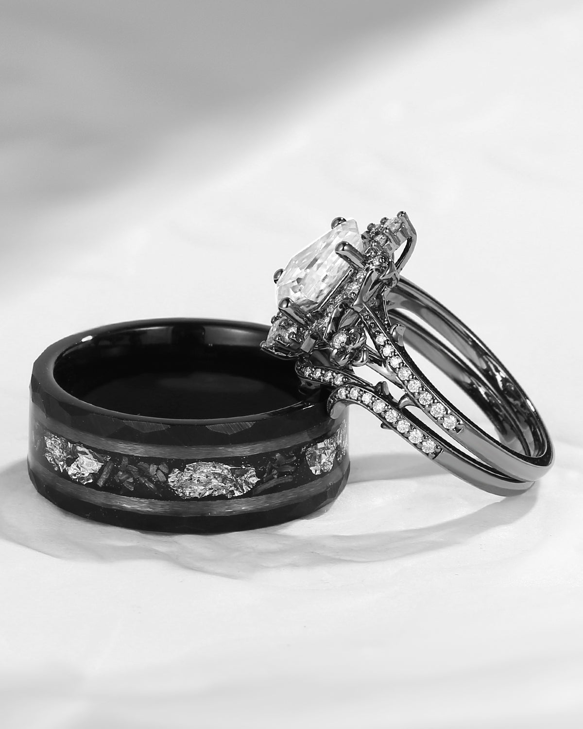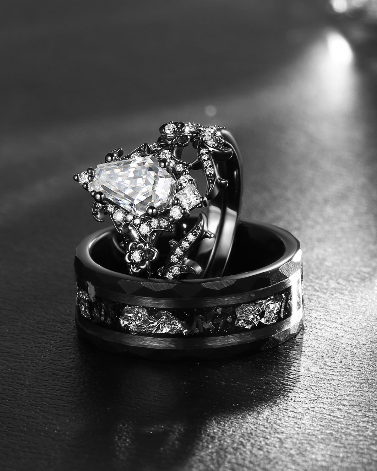 Coffin Cut Set Couple Wedding Ring Set - Till Death Do Us Apart