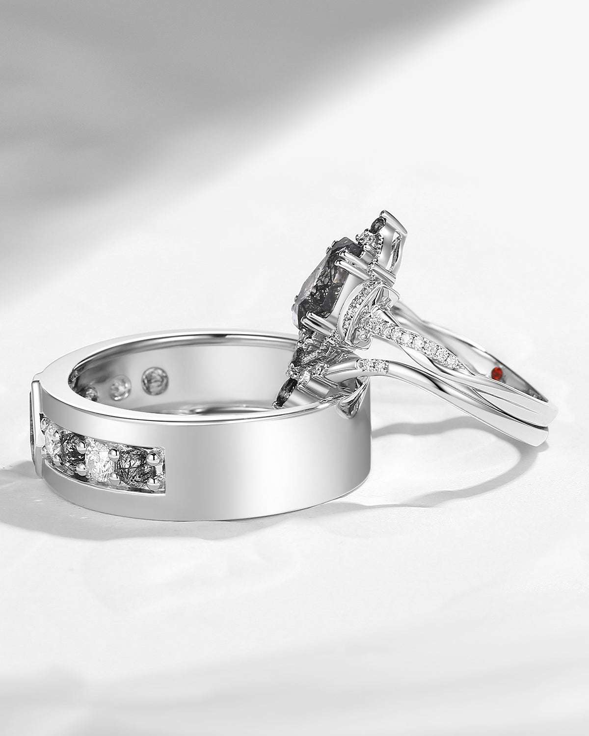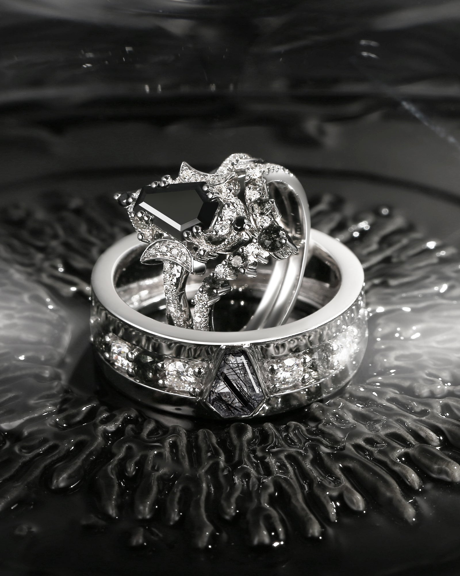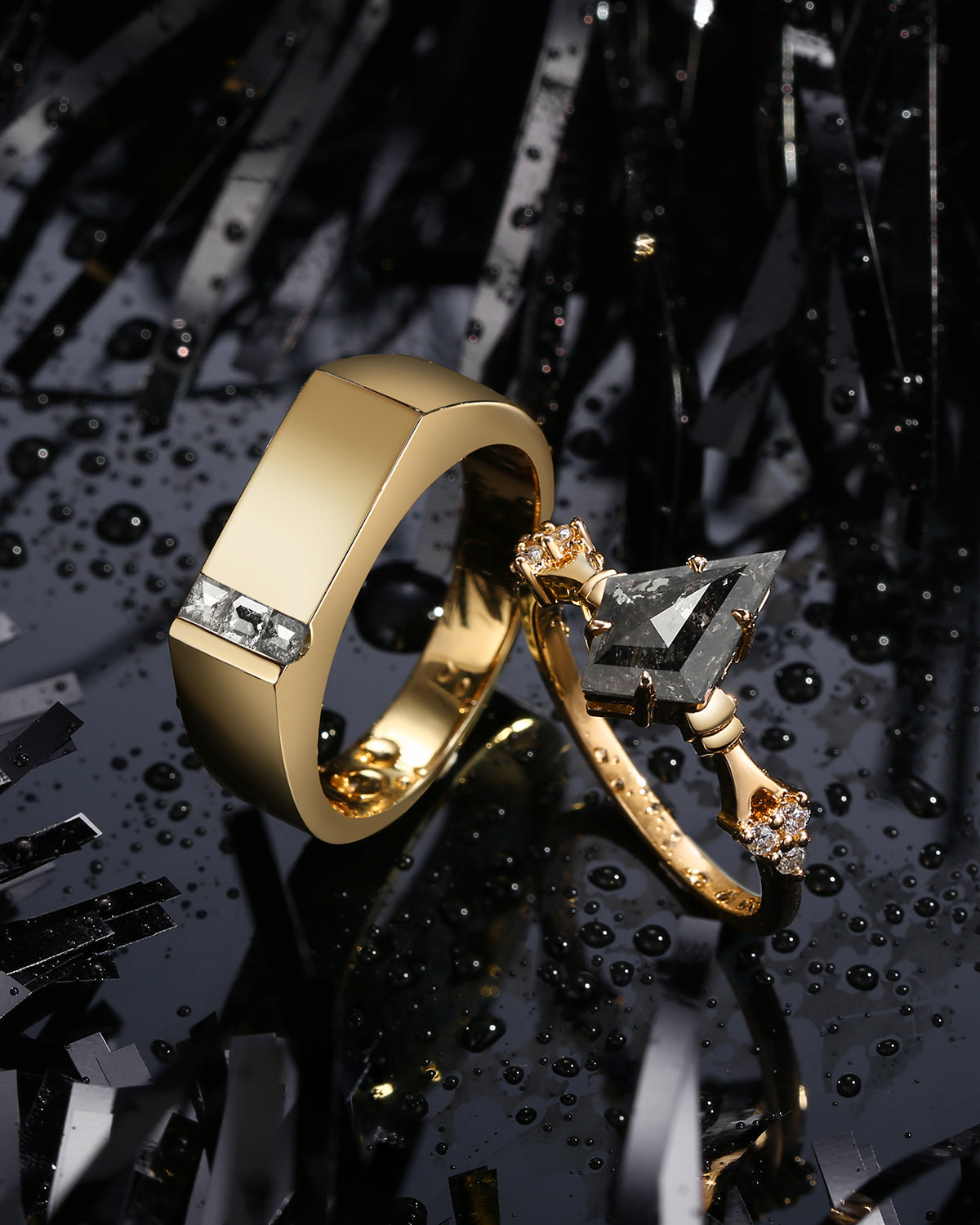 Art Deco Kite Cut Natural Salt And Pepper Diamond Couple Rings