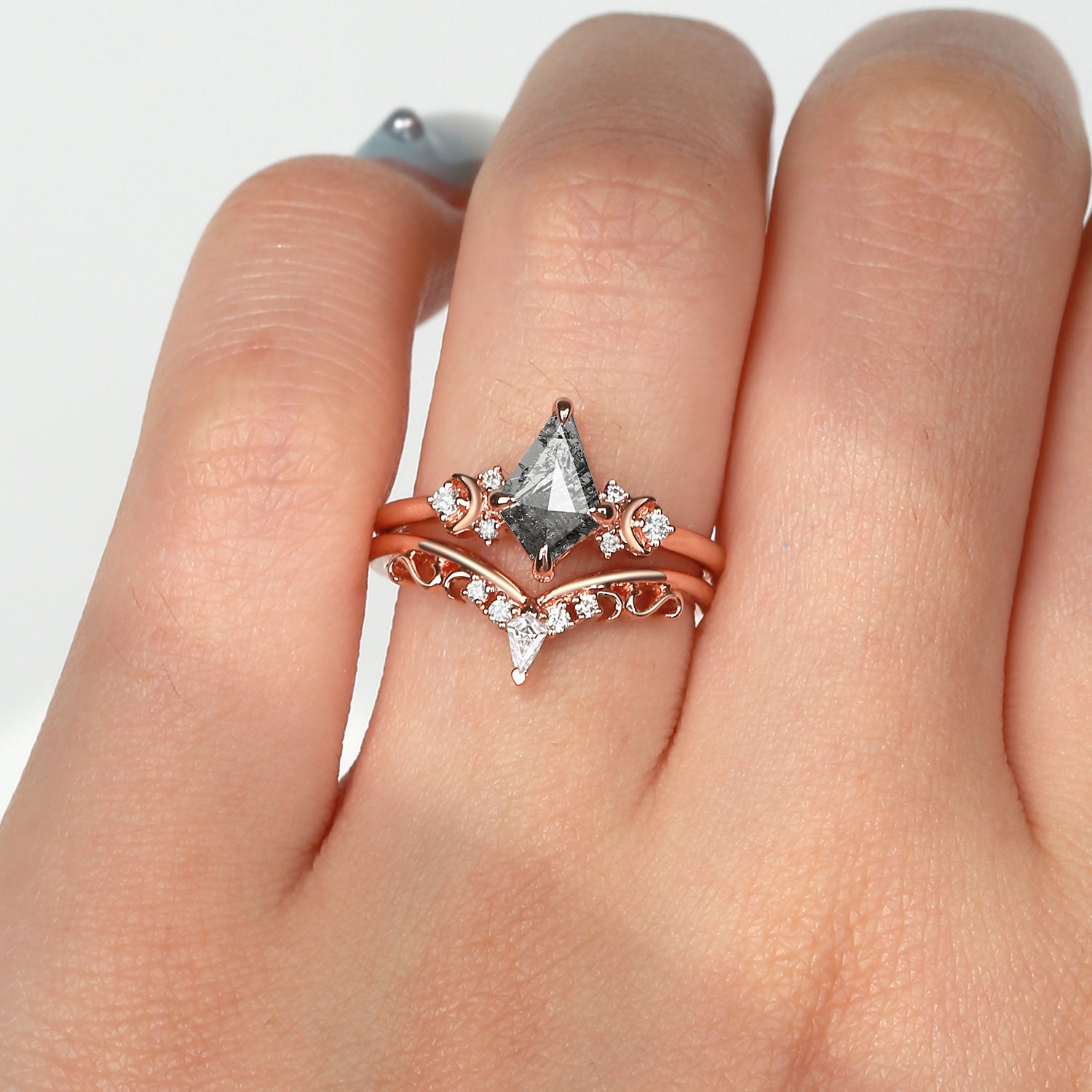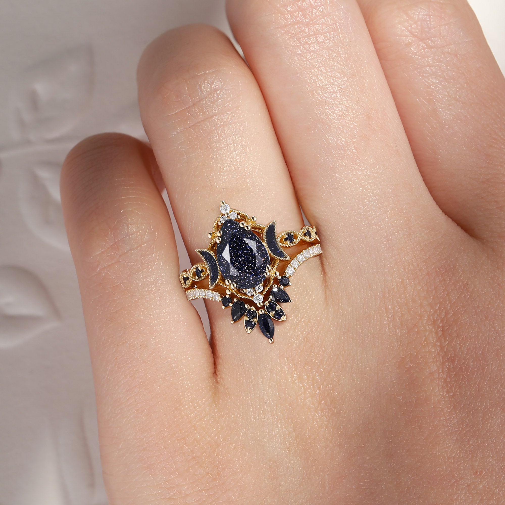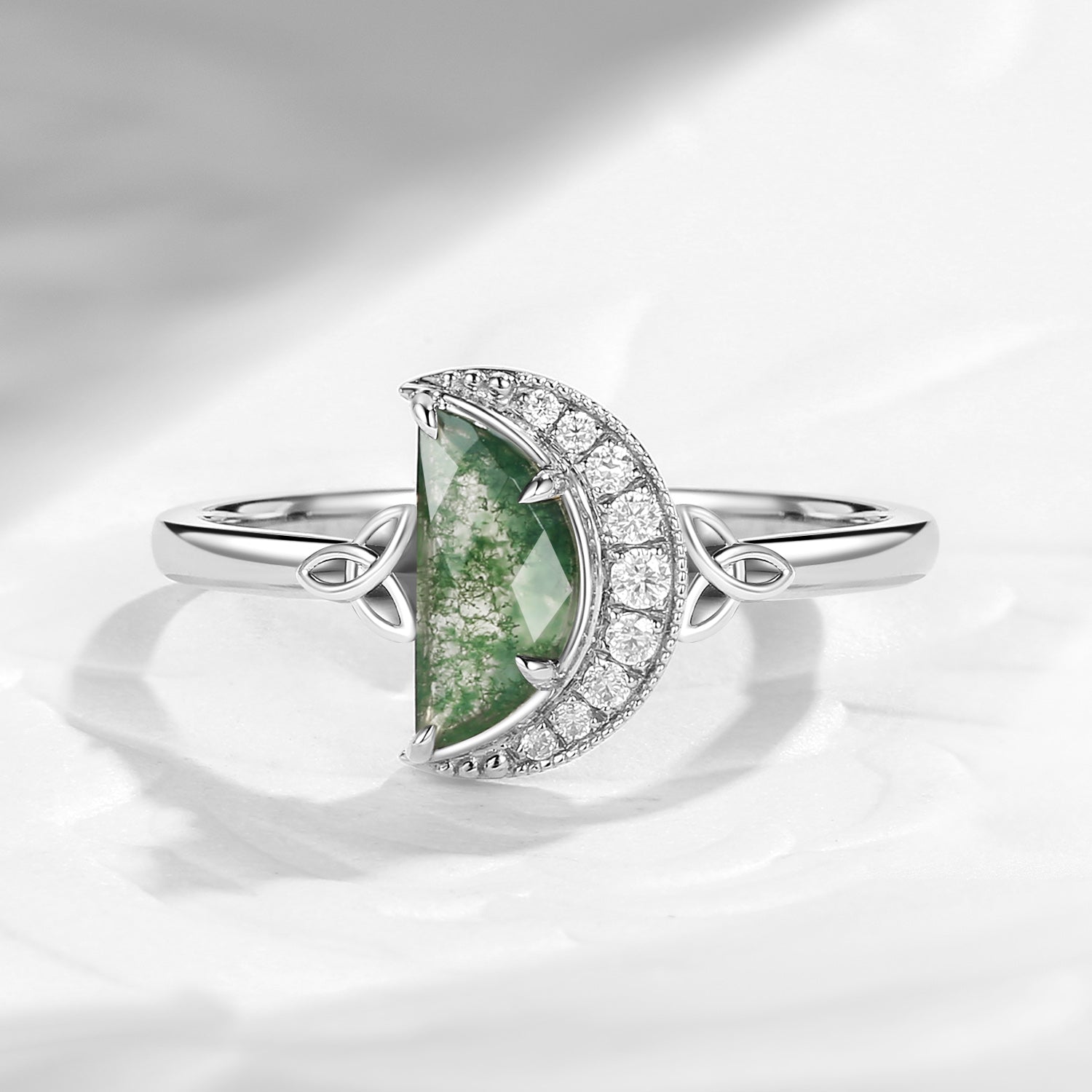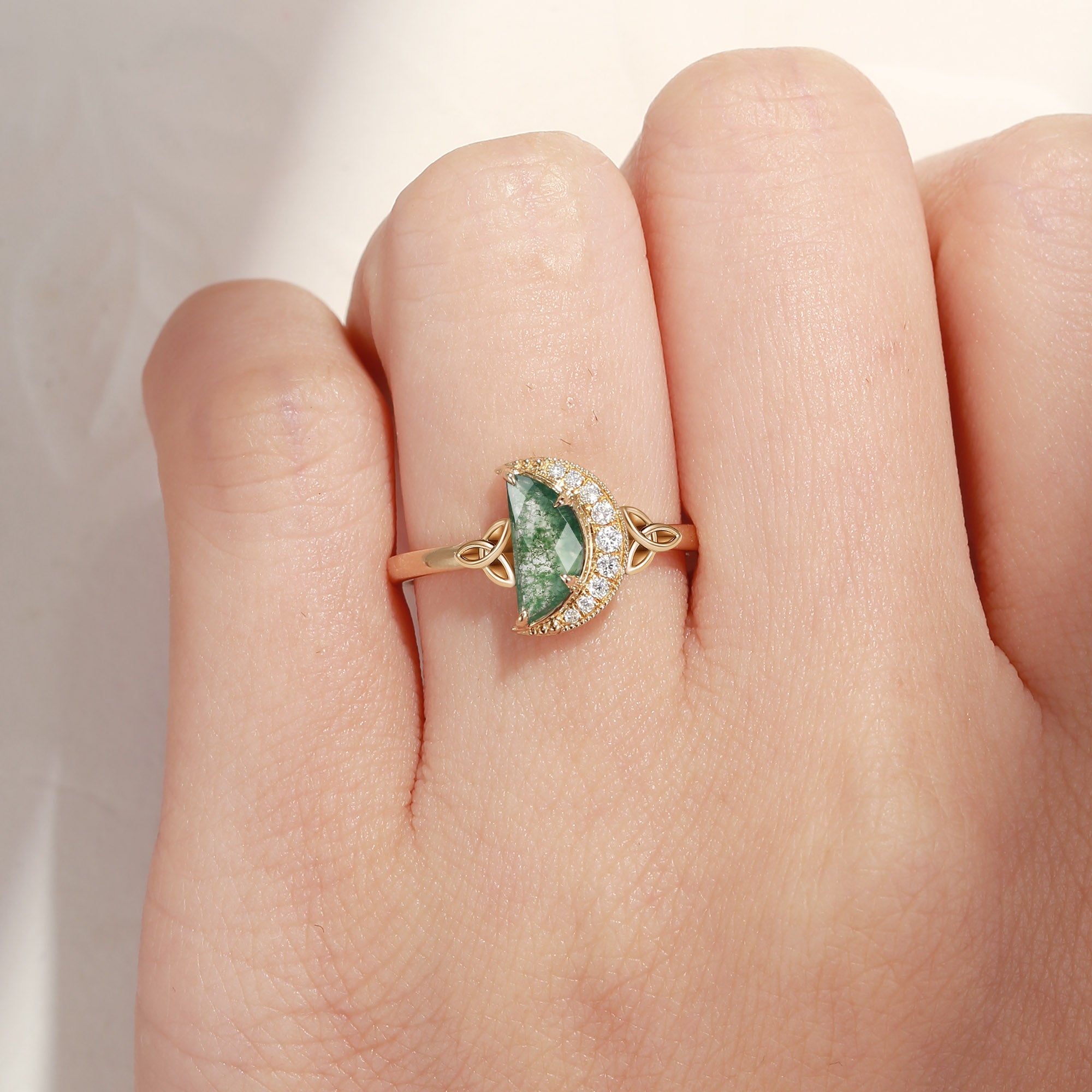The new moon is often symbolic of new beginnings which this ring personifies for a couple starting their new life together. The crescent on the ring adorned with sparkling diamonds or other gemstones, like stars embellishing below the moon, making the ring both mystically charming and gorgeously radiant. This crescent shape ring is an ideal choice for a proposal or even daily wear, showcasing the wearer's personality in a unique way and serves as a beautiful promise of the future. Crescent moon is our proudest design by far. The crescent moon ring represents a new beginning, a process of starting over and vitality. Each crescent moon engagement ring is as unique as it can get while preserving a wonderful balance between vintage vibes and simplicity. The crescent moon ring can be of different shapes and different stone color even different side stones because here in StarlandUS, every one gets to create their own crescent moon, so as their own beginning.