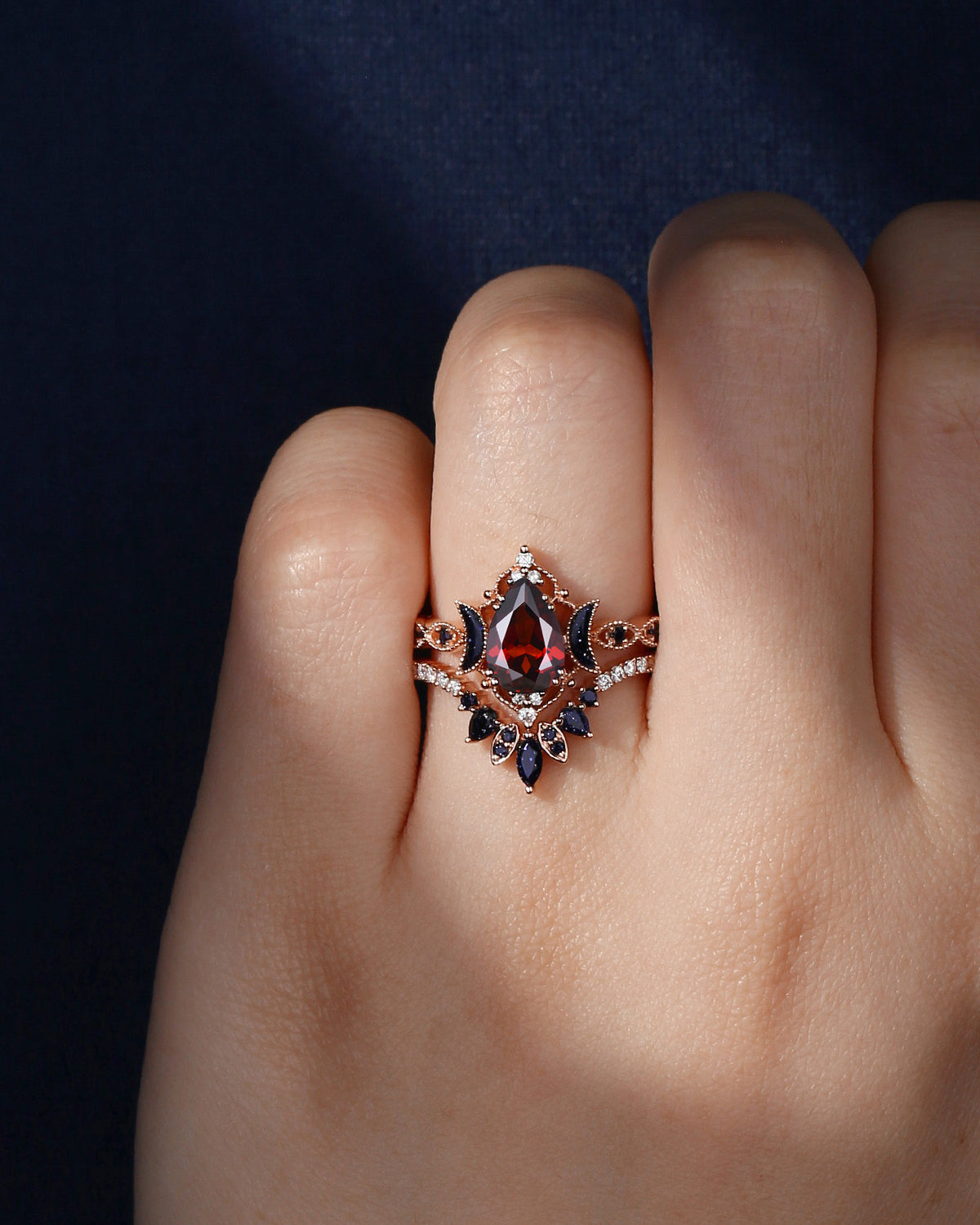 Crescent Moon | Unique Pear Shaped Garnet Engagement Ring 3pcs