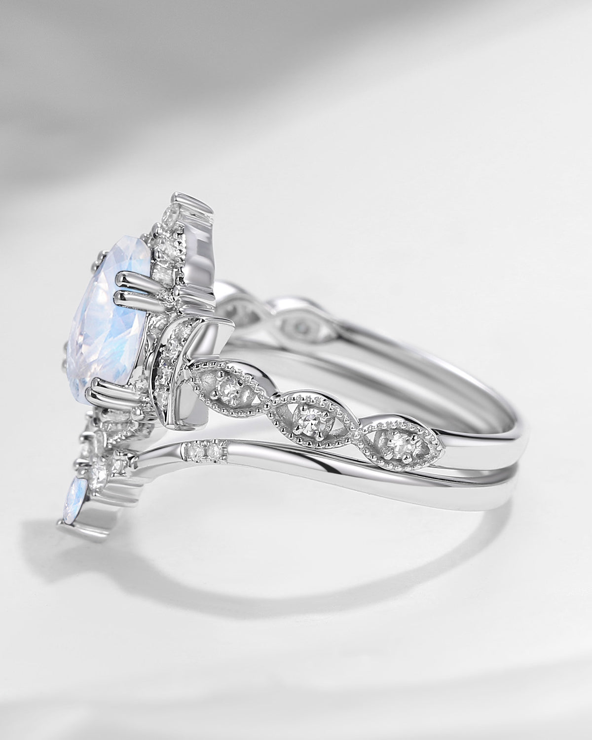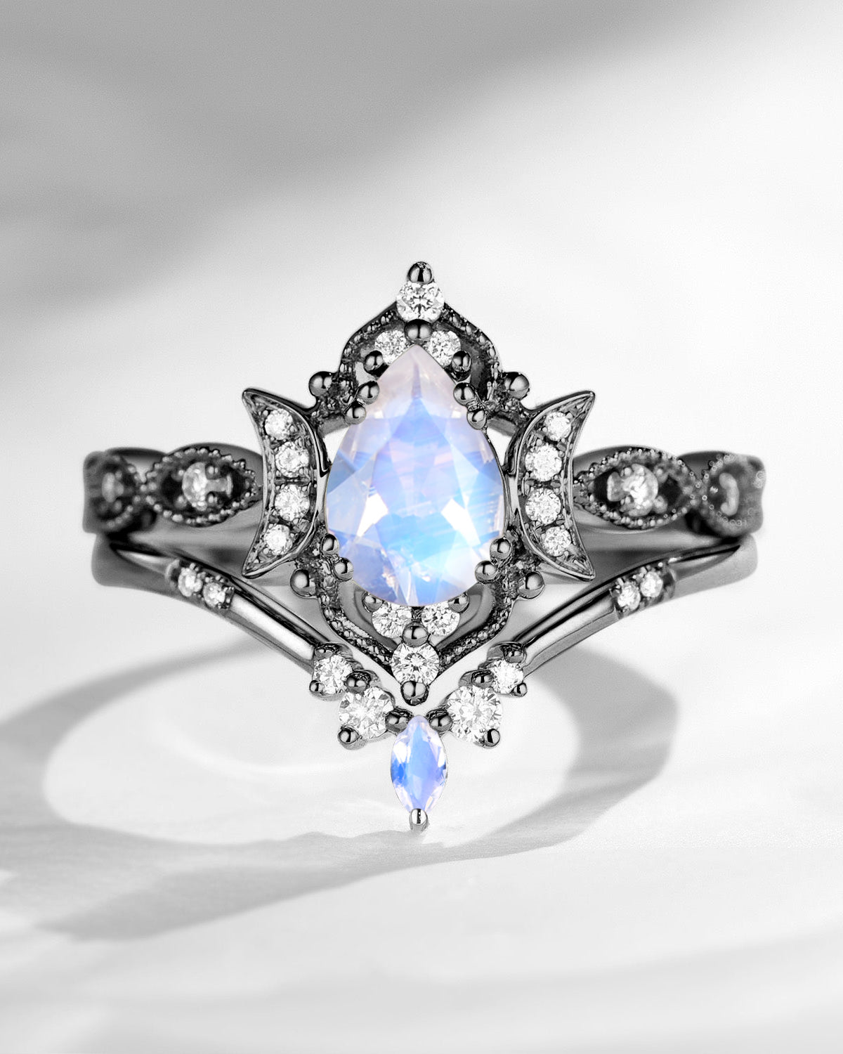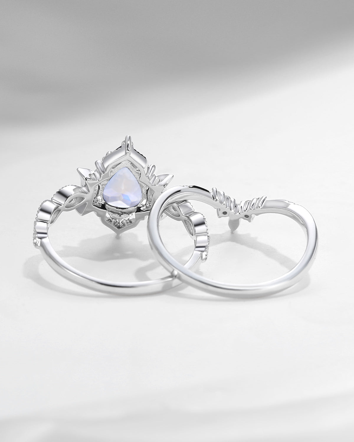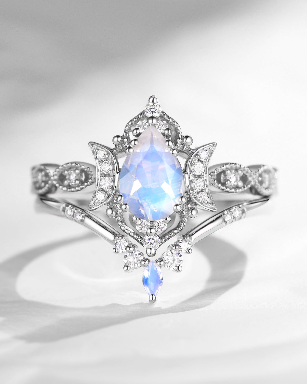 Crescent Moon | Vintage Pear Cut Moonstone Engagement Ring 2pcs - Luna