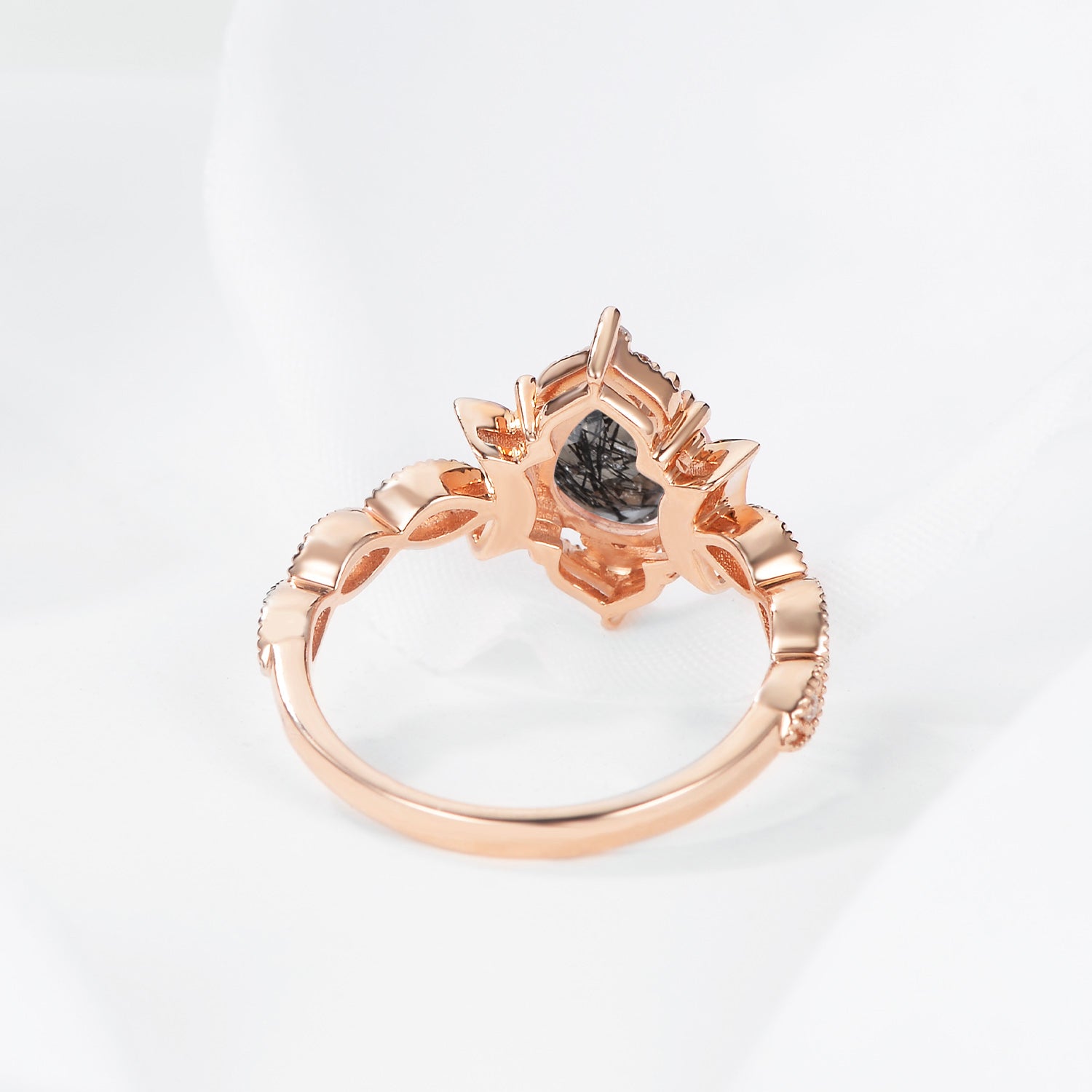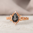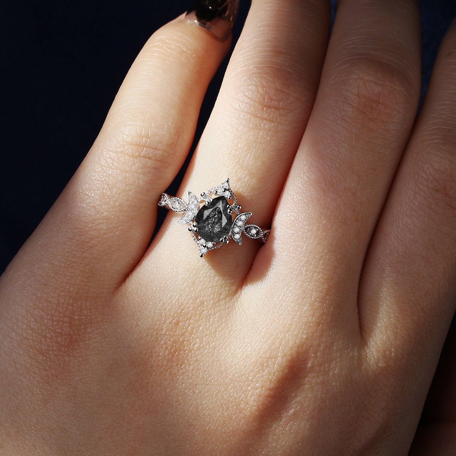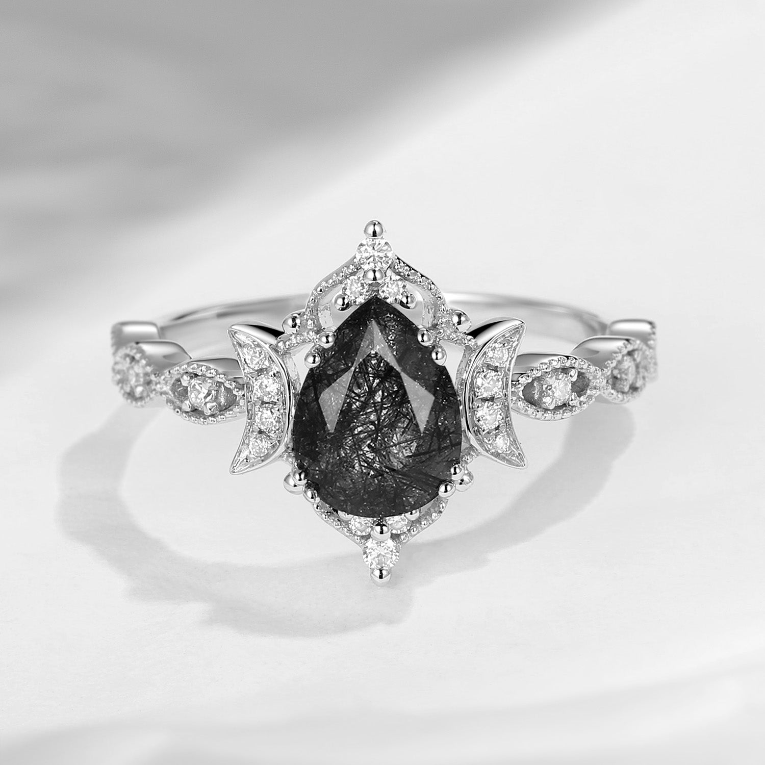 Crescent Moon | Antique Pear Cut Black Rutilated Quartz Engagement Ring