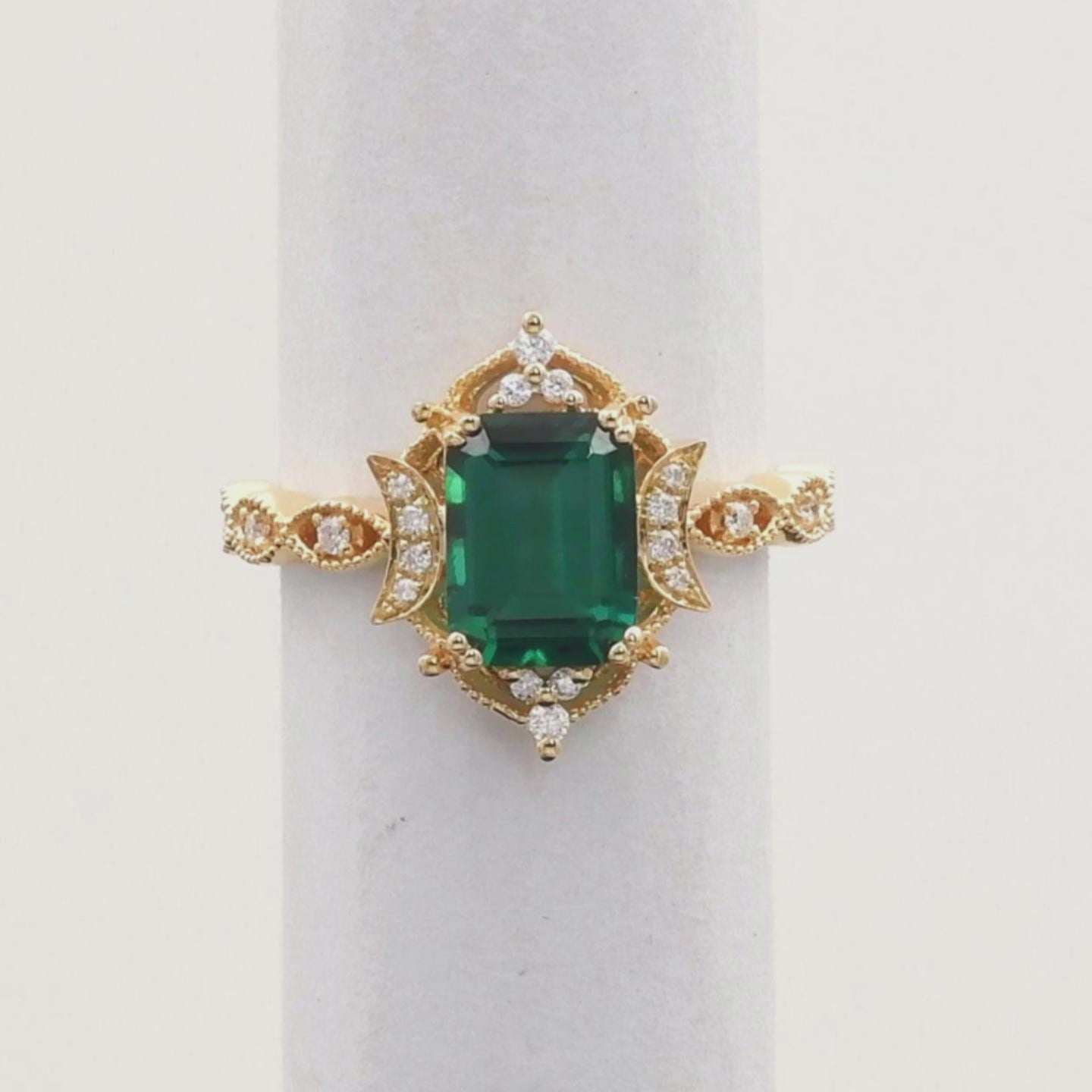 Crescent Moon | Art Deco Lab Emerald Engagement Ring Green Unique Moon Crescent May Birthstone Unique Art Deco Flower Anniversary