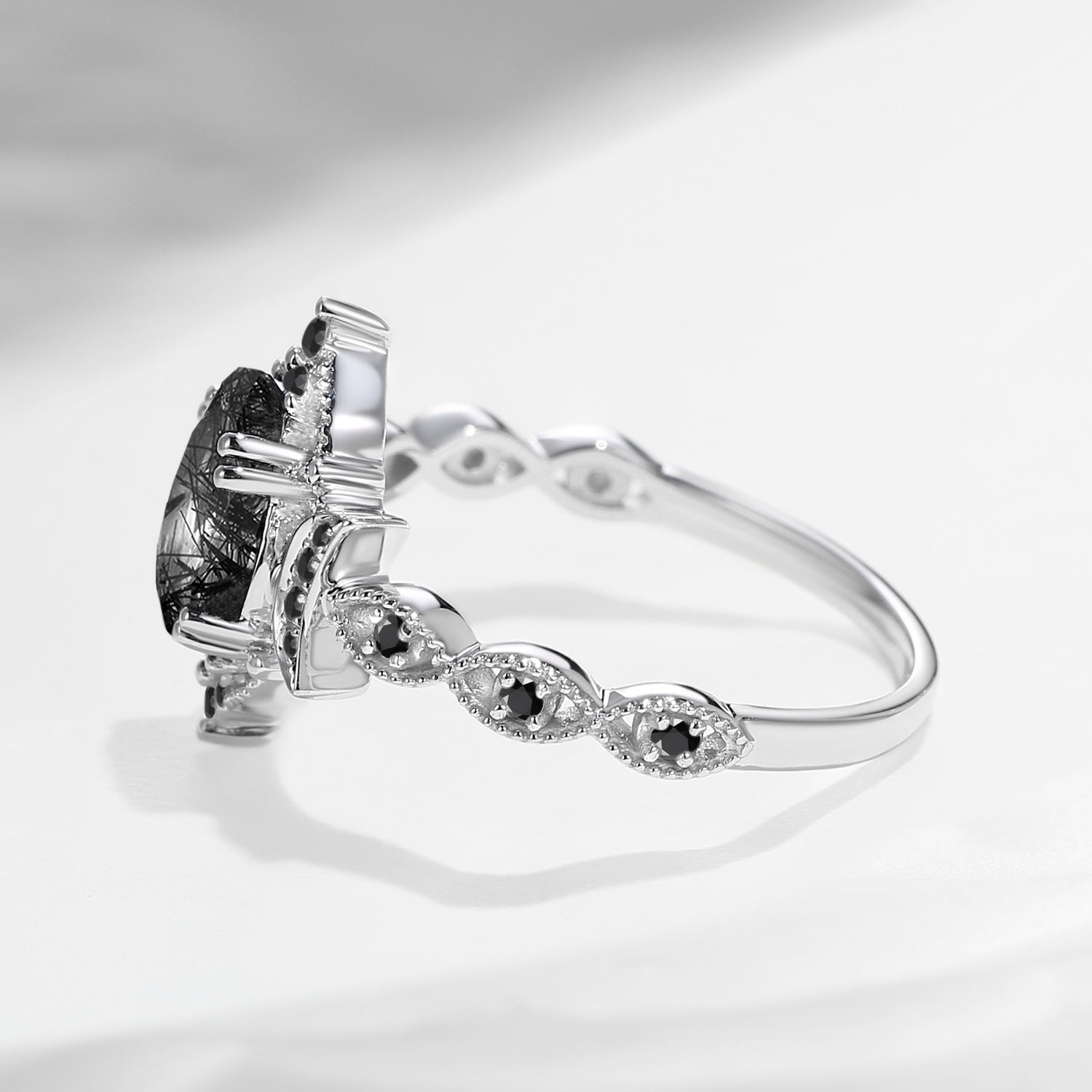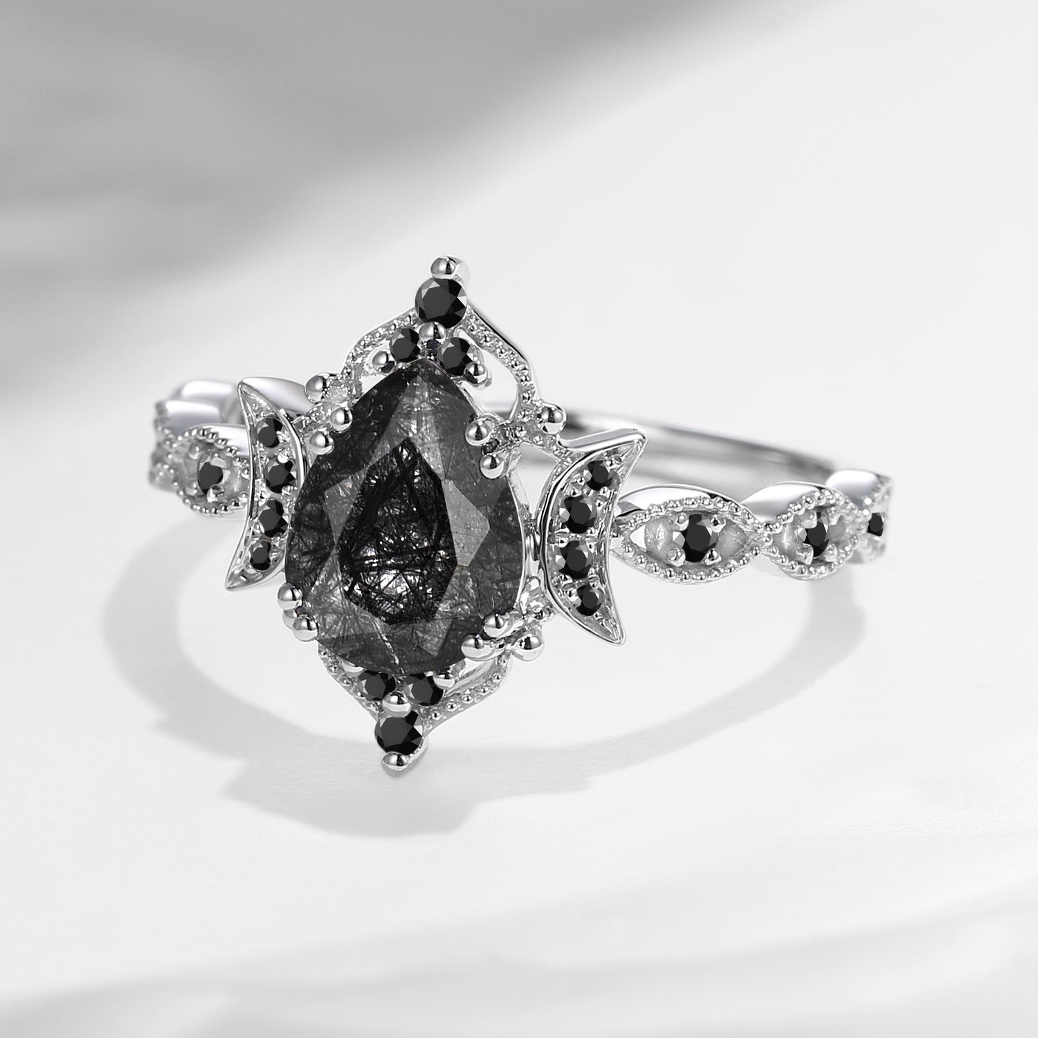 Antique Black Rutilated Quartz Engagement Ring Black Rutilated Quartz Engagement Ring Black Moissanite Ring Unique Moon Ring