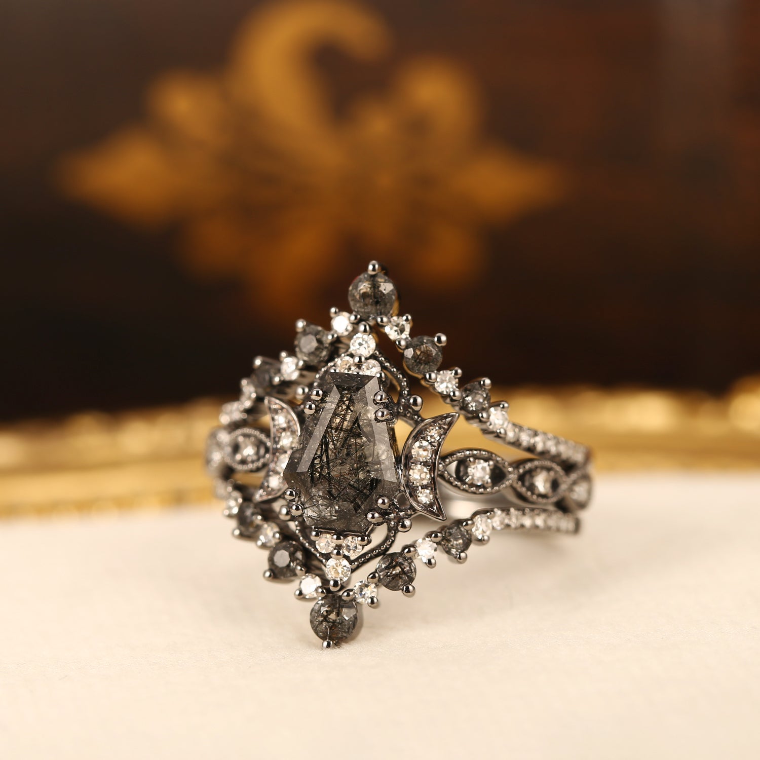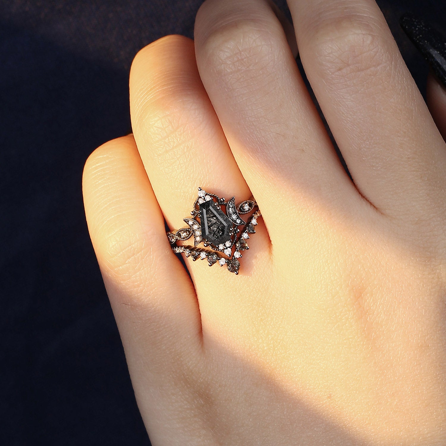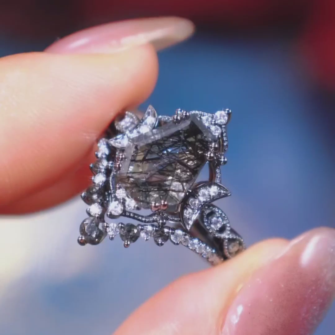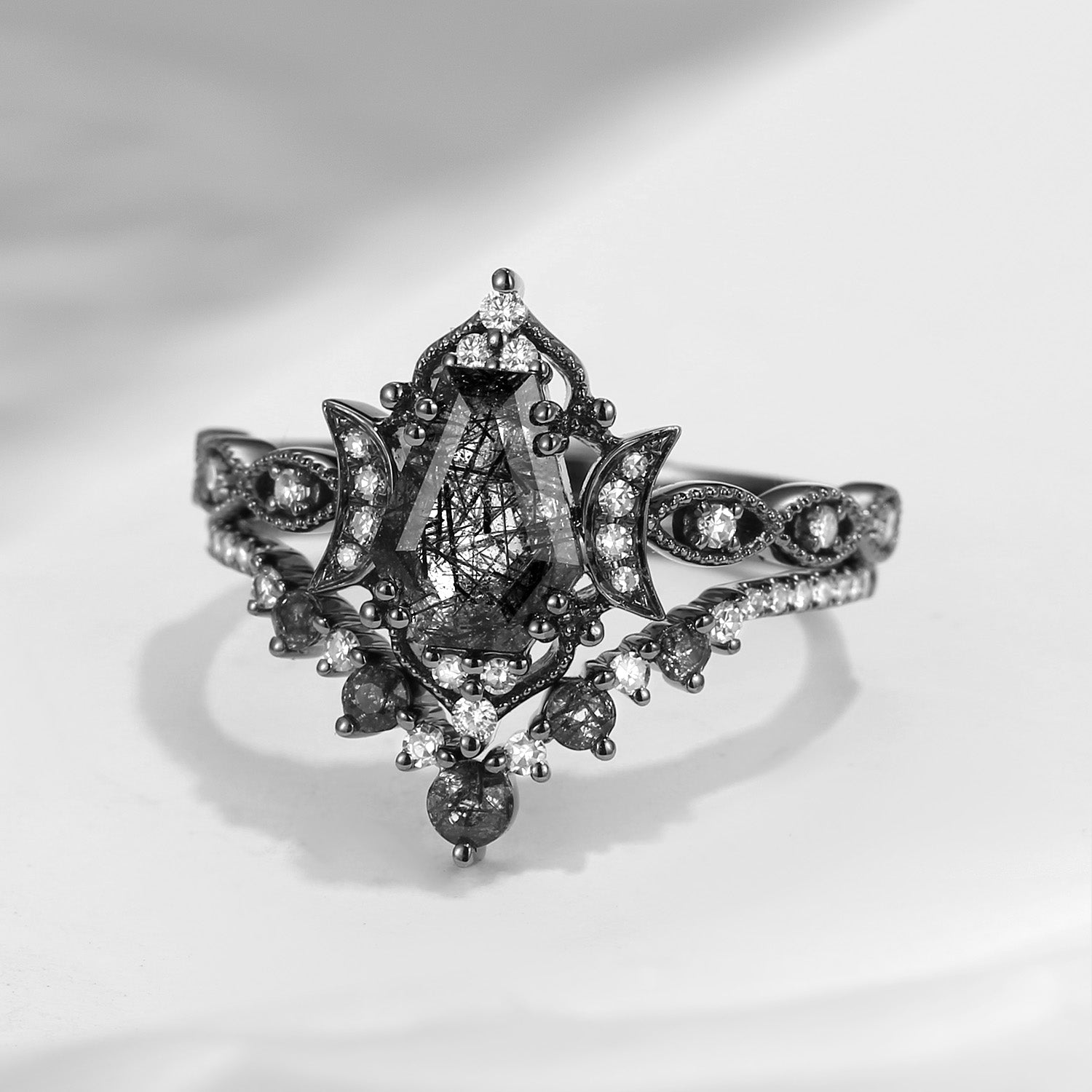 Crescent Moon | Coffin Cut Black Rutilated Quartz 'Black Statement' Ring Set 2pcs