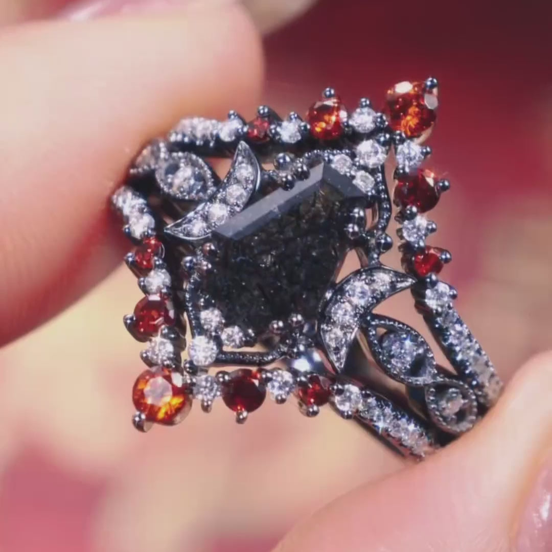 Crescent Moon | Coffin Cut Black Rutilated Quartz Garnet 'Black Statement' Ring Set 3pcs