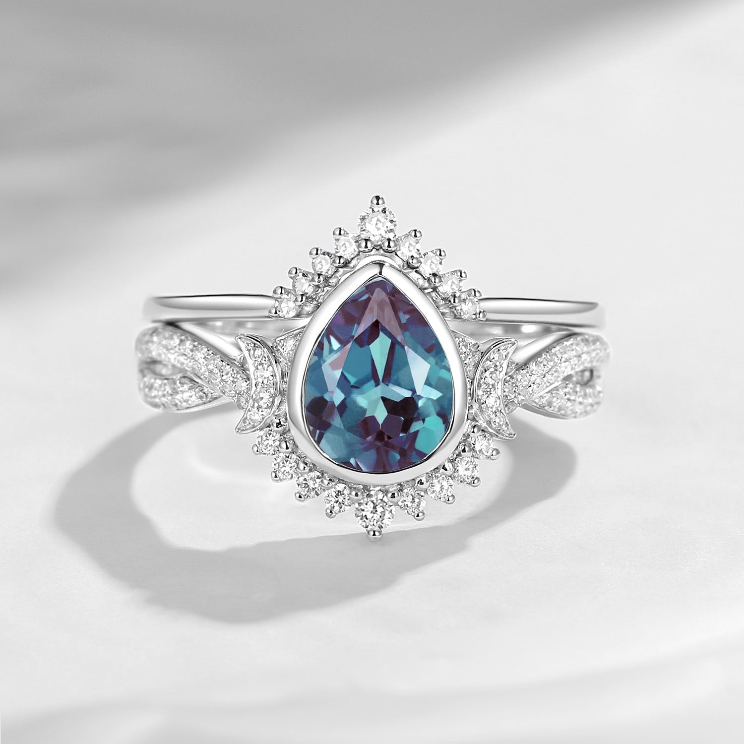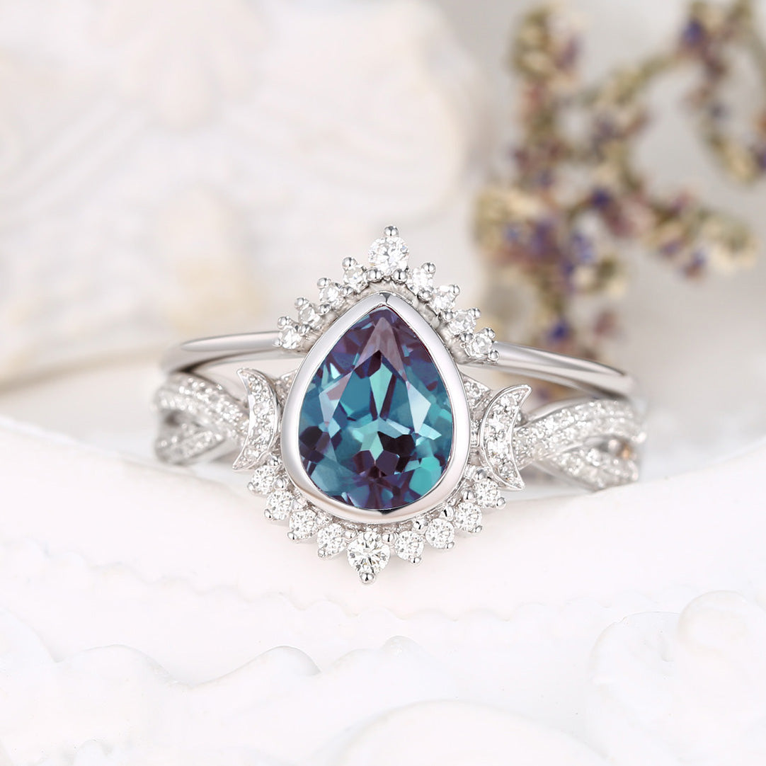 Pear Shaped Lab Alexandrite Ring Moon Crescent Engagement Ring White Gold Bridal Set 2pcs Bezel Set Cluster Cross Gift Unique Gift