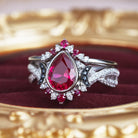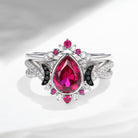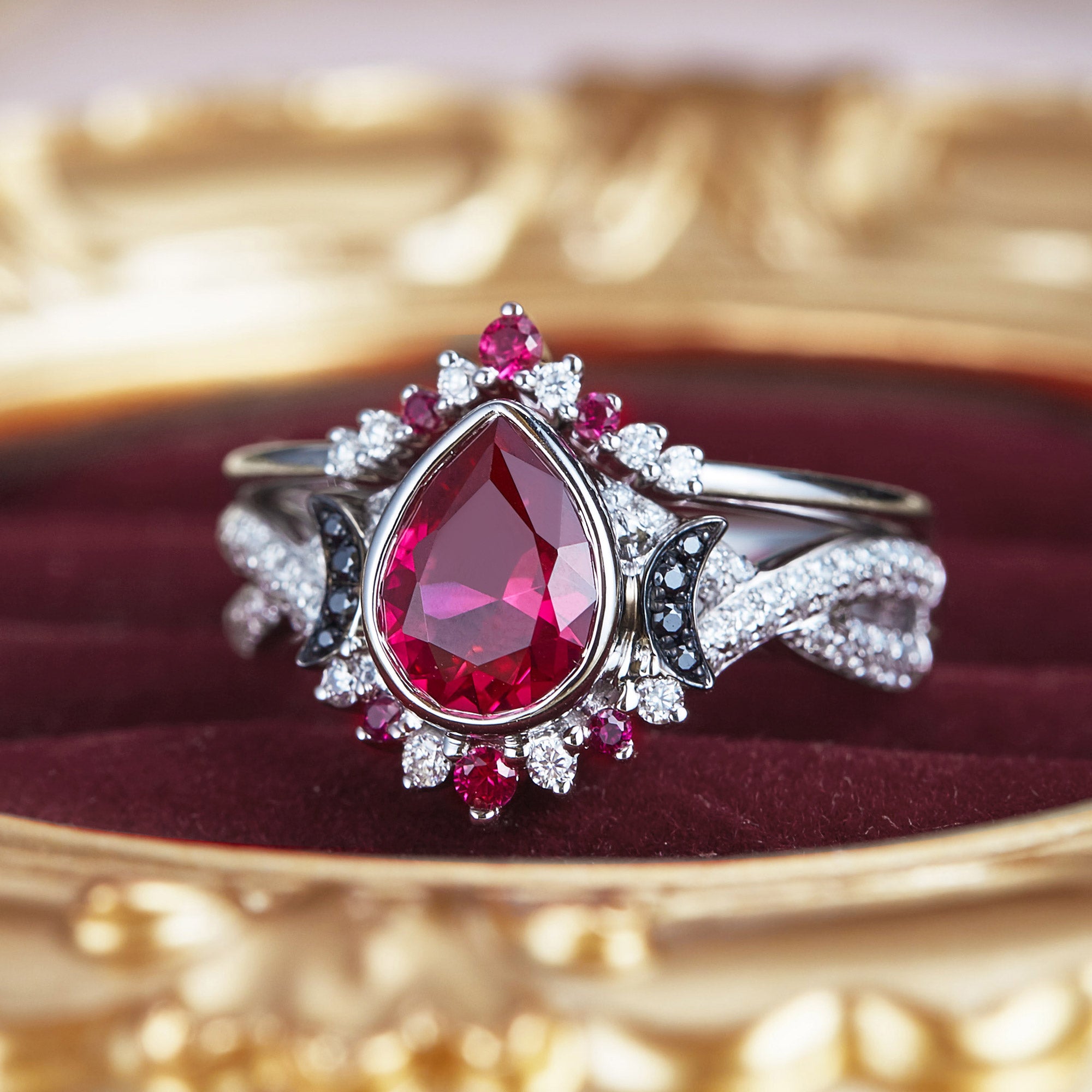 Crescent Moon | Infinity Pear Cut Lab Ruby 'Dark Rose' Engagement Ring Set 2pcs