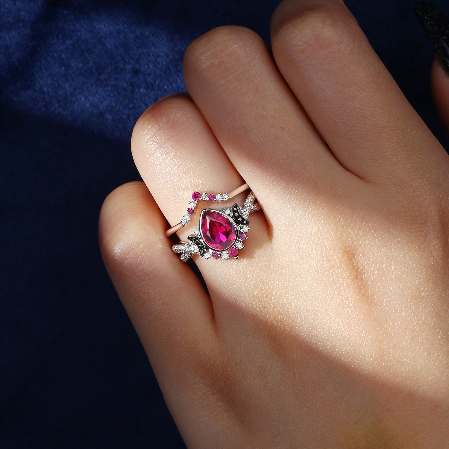 Crescent Moon | Infinity Pear Cut Lab Ruby Engagement Ring Set 2pcs- Dark Rose