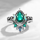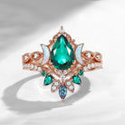 Pear Cut Lab Emerald Engagement Ring Infinity Ring Vintage Style Cluster Moon Wedding Ring Set 2pcs