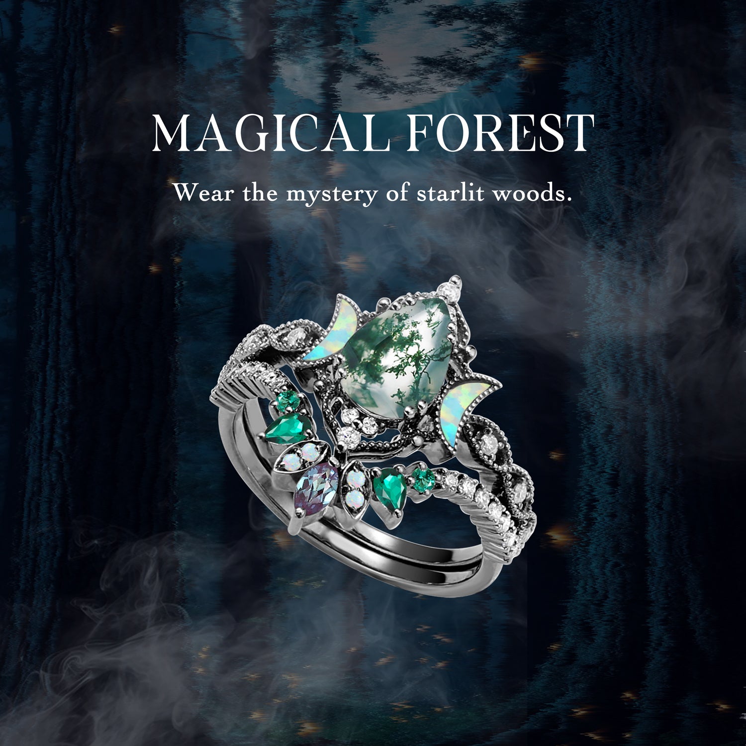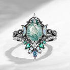 Crescent Moon | Pear Cut Moss Agate 'Ultra Galaxy' Lab Opal Engagement Ring Set 2pcs
