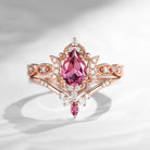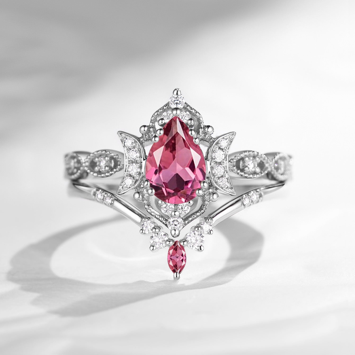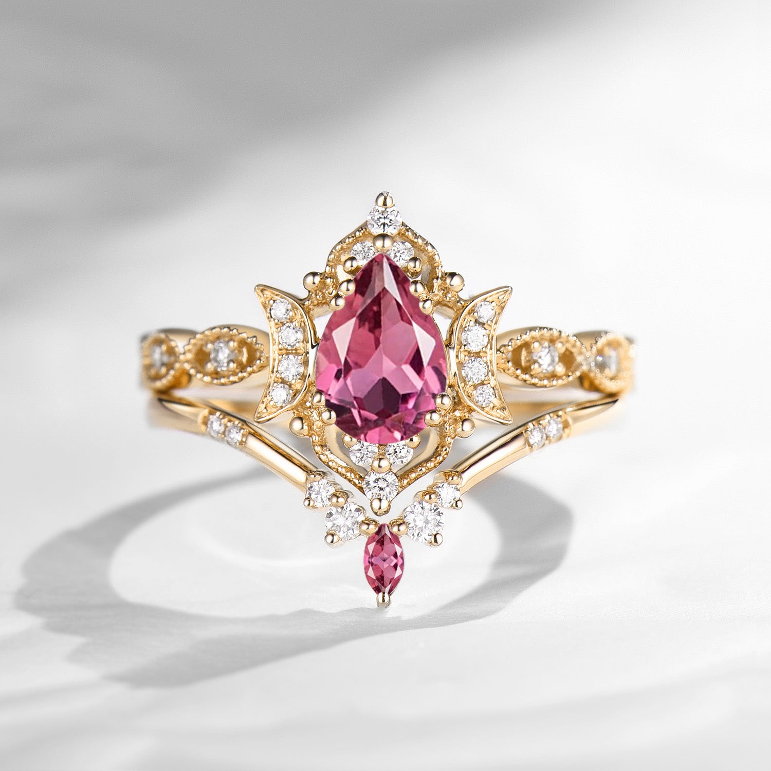 Crescent Moon | Pear Cut Natural Pink Tourmaline Engagement Ring Sets 2pcs - Luna