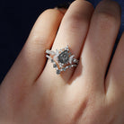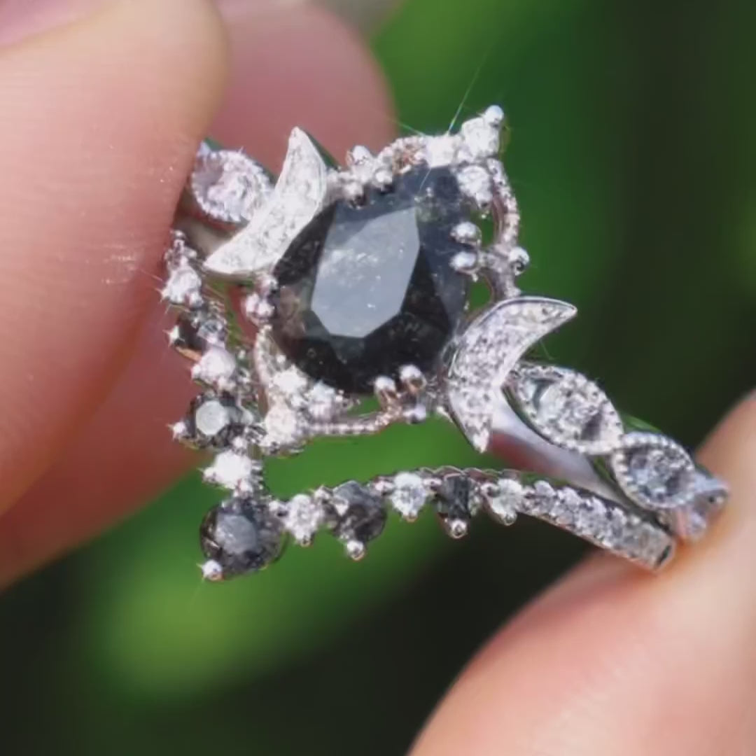 Moon Engagement Ring White Gold Black Rutilated Quartz Ring Set 2pcs Crystal Ring Crystal Engagement Ring Pear Shaped Salt and Pepper Ring