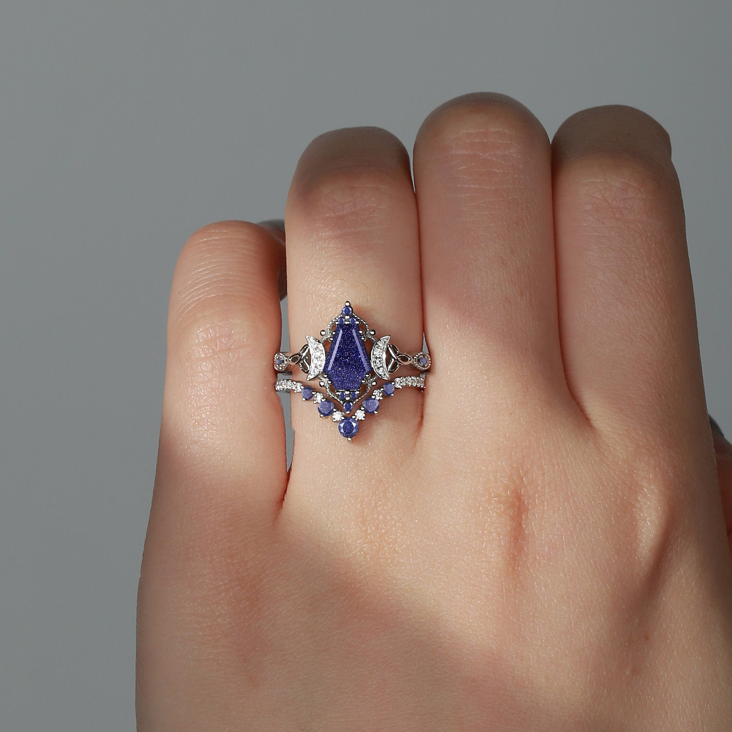 Crescent Moon | Unique Coffin Cut Blue Sandstone Infinity Engagement Ring Set 2pcs Vintage Cluster